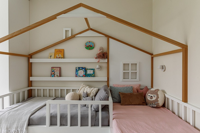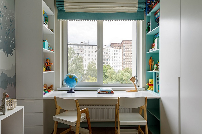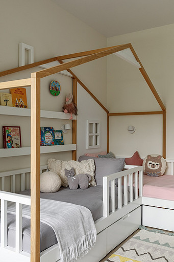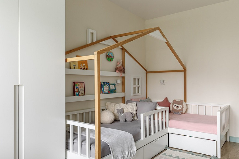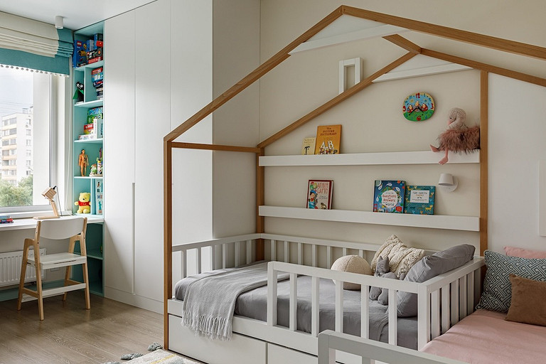 - Мебель: кровати, стол и системы хранения — столярное производство Kit for Kid, стеллаж ИКЕА, стулья «Фабрика 38»
