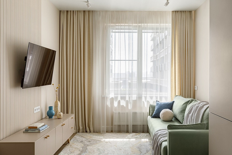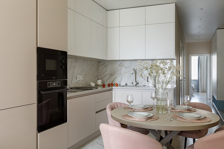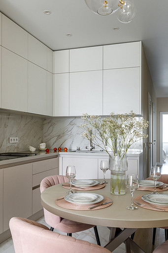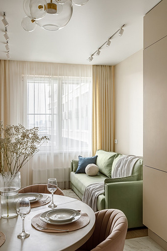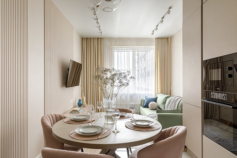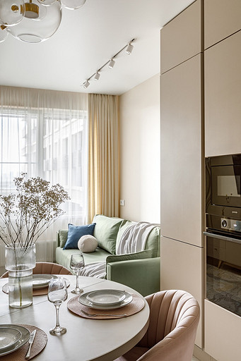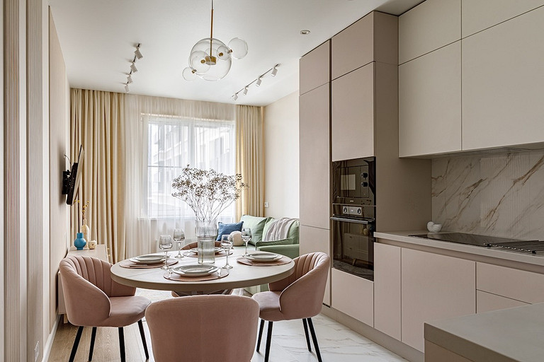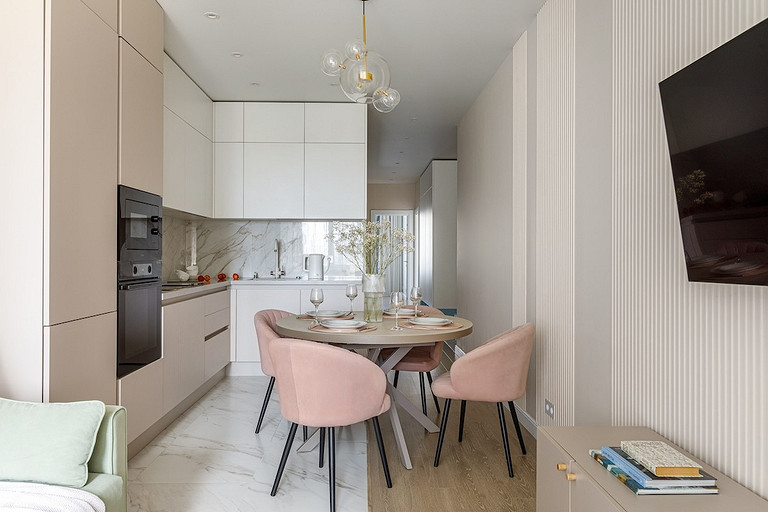 - Мебель: кухня «Мария», диван Pushe, стол Aero, стулья Woodville, тумба под ТВ divan.ru