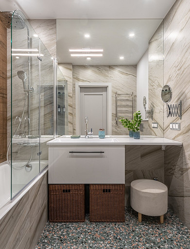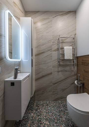 - Пол: плитка в прихожей и на кухне Wow, керамогранит в ванной и санузле DNA, паркет Tenfor