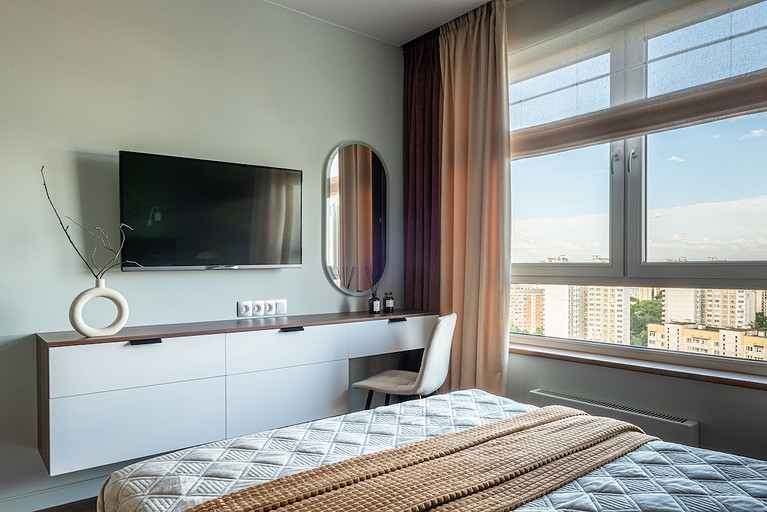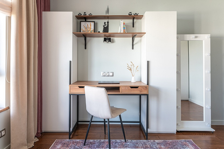 - Мебель: кухня «Кухонный двор», диван, придиванный столик, ковер, тумба под ТВ и рабочий стол в детской divan.ru, корпусная мебель в детской — фабрика «Вереск», раздвижные двери, тумбы, гарнитур в спальне, корпусная мебель и зеркало в прихожей сделаны на заказ