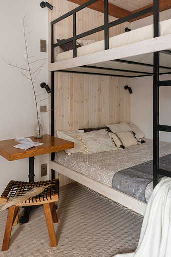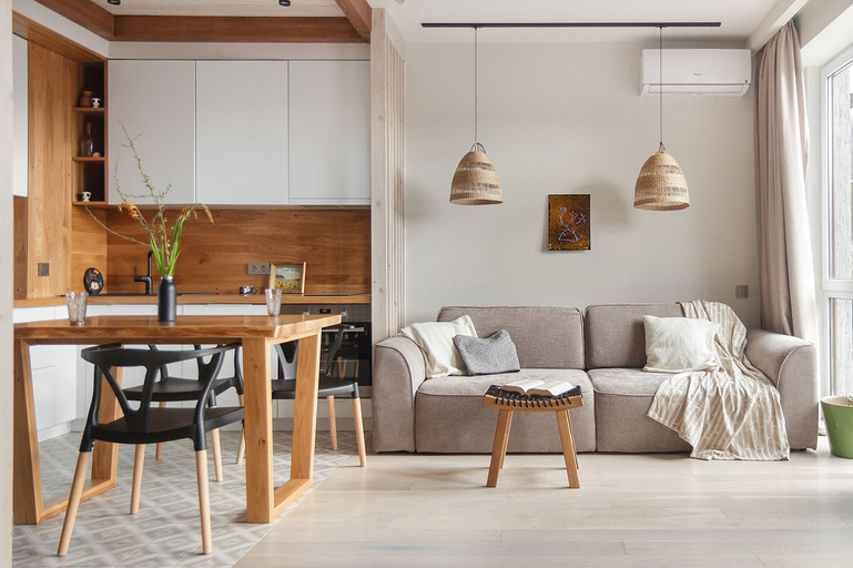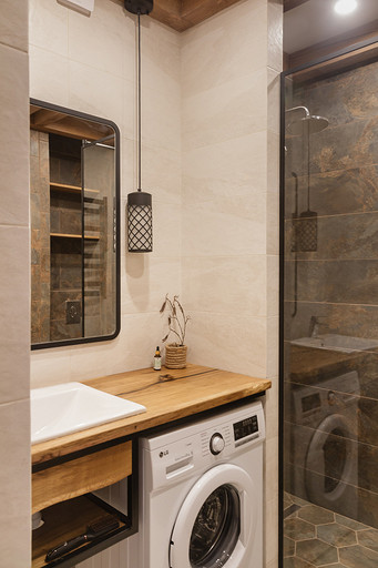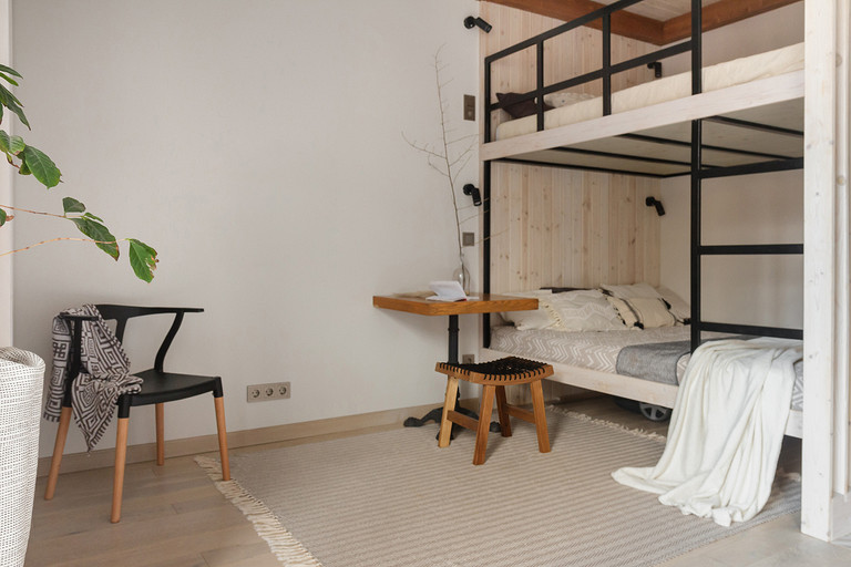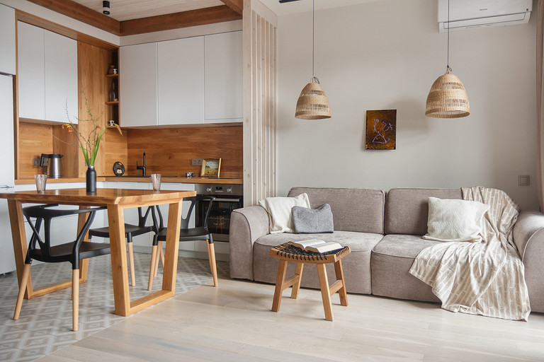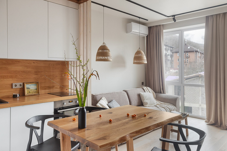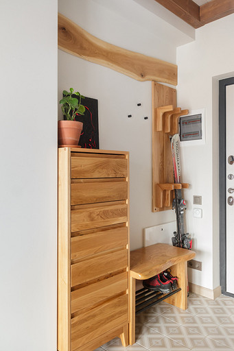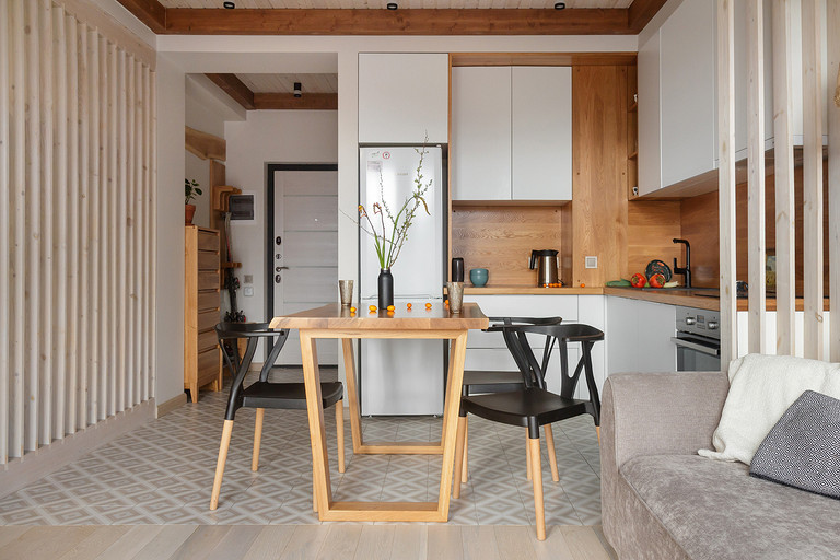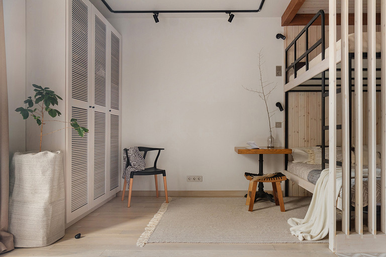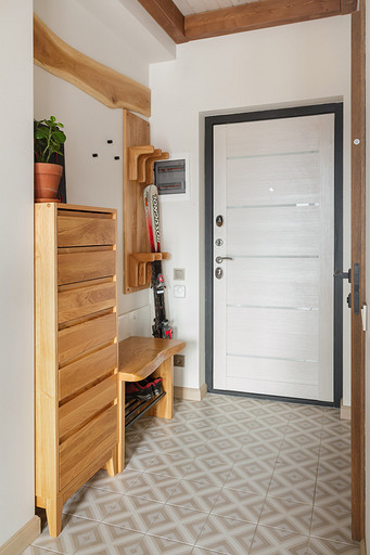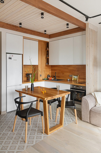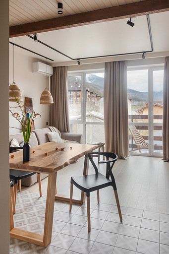Квартира в поселке Красная Поляна г. Сочи была спроектирована для отдыха семьи из 4-х человек. На небольшой площади в 40 м кв. удалось выделить все необходимые зоны: удобная кухня, гостиная, санузел, хранение вещей и 2-х ярусная кровать шириной 160 см. Светлые спокойные тона создают расслабленную атмосферу, а большое количество дерева в интерьере использовано в лучших традициях Красной Поляны. В проекте использована живопись краснополянского художника IvanVasyutin.
