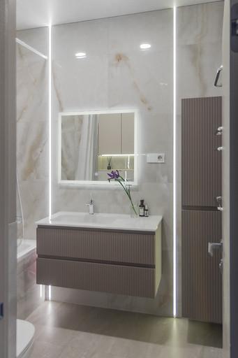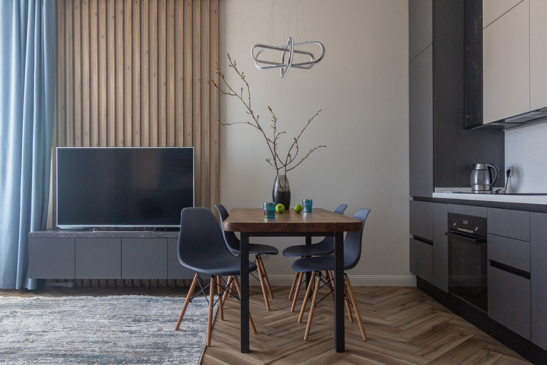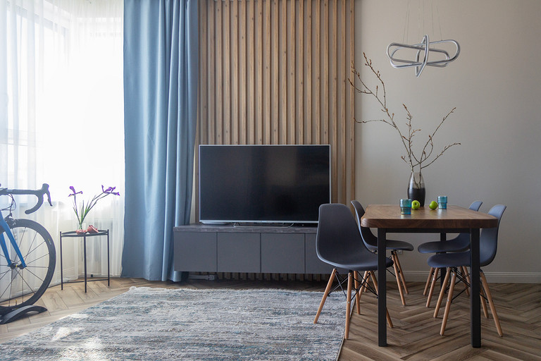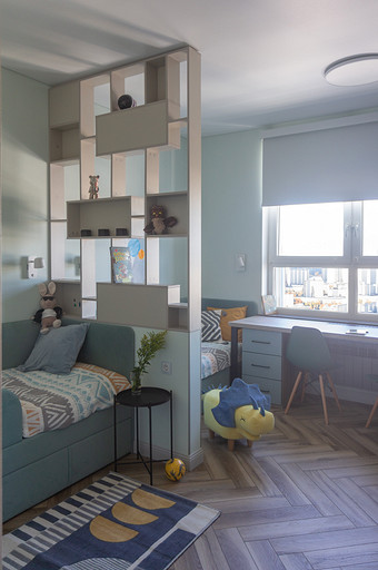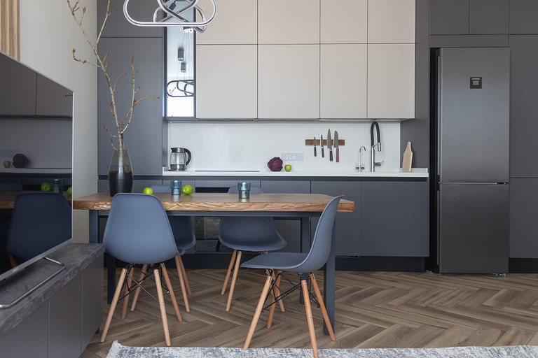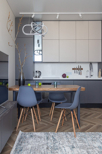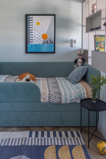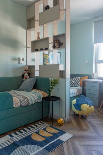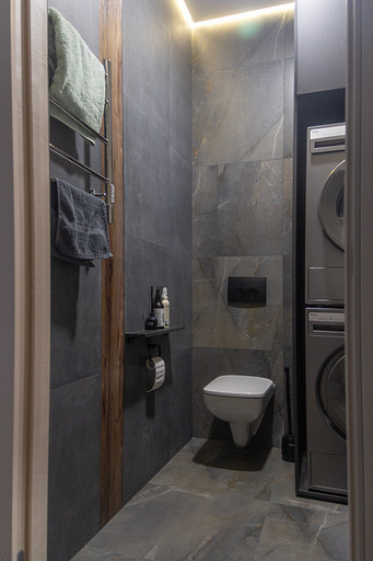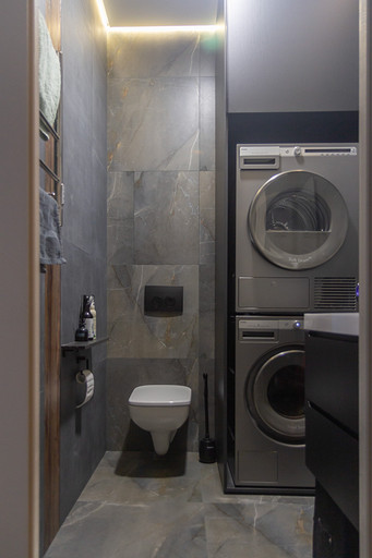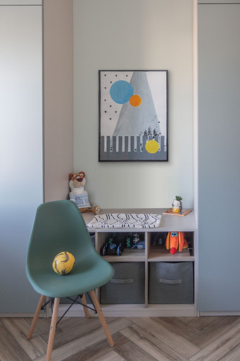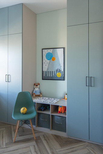 Проект создавался для семьи с 2мя маленькими сыновьями. Перепланировочных решений старались делать по минимуму, чтобы ускорить ход работ и снизить стоимость. В основном переделки касались санузлов и мест для хранения. Тут было важно сделать все как можно более функционально. Мы увеличили гостевой санузел, чтобы туда могли поместиться стиральная и сушильная машины и забрали небольшой кусочек стены ванной, чтобы со стороны прихожей установить галошницу. В кухне продумали мебель так, чтобы можно было оставить доступ к стоякам, сделав его незаметным. Из необычных решений — тут есть кофемашины в шкафу. Заказчикам очень нравится такой вариант. Детскую поделили на 2 части стеллажом- перегородкой и спланировали симметричные системы хранения для каждого из мальчиков.