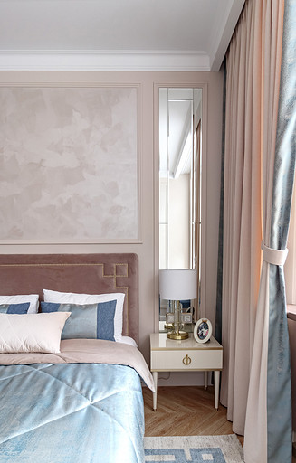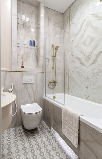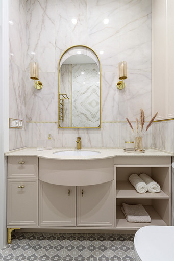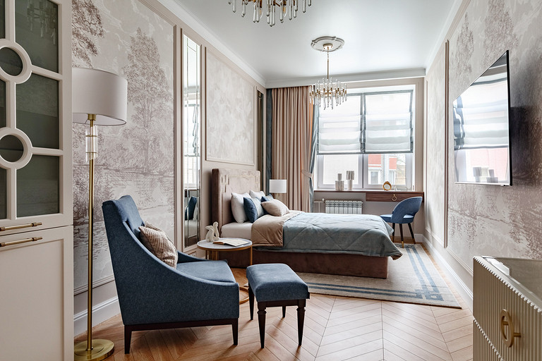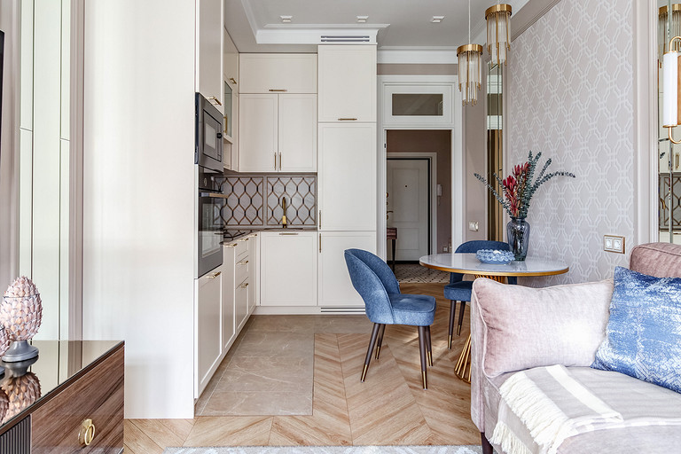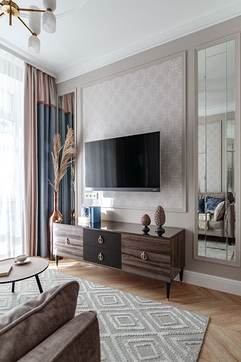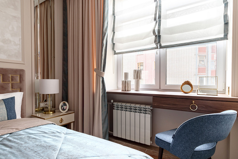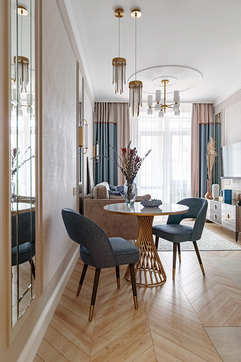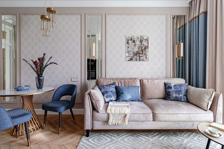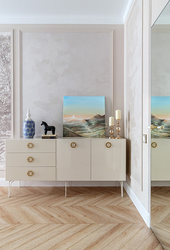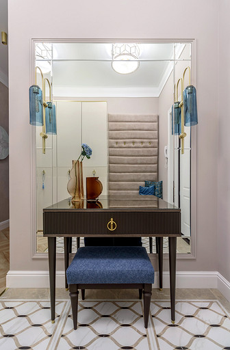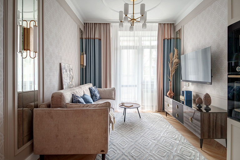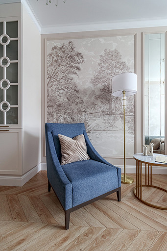 Интерьер квартиры создан для взрослой женщины, художника-модельера по мотивам американского неоклассицизма. Основной задачей была полная перепланировка пространства квартиры и замена функционального назначения помещений. Цветовая палитра интерьера сложилась в соответствии с психотипом заказчицы: бежевый, коричневый, золотой и от голубого до синего. Большая часть мебели и отделочных материалов в интерьере представлена брендами российского производства, что положительно сказалось на бюджете реализации. Основная часть предметов мебели выполнена по эскизам дизайнера, что позволило эффективно использовать каждый см площади и точно отразить образ, харизму, тактильные и цветовые предпочтения заказчицы. В итоге интерьер получился очень похожим на свою хозяйку, у них случилось слияние.
