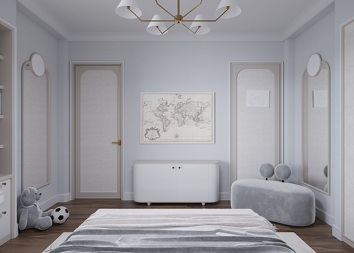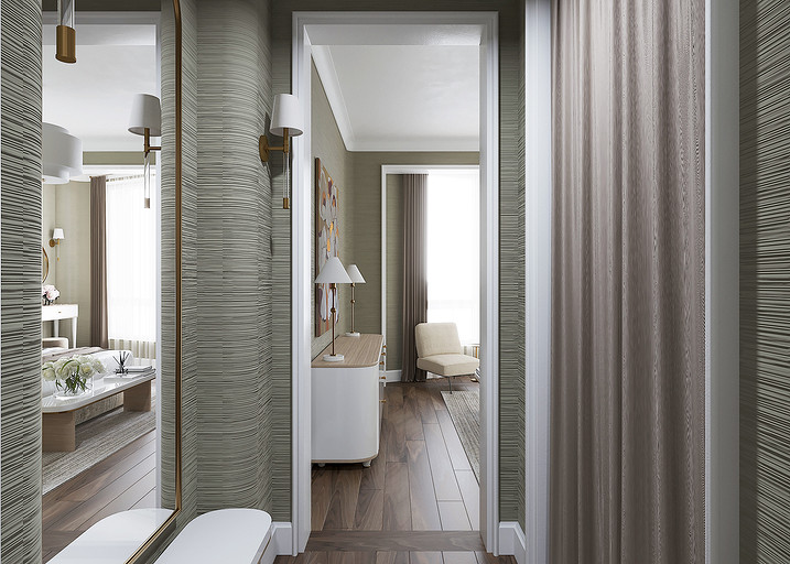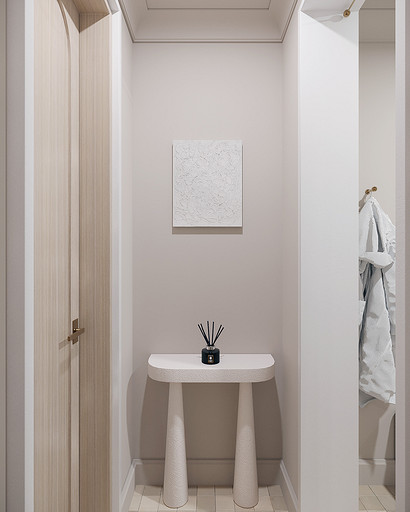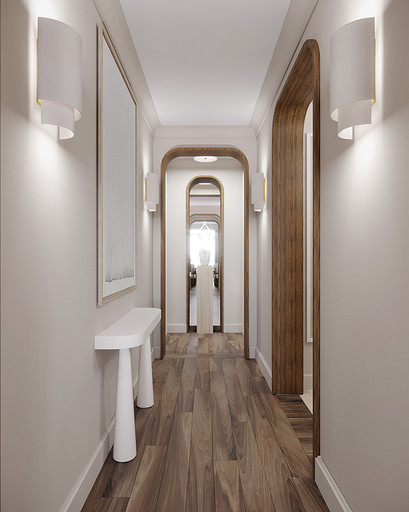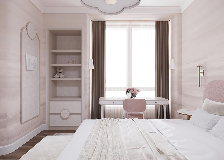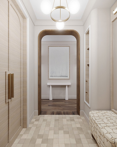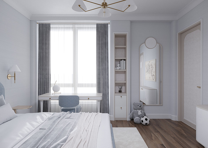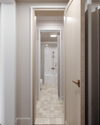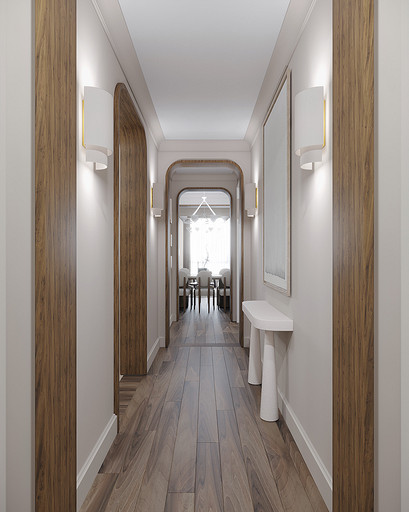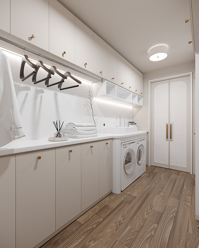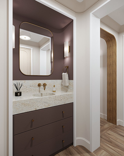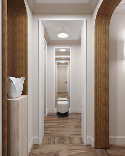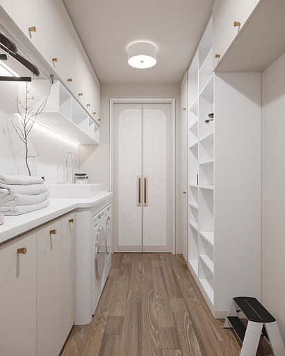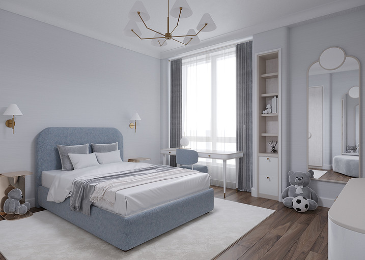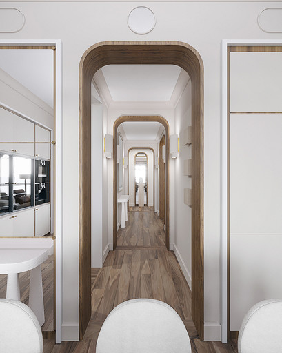 Квартира для семьи из четырех человек в ЖК Аэробус (Москва). Над внутренней архитектурой пришлось поработать, чтобы выровнять и гармонизировать пространство. В итоге на довольно большой площади удалось максимально эстетично и комфортно разместить все необходимое — две отдельные детские комнаты, мастер блок, светлую гостиную с зоной отдыха, кухню-столовую и очень удачно расположенную проходную хозяйственную комнату. Приватная и общественная зоны разнесены, также как и детская и взрослая зоны. Нестандартное, но очень удобное решение — открытый умывальник — поскольку ванная комната детского блока выполняет функцию гостевого санузла, то зону с раковиной я вынесла в открытое пространство, чтобы гости не проходили вглубь ванной комнаты к приватным детским раковинам.