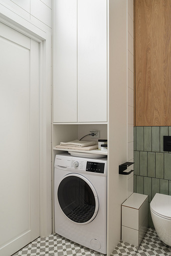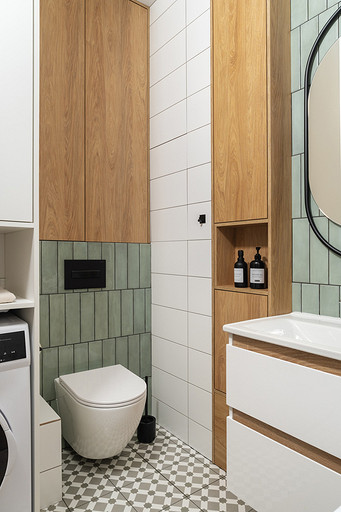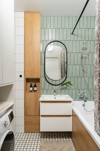 - Стены: белая плитка от застройщика, шалфейная плитка Kerama Marazzi