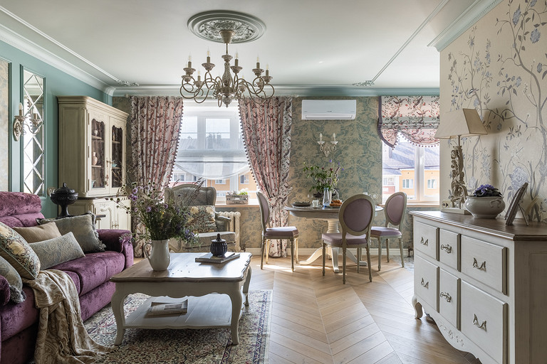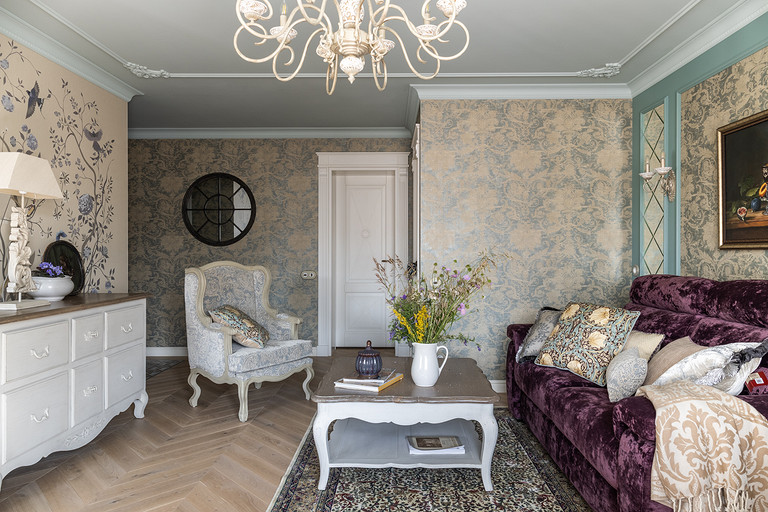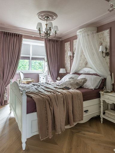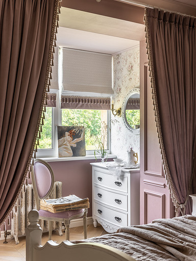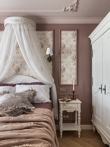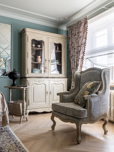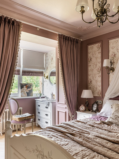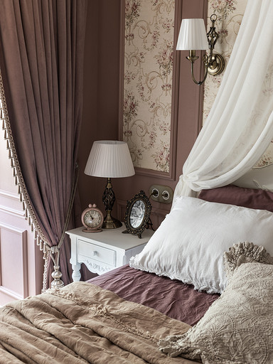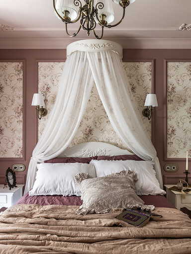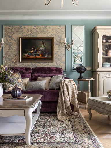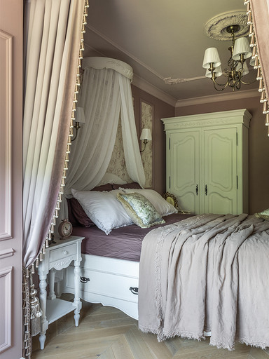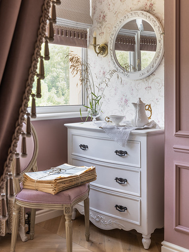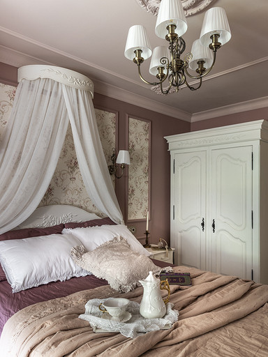 Интерьер сделан для женщины бальзаковского возраста, дети которой выросли и разъехались, а ей хочется пожить для себя в французских интерьерах периода Мадам Бовари. Это ранняя осень в жизни женщины, спокойная и умиротворенная в оттенках теплого заката.