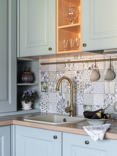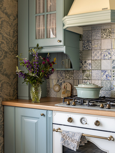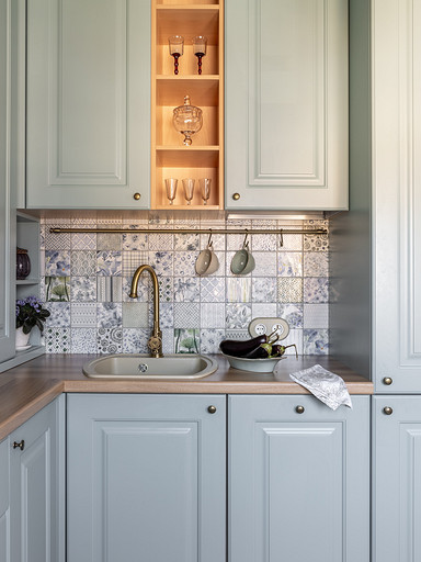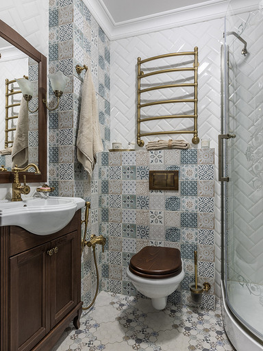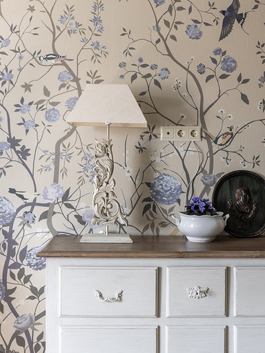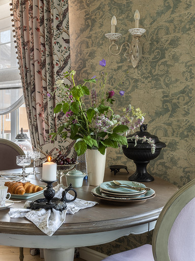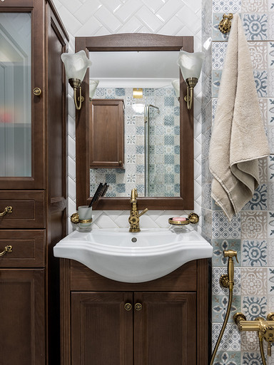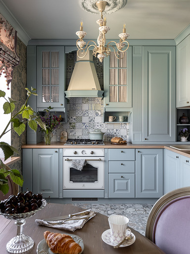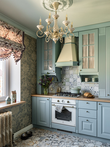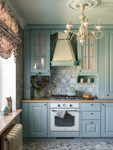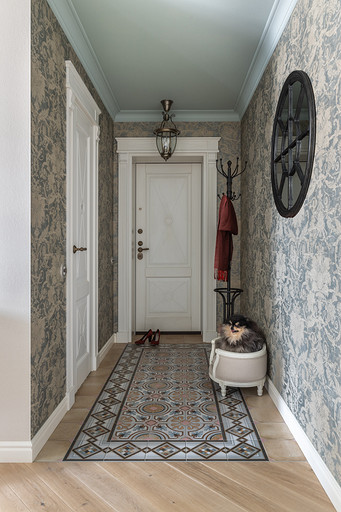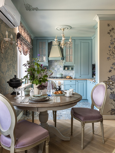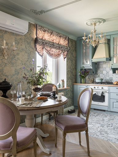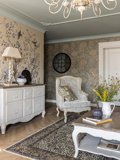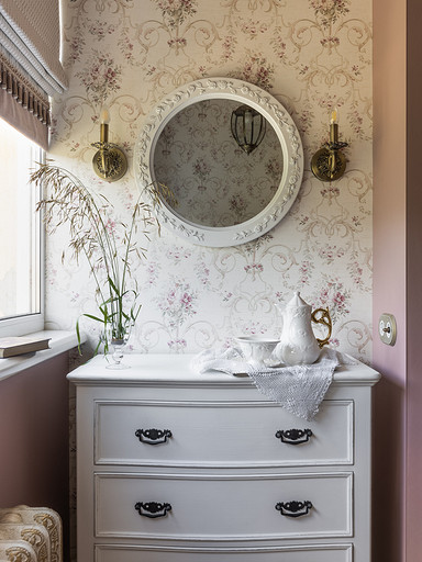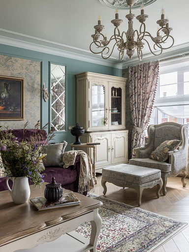 Интерьер сделан для женщины бальзаковского возраста, дети которой выросли и разъехались, а ей хочется пожить для себя в французских интерьерах периода Мадам Бовари. Это ранняя осень в жизни женщины, спокойная и умиротворенная в оттенках теплого заката.