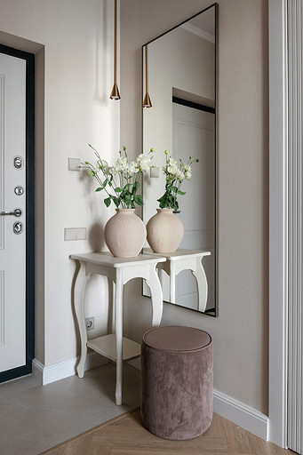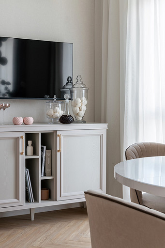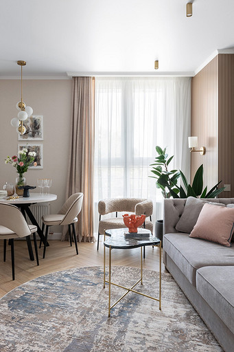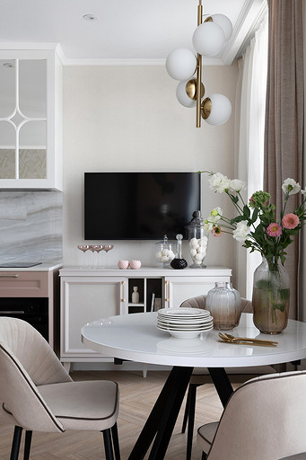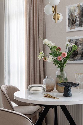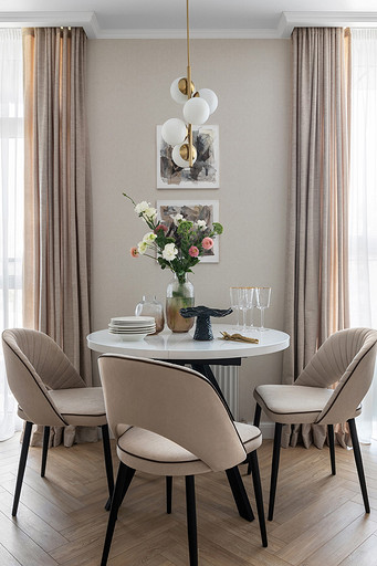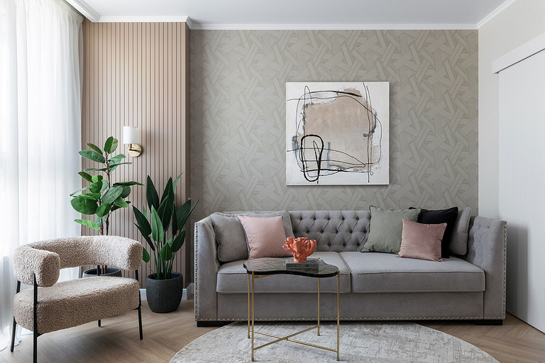 - Декор: диптих «Отражение мысли» над столом — Елена Лагерфельд, черная фруктовница на столе и подсвечник на 5 свечей «Коралл» на журнальном столике — Анастасия Ткачева