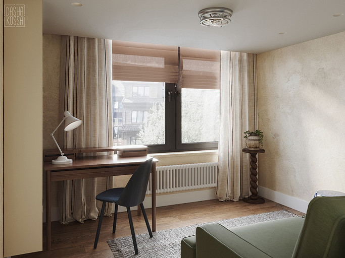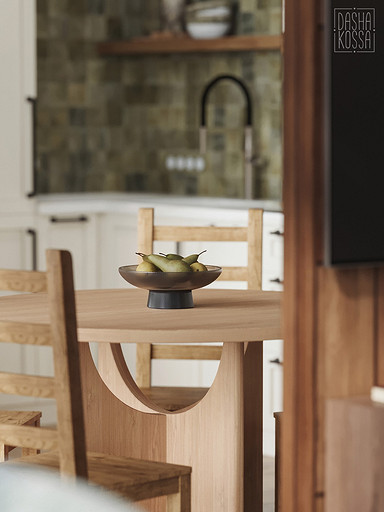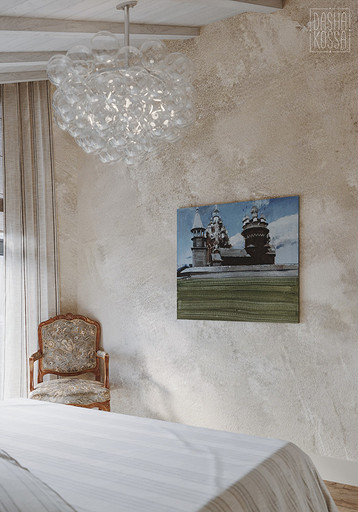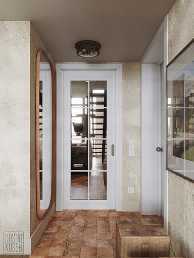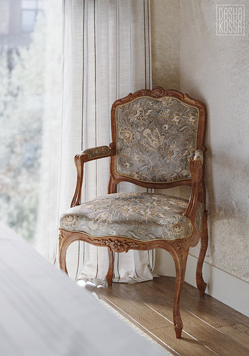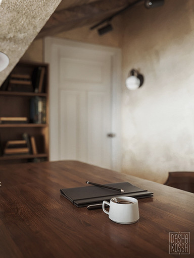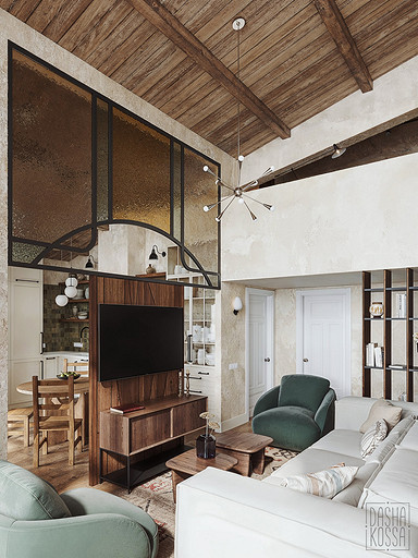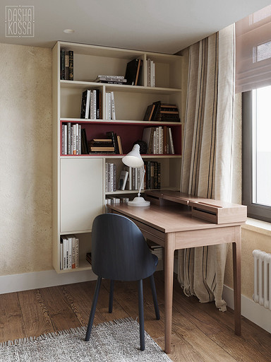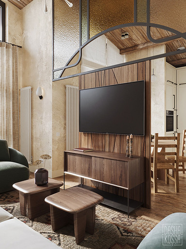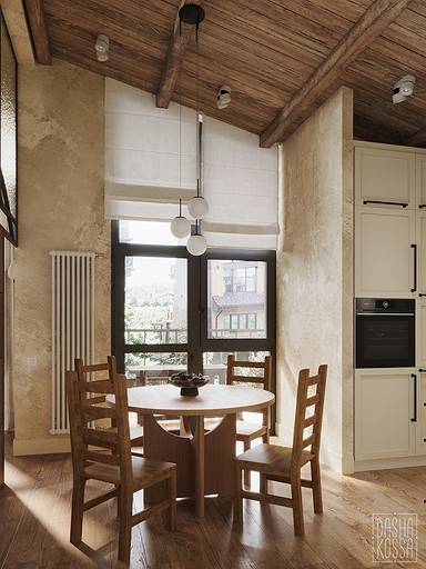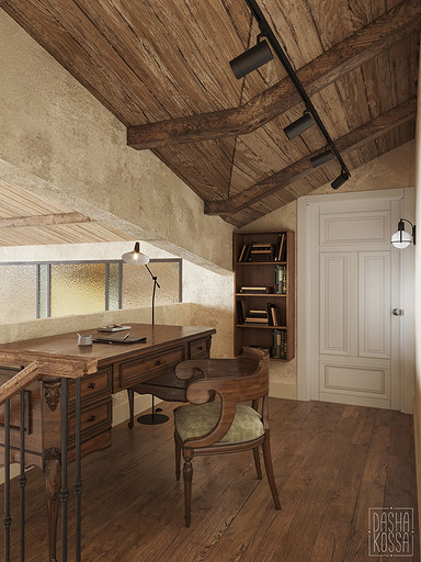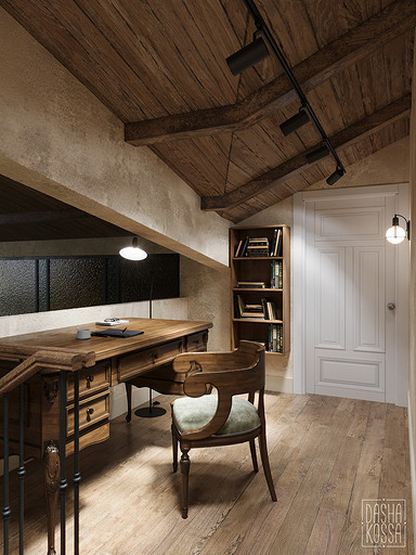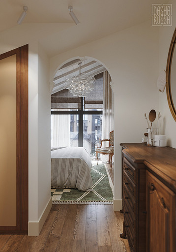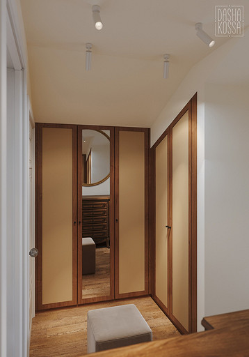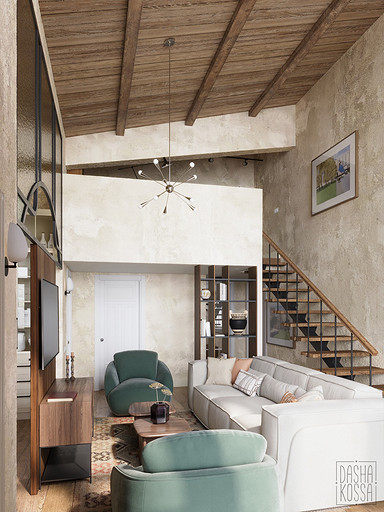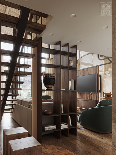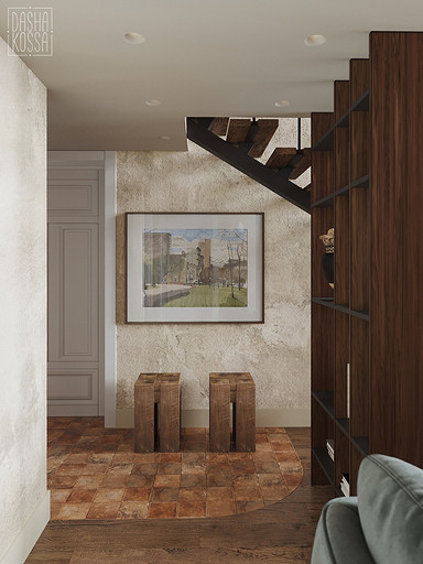 Данная квартира расположена в закрытом ЖК на Западе Москвы. В исходных данных квартира была на последнем этаже малоэтажного дома в стиле шале. Идейное содержание проекта предусматривает создание дополнительного уровня, 2 этажа внутри самой квартиры и разделение этажей на зоны: общественную, и организацию в ней перетекающих друг в друга помещений общего пользования на первом этаже: прихожая, гостиная, кухня со столовой группой в центре, гостевая комната со своей гардеробной и ванной комнаты, и зону приватную на втором этаже, состоящую из открытого кабинета на балконе, спальни, гардеробной комнаты и просторной ванной. Эстетическое наполнение строится на стремлении заказчиков к простоте, натуральности деревянных поверхностей и других текстур и материалов, ощущении открытого пространства и воздуха в нем.