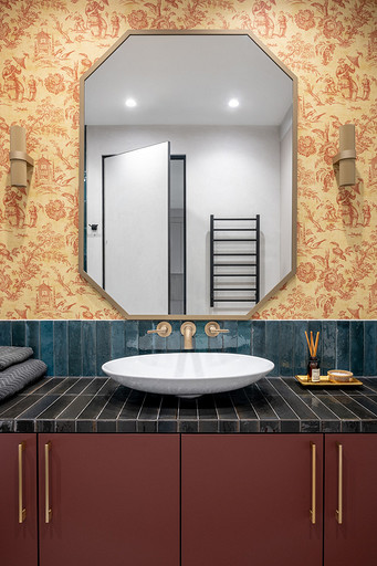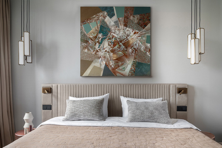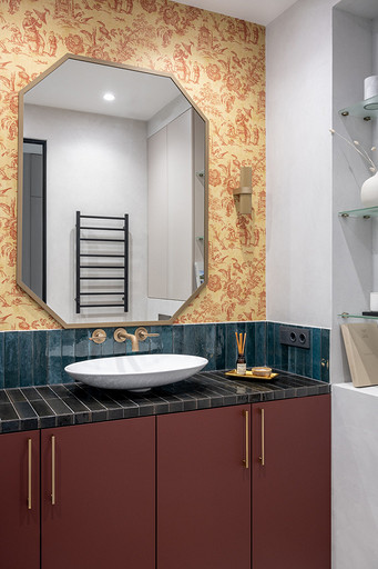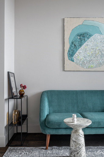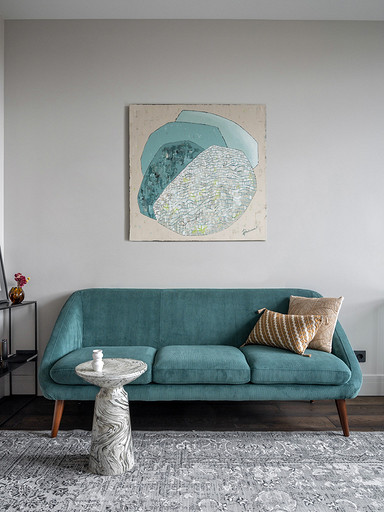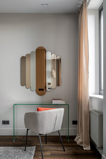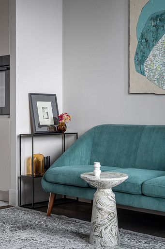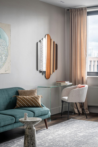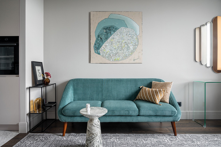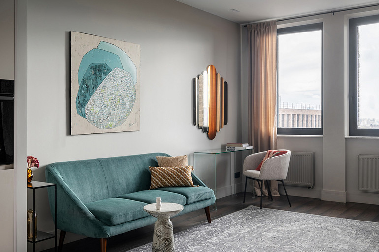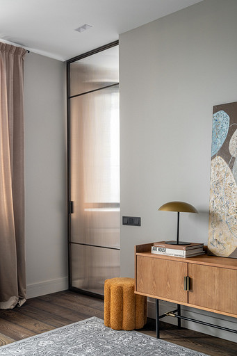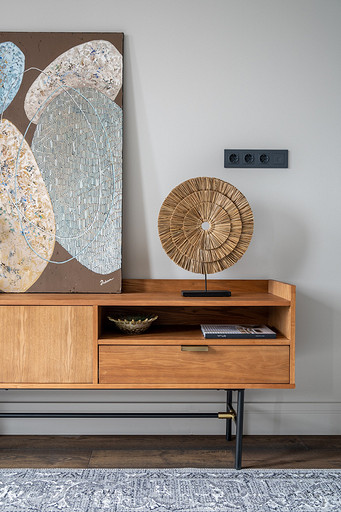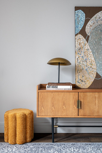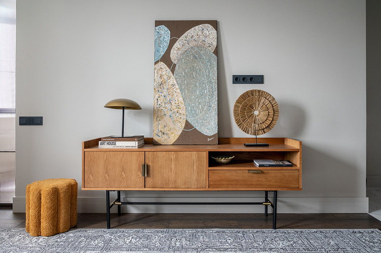 - Декор: керамика Maria Kesler, круглая ваза из желтого стекла — советский винтаж, картины над диваном и на тумбе — Дарья Дмитриева, графика на консоли у дивана и на стене — Виктор Паномаренко, все картины из галереи Smart Gallery