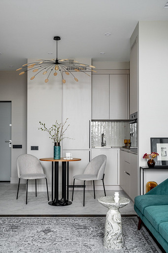 - Освещение: точечные потолочные светильники Maytoni, люстра над столом La Redoute, настольная лампа Barcelona Design