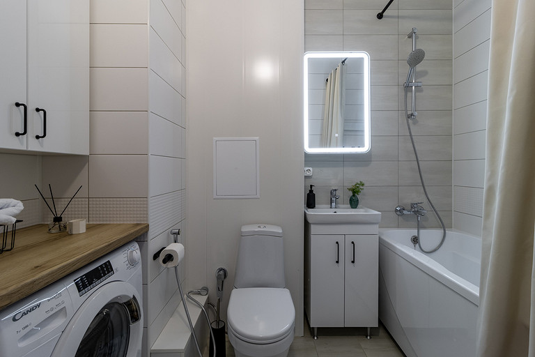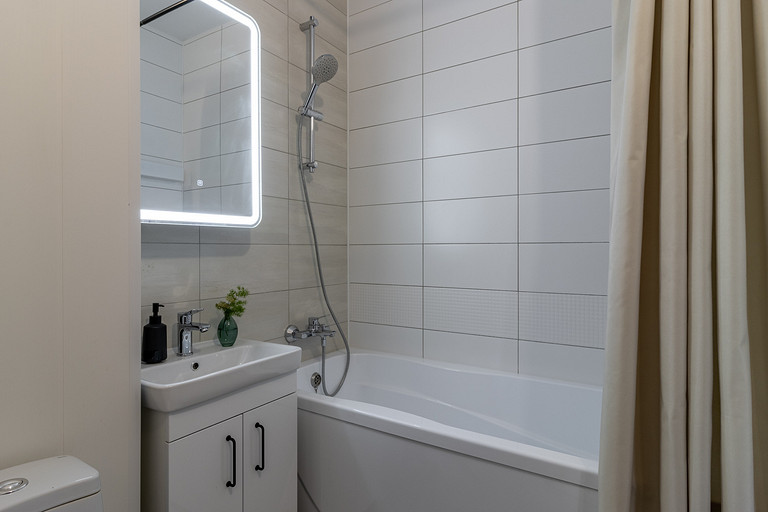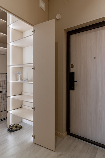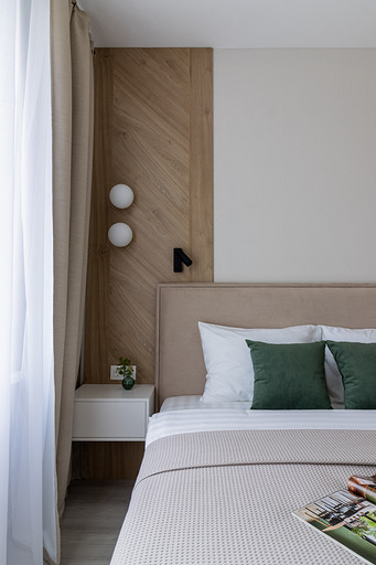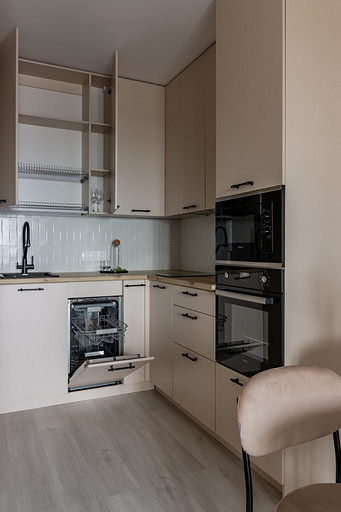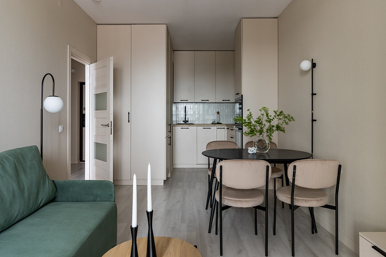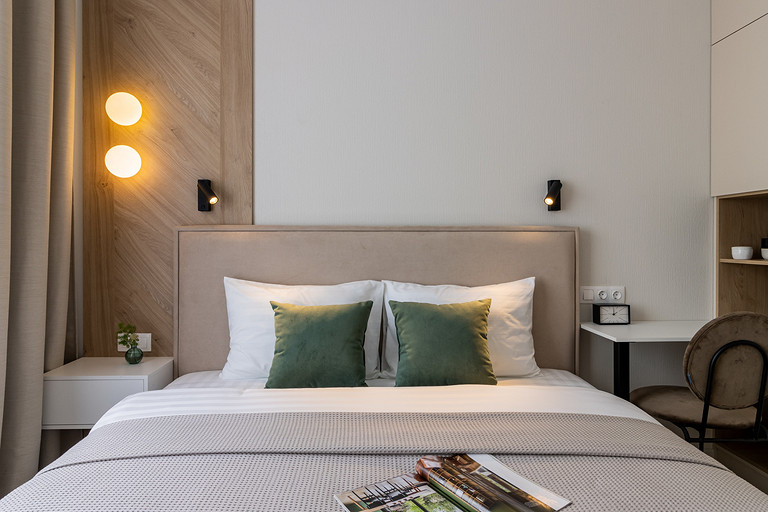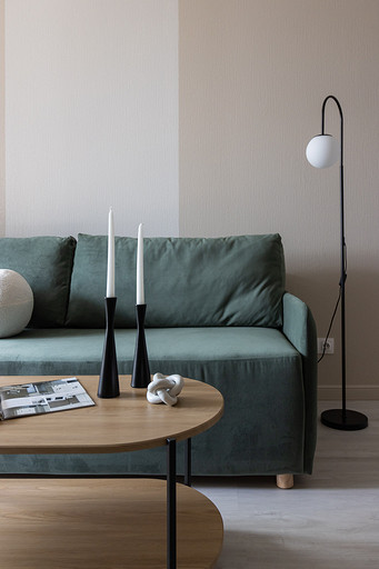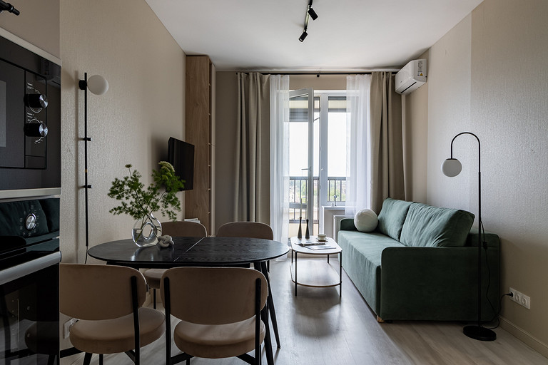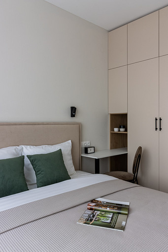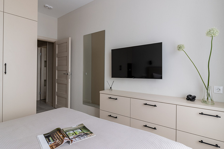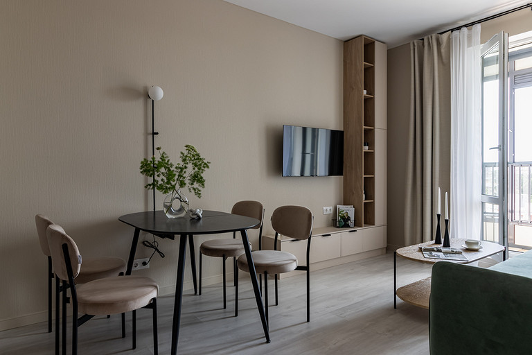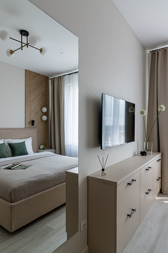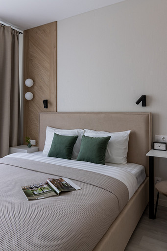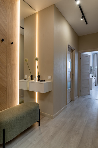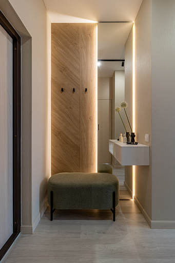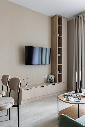 Моя заказчица поставила задачу разработать интерьер для собственного проживания, но в ближайшие несколько лет квартира будет сдаваться в аренду. Квартира с отделкой от застройщика, которую пришлось доработать для комфортного расположения розеток и подсветок. Необходимо было предусмотреть большое количество мебели и мест хранения вещей. Я предложила нейтральную цветовую гамму с добавлением дерева в корпусной мебели и небольшим количеством зеленых акцентов. В интерьере использовано много светильников, которые позволяют создавать разные сценарии освещения, чего так часто не хватает при готовой отделке от застройщика.