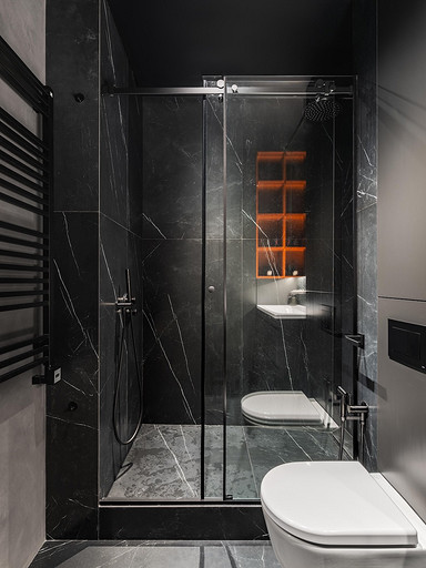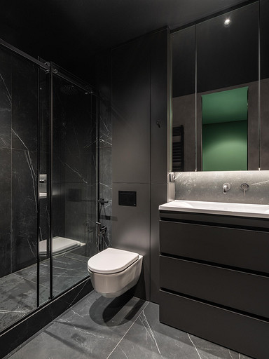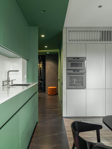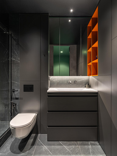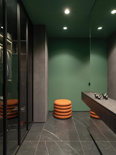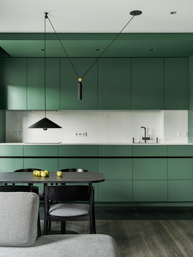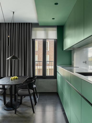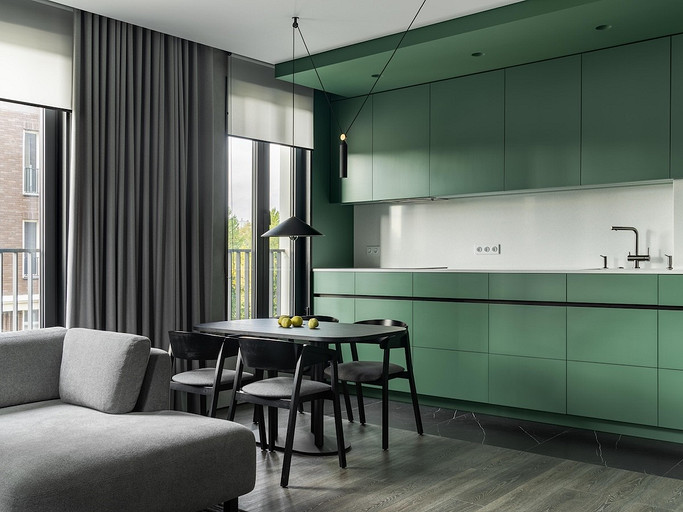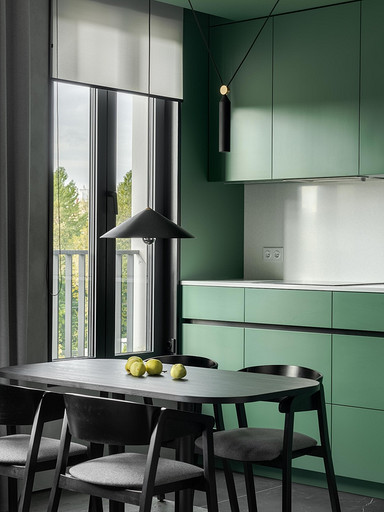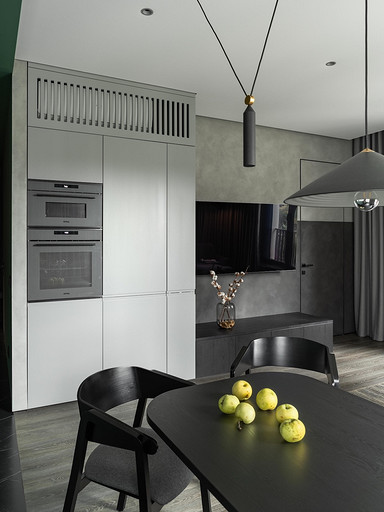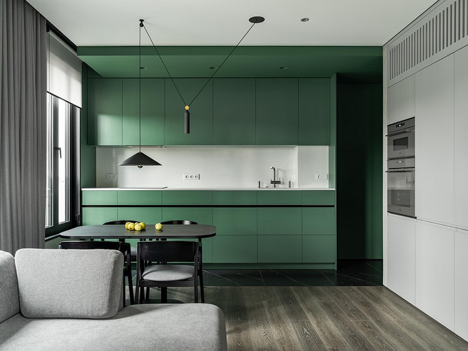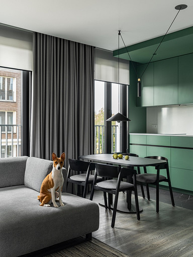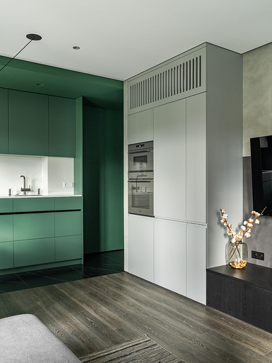 В интерьере сочетали нейтральные серые оттенки с достаточно активным изумрудным цветом и терракотовыми деталями. Читать далее...