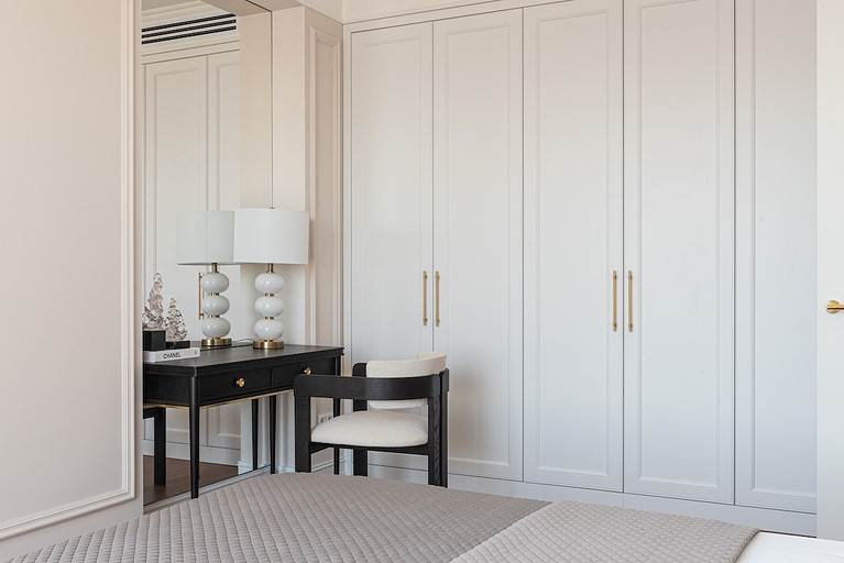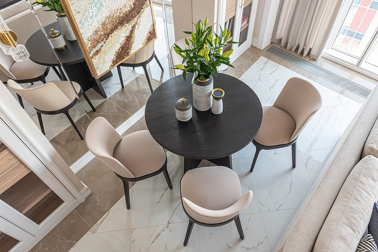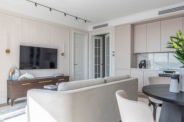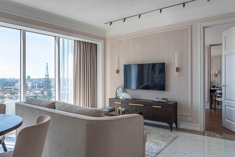 - Мебель: столярные изделия на заказ John Green, диван «Лавсит», кровать Goodbeds, стол, тумбочки, консоль в спальне, кресло в спальне — Jomehome, стулья Casa Mobile, ТВ-тумба Dantone Home