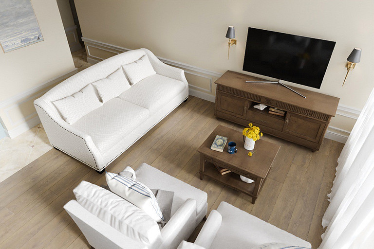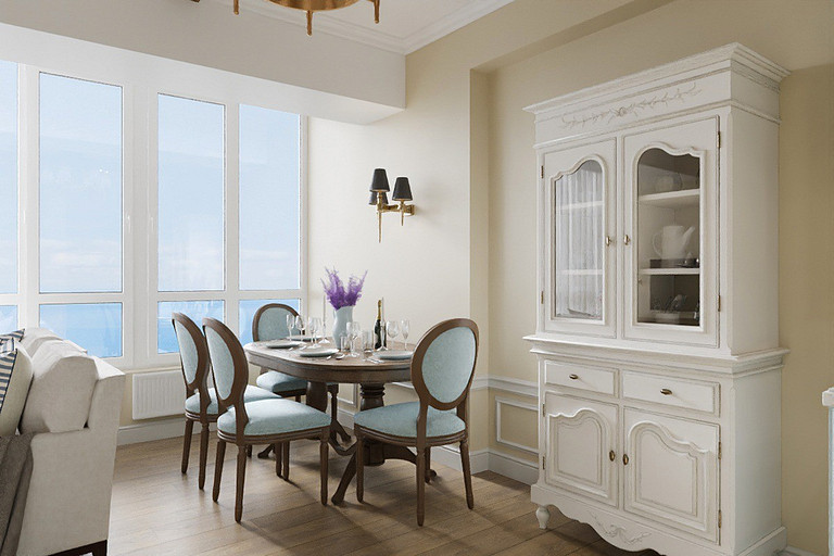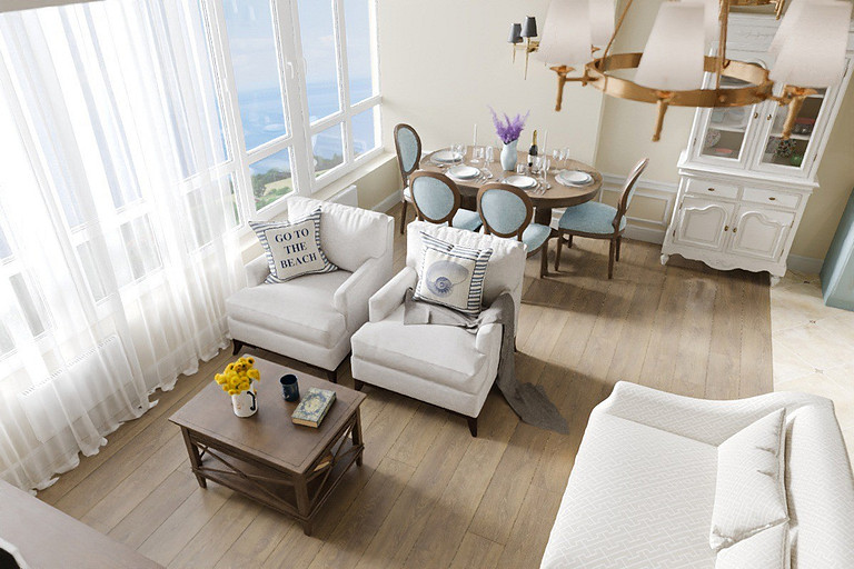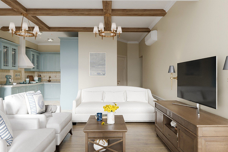 Апартаменты 91 м2 с двумя спальнями и кухней-гостиной для отдыха семьи и сдачи в аренду. Проект выполнен в смешанном стиле. Присутствует классический и средиземноморский стили.