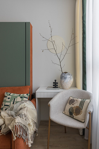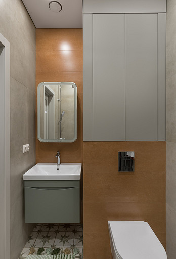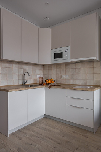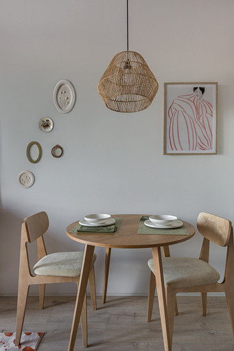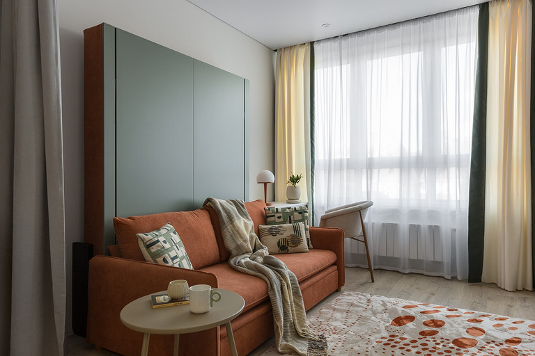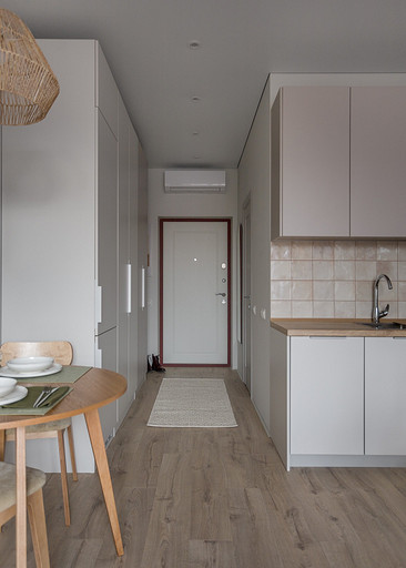 Студия 25 кв.м в новостройке. Бюджет на проект от бетона до декора: 2,2 млн руб. Для проекта был выбран современный стиль с элементами бохо, который гармонично смотрится в природных тонах. Задача стояла выделиться на фоне других предложений на рынке и сделать продуманную и комфортную для длительного проживания квартиру. Несмотря на компактные размеры квартиры, удалось эффективно организовать множество мест для хранения, не жертвуя функциональностью других зон. Кухня полностью укомплектована всей необходимой техникой, включая стиральную и посудомоечную машины, а также предлагает достаточно рабочего пространства. Холодильник был удачно встроен в крайний шкаф коридора, освобождая место для спальни. Чтобы получить максимум от пространства, в качестве места для сна и отдыха был выбран диван-кровать-трансформер. Он позволяет сделать сон максимально комфортным, т.к. качество сна на полноценном матрасе существенно лучше, чем на обычном диване-кровати. В сложенном же виде не нарушается эстетика, что важно для студии, т.к. здесь нет отдельной спальни, и кровать может смотреться неуместно рядом с кухней и занимать драгоценные квадратные метры. Для создания приватности используется блэкаут штора между кухней и зоной отдыха, что особенно удобно для пар с разным режимом жизни. В углу разместился небольшой рабочий стол с удобным креслом, который одновременно выполняет функцию прикроватного столика ввиду компактности пространства. Искусство: Марина Маликова и Анастасия Грик. Фотограф: Софья Мирная