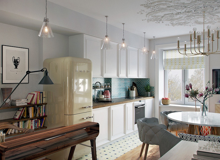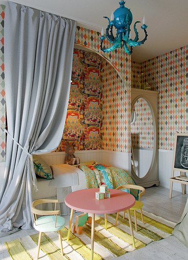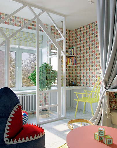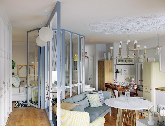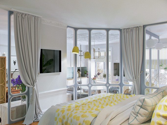Посредством подиума и перегородки удалось выделить пространства спальни, кухни и гостиной, найти место для мини-кабинета. Также в квартире появилась изолированная детская, были сохранены все вспомогательные помещения. Читать далее...