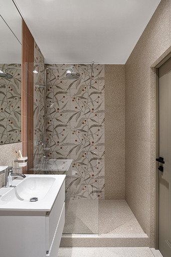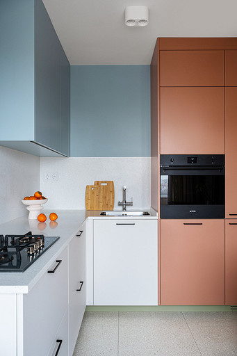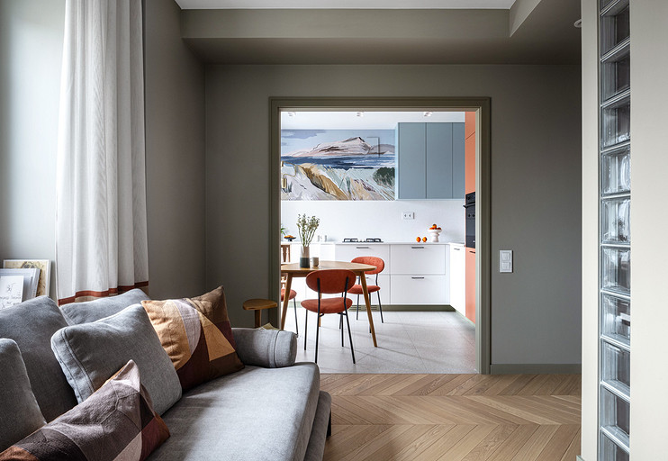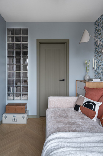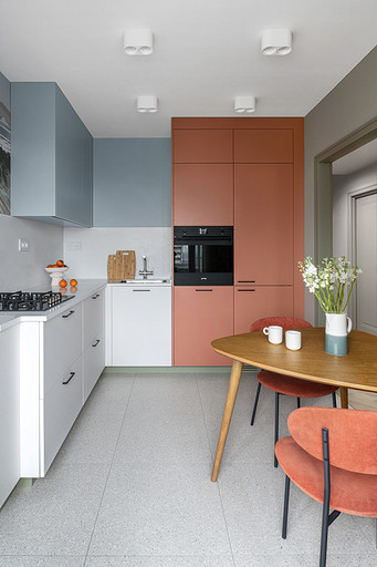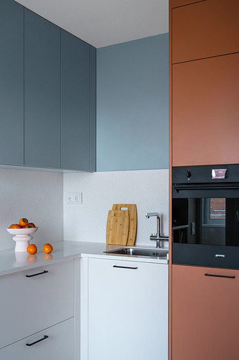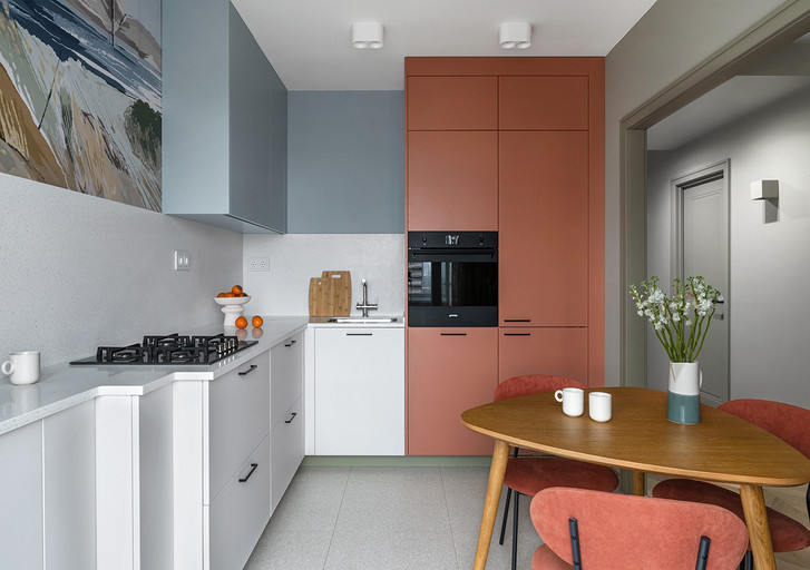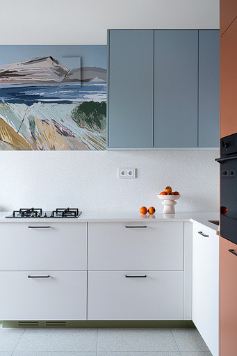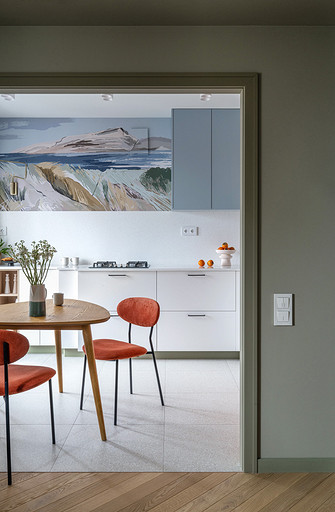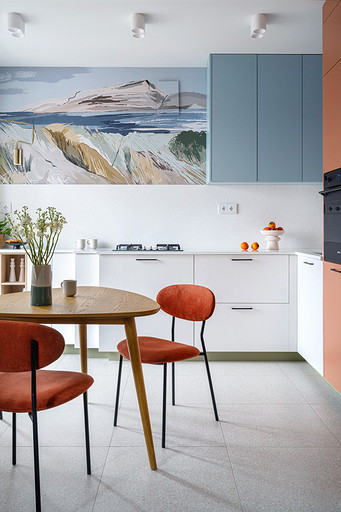 - Стены: краска Swiss Lake, фреска на кухне Fun House, плитка в ванной Kerama Marazzi