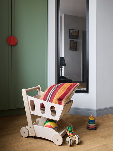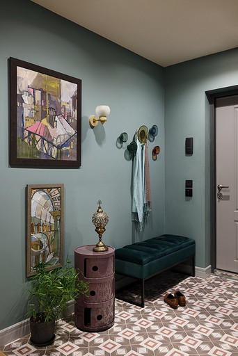 - Мебель: круглая тумба и крючки для одежды Kartell, банкетка для обуви сделана на заказ