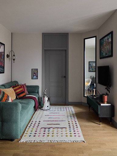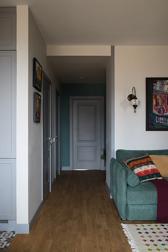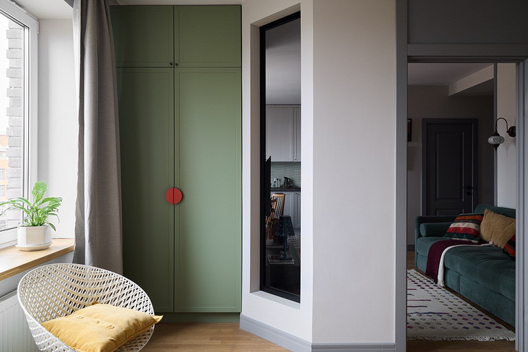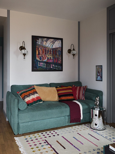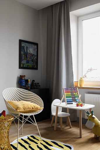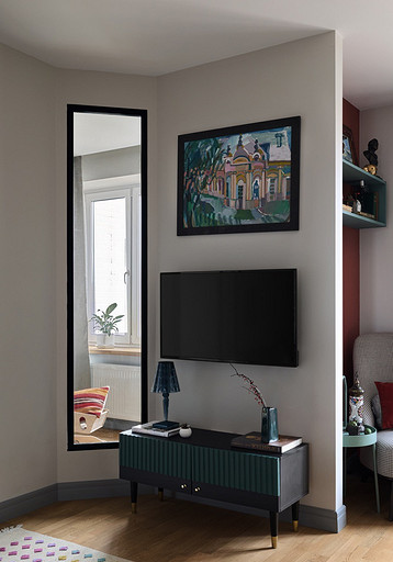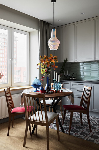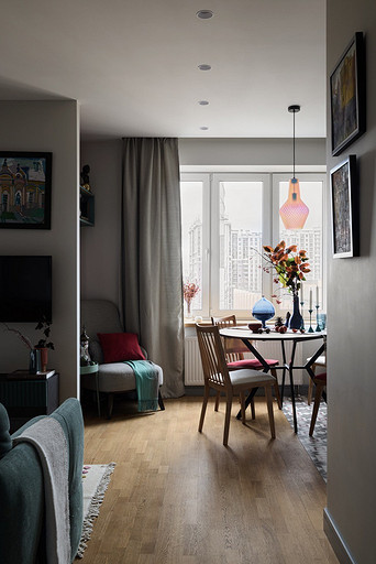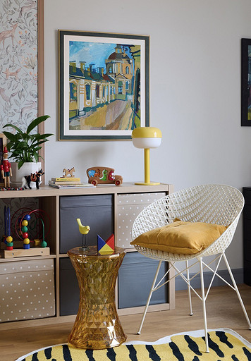 - Мебель: обеденный стол «ТУТ — столы и стулья» (на заказ), стулья — винтаж, Ганка ZMG Польша 1963 г., кресло и диван Prodivani, ТВ-тумба Nerestavraсiya (редизайн), журнальный столик ИКЕА