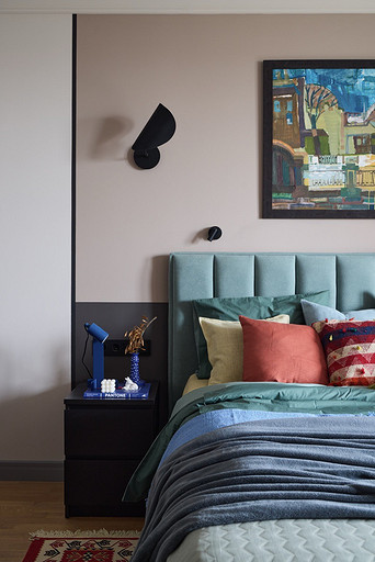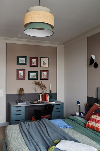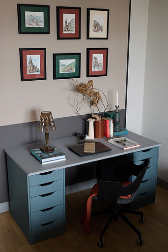 - Освещение: встроенные светильники и ридеры Maytoni, люстра и бра La Redoute, настольная лампа на рабочем столе Kartell, настольная лампа на тумбе ИКЕА