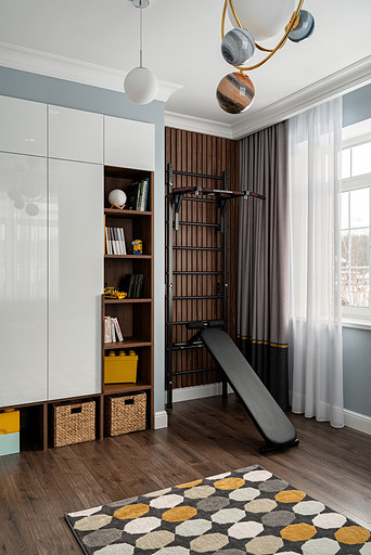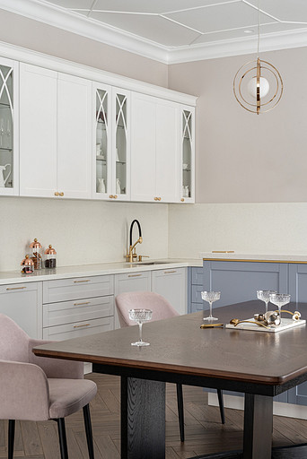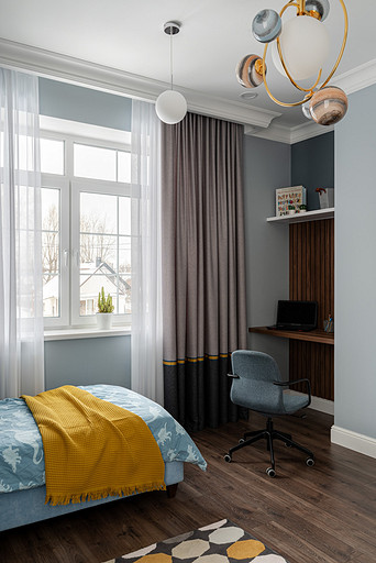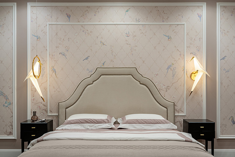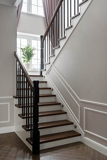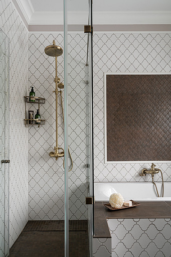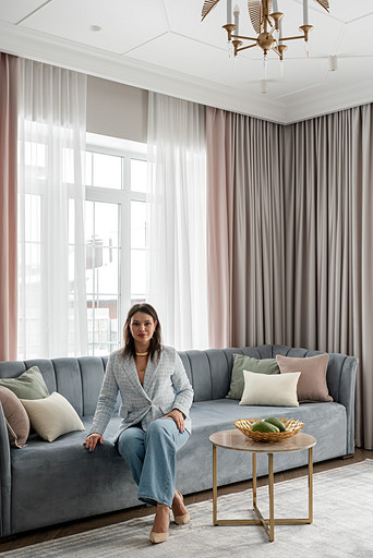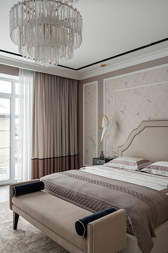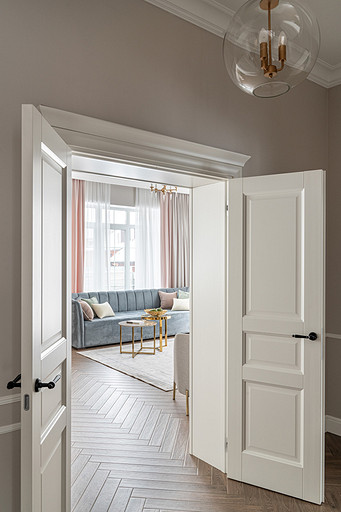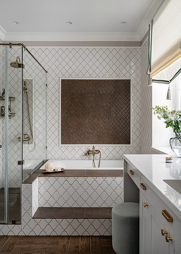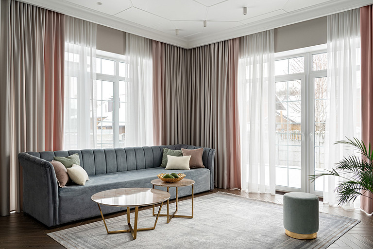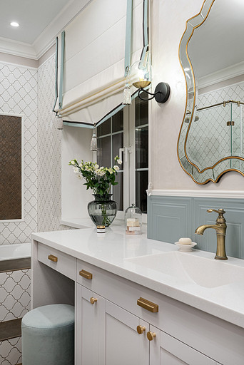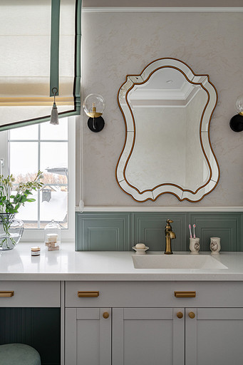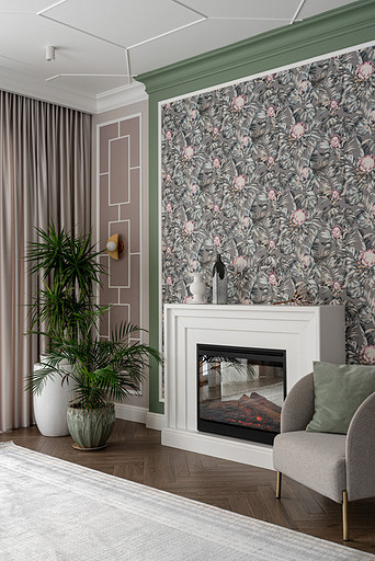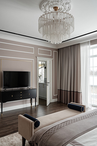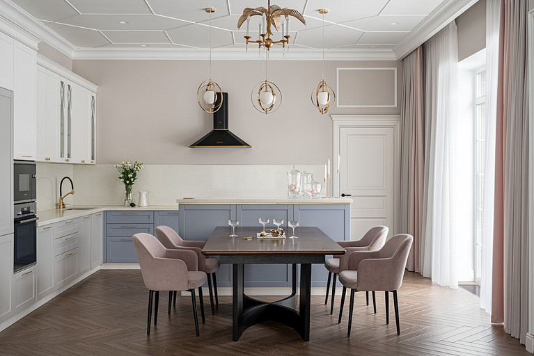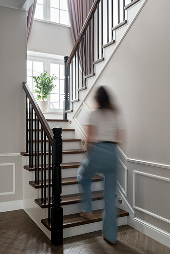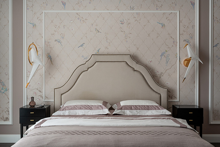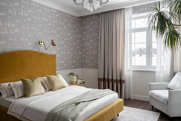 Для кого? Семья, где супруг, супруга, 2 мальчика. Жена домохозяйка. Супруг работает в продажах, иногда ходит на охоту. Активные, коммуникабельные, молодые, любящие все новое. Где? Объект в поселке в черте города Казань. Интерьер разрабатывался примерно 5 лет назад. Отснять удалось лишь в декабре 2023 года. Комплектация дома шла медленно. Хотелось дождаться максимальной реализации и завершенного вида. Интерьер под классику, мягкий, нежный, воздушный, теплый. Планировку незначительно меняли. Проемы переносили. Заходили на объект, когда дом строился еще. Не было окон, крыши, стены не полностью были возведены. Наиболее тяжелое помещение в разработке мастер-спальня. Много времени потребовалось на ее разработку и согласование. Клиентка в душе очень милая, нежная. Говорила, что если бы это не был дом семейным, то свою комнату она бы сделала в розовом цвете. Именно поэтому в мастер-спальне появился цвет стен с розовым оттенком. При этом есть строгие черные акценты. Мы их уравновесили и смягчили изящными золотыми вставками, тематикой флоры на панно за кроватью, дополнили светильниками в виде птиц. Также есть гостевая спальня с зайцами. Ее история такова, что эта комната, так скажем, свободного назначения. Но она безумно любима всеми и даже родителями хозяев дома. Миловидные зайцы в обоях российского бренда Лоймина приводят всех в восторг. Интересным решением является комбинация обоев с панелями по низу комнаты. А современный тон данному пространству задает цветовая гамма, где центром является желто-горчичная кровать. Каких-то мировых брендов тут не использованы. Интерьер выглядит дорого, но реализован из вполне себе доступных качественно подобранных материалов. Сложносочиненное пространство — ванная комната из мастер-спальни. Здесь клиенты полностью доверились. Не было каких-либо негативных моментов, вопросов спора. Этот санузел имеет легкий флер востока. Но в современным прочтении. Декоративная штукатурка на стенах с легким перламутром, плитка под арабеска. Здесь замиксовано 6 плиток совершенно разных брендов, форматов. Притом они прекрасно слились воедино. Зеркало необычной формы стало прекрасным центром зоны с раковиной. Его тонкая окантовке смотрится органично и прекрасно перекликается с керамогранитом коричневых оттенков. Чтобы элементы востока не смотрелись грузно, тяжело и несовременно, были выведены цвета в интерьер этой ванной комнаты. А именно- сложный оттенок бирюзового цвета и оттенки розового в штукатурке и в обрамлении над молдингов под потолком. Тем самым это помещение такой тонкой нитью ведет нас в интерьер мастер-спальни. Обилие различных комбинаций материалов. К примеру, санузел 1 этажа с круглым зеркалом это комбинация плитка +обои. Ванная комната, которая подробно описана выше, там краска, штукатурка, керамогранит. Камин в гостиной зоне собран из ГКЛ и молдингов. Орнамент из молдингов на потолке и растительные мотивы люстр в гостиной привлекают внимание.