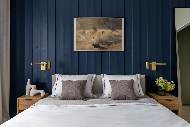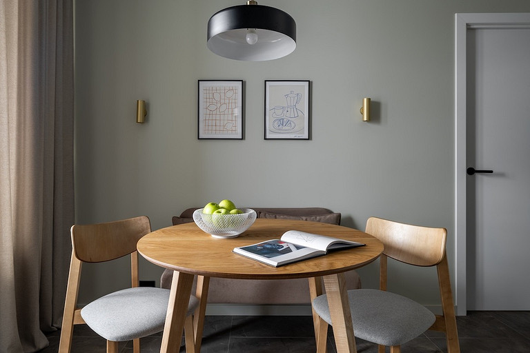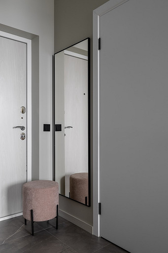 - Мебель: кухня и вся корпусная мебель Lemana Pro, кухонная столешница из ЛДСП, стулья Daiva Casa, кровать Moon Family, подвесная тумба в ванной Velvex, пуф в прихожей Hoff