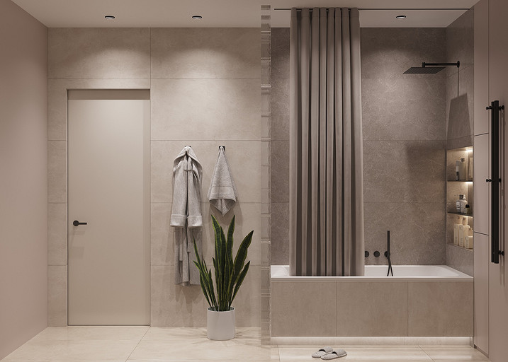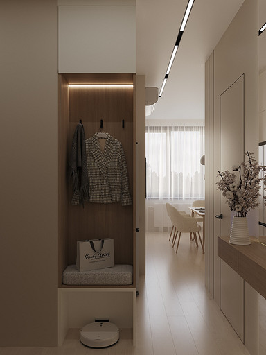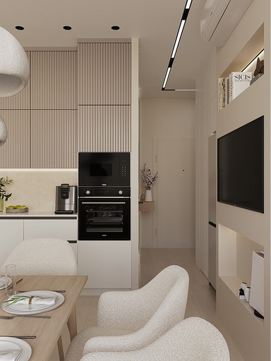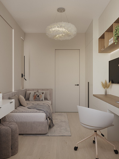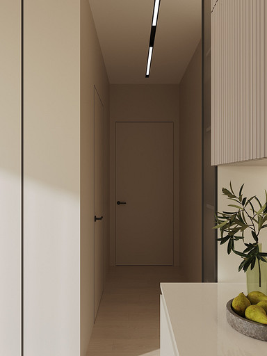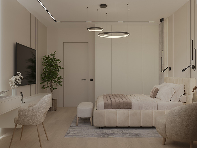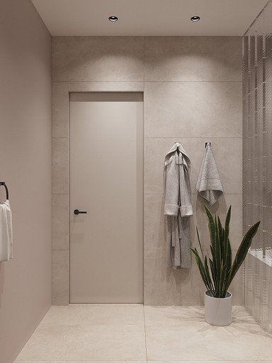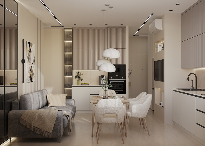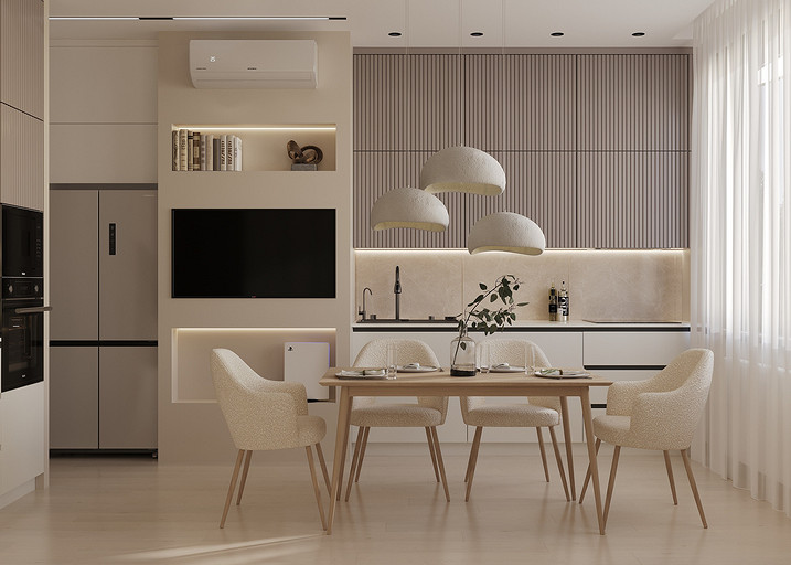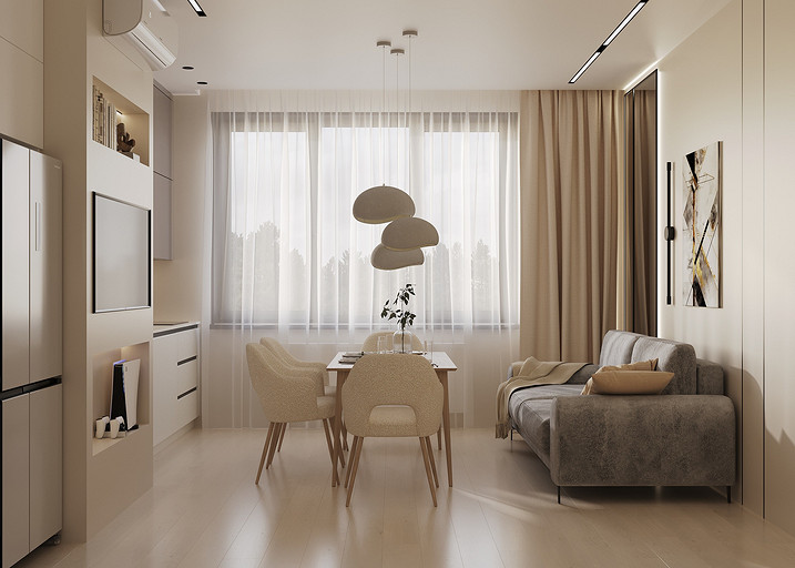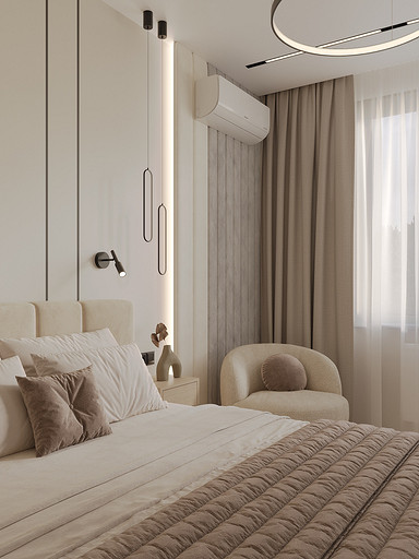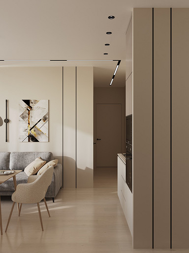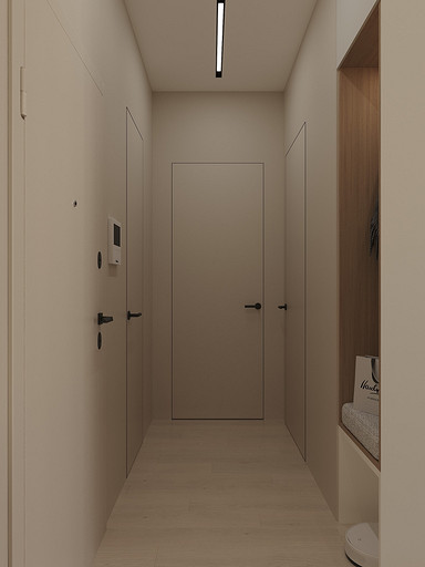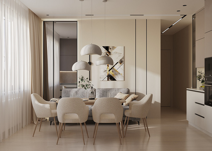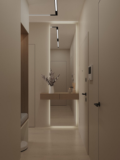 Изначально это было двушка 89м2 с кухней в центре и несколькими коридорами. Мы убрали стену, перенеся часть кухни в коридор, что позволило нам увеличить пространство и сделать уютную кухню -гостиную. Данная перепланировка позволила нам увеличить размеры с 14,76м2, до 17,73м2. В гостиной поставили большое зеркало, которое зрительно увеличивает пространство и добавляет «воздуха». Квартира выполнена в светлых тонах, стены покрашены в цвет «S 1502-Y50R» из палитры NCS — это нейтральный и утонченный оттенок. Этот цвет обладает нотками мягкого серого, но с теплым подтоном, который придает ему уют и комфорт. Этот оттенок является универсальным и способен придать помещению ощущение спокойствия и гармонии. Напольное покрытие в квартире комбинированное. На кухне используется керамогранит. В жилых комнатах — виниловый ламинат. В ванной для зонирования мы использовали стеклоблоки, которые отлично справились с задачей, но при этом не затенили помещение. В спальне на стенах используются комбинация стеновых панелей. Также для декора монтированы черные профиля на стенах. Квартира получилась нежная и светлая.