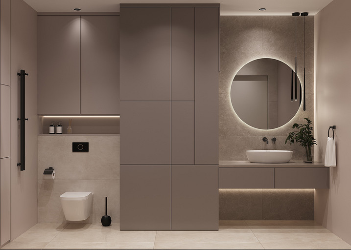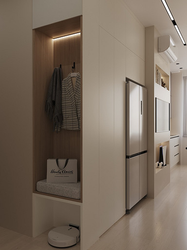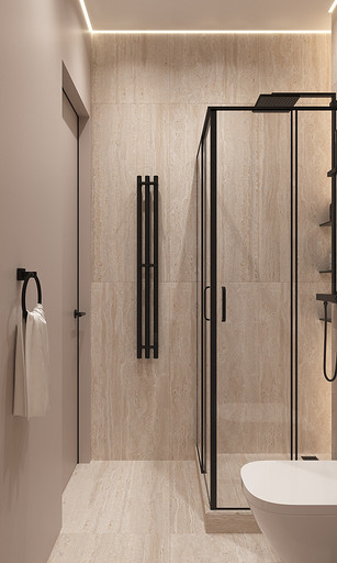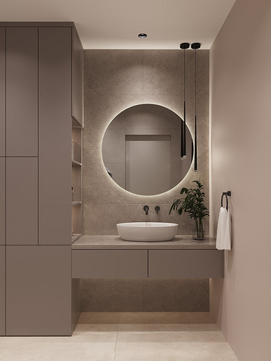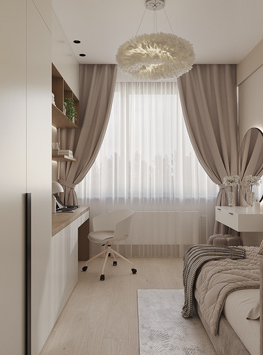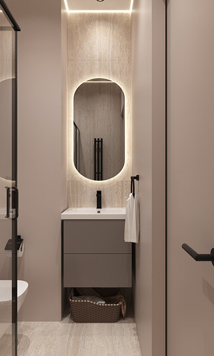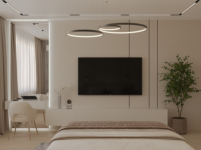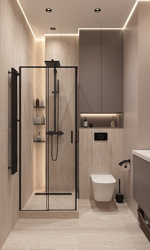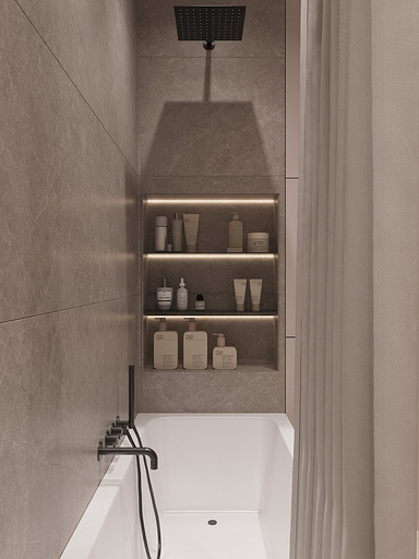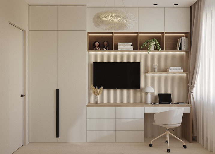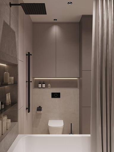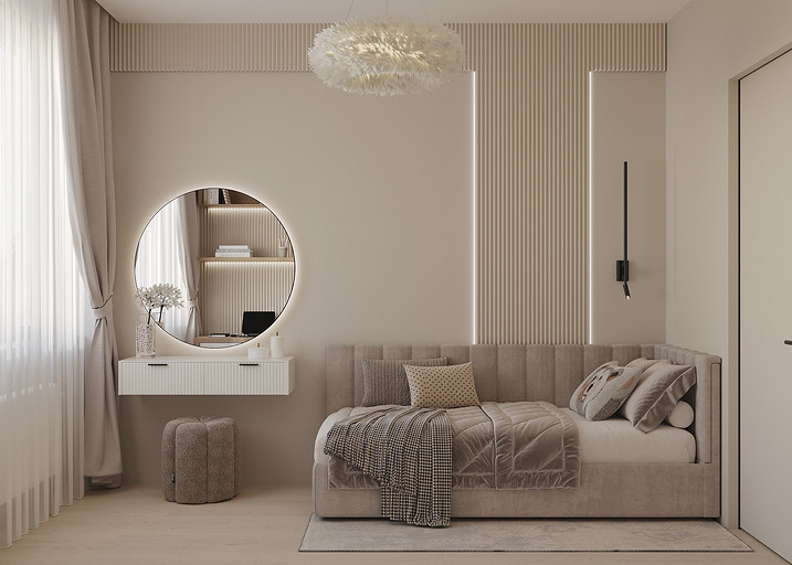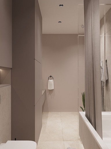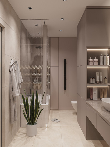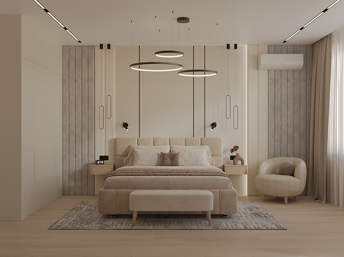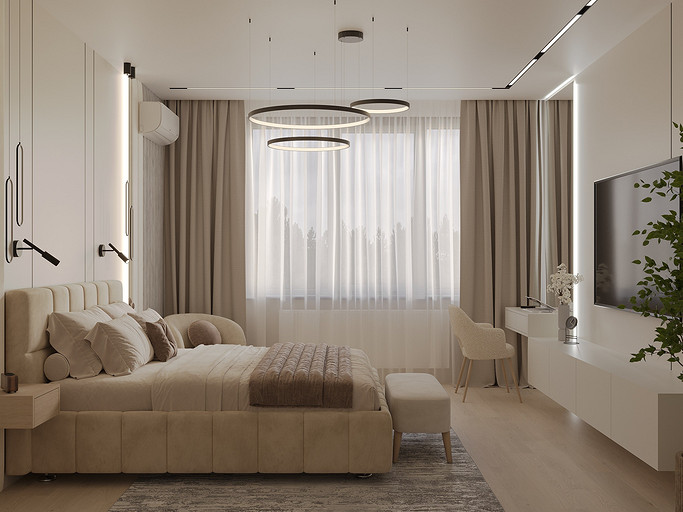 Изначально это было двушка 89м2 с кухней в центре и несколькими коридорами. Мы убрали стену, перенеся часть кухни в коридор, что позволило нам увеличить пространство и сделать уютную кухню -гостиную. Данная перепланировка позволила нам увеличить размеры с 14,76м2, до 17,73м2. В гостиной поставили большое зеркало, которое зрительно увеличивает пространство и добавляет «воздуха». Квартира выполнена в светлых тонах, стены покрашены в цвет «S 1502-Y50R» из палитры NCS — это нейтральный и утонченный оттенок. Этот цвет обладает нотками мягкого серого, но с теплым подтоном, который придает ему уют и комфорт. Этот оттенок является универсальным и способен придать помещению ощущение спокойствия и гармонии. Напольное покрытие в квартире комбинированное. На кухне используется керамогранит. В жилых комнатах — виниловый ламинат. В ванной для зонирования мы использовали стеклоблоки, которые отлично справились с задачей, но при этом не затенили помещение. В спальне на стенах используются комбинация стеновых панелей. Также для декора монтированы черные профиля на стенах. Квартира получилась нежная и светлая.