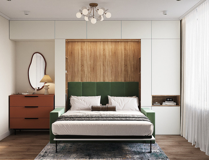 Заказчики — семья с двумя детьми — приобрели небольшую евротрешку площадью 54 кв. м в новом жилом комплексе. Им хотелось создать уютное и жизнерадостное пространство, где будет много систем хранения. Так в проекте появились кровать-трансформер, антресоли и полноценная постирочная.