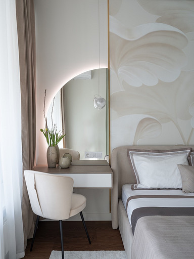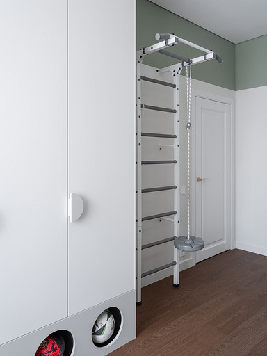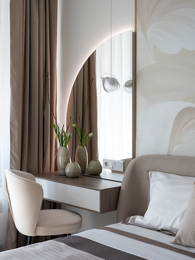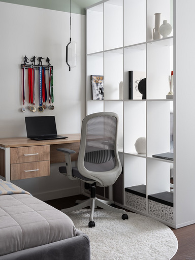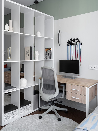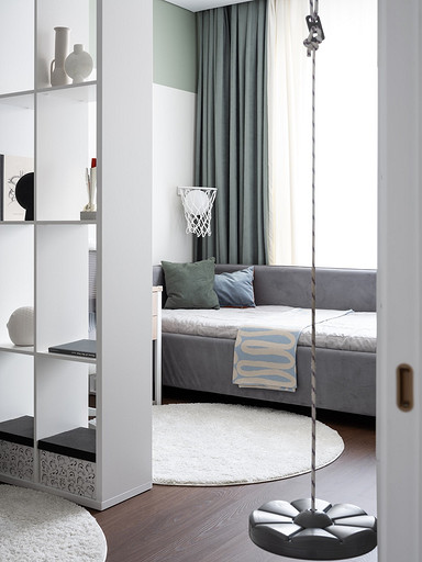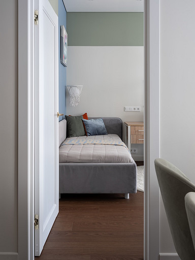 - Мебель: кровати в детской, подвесная тумба и консоль в спальне SK Design, кровать в спальне «Сонум», корпусная мебель сделана на заказ