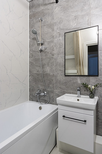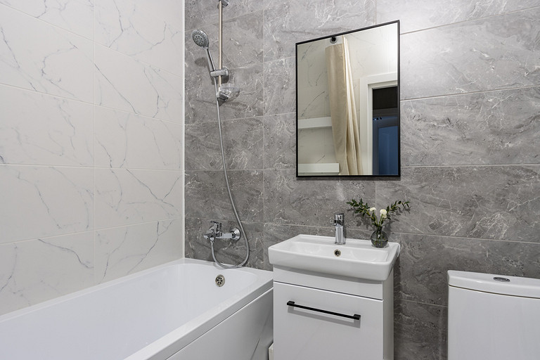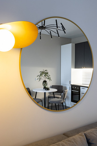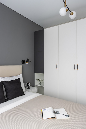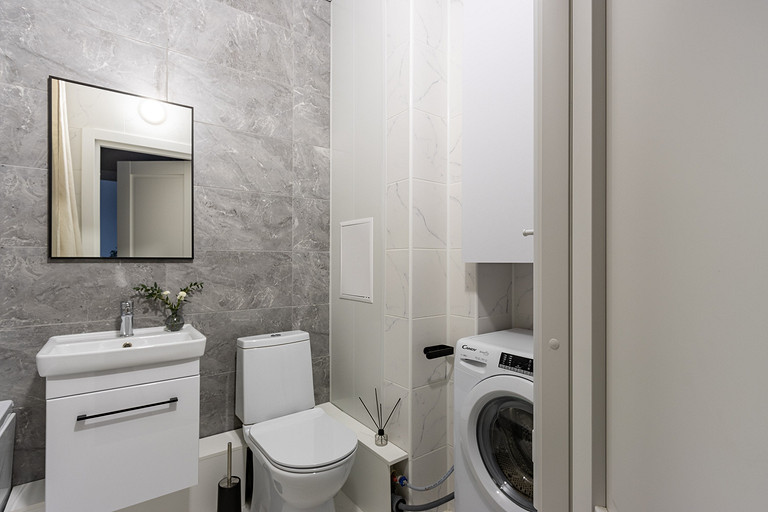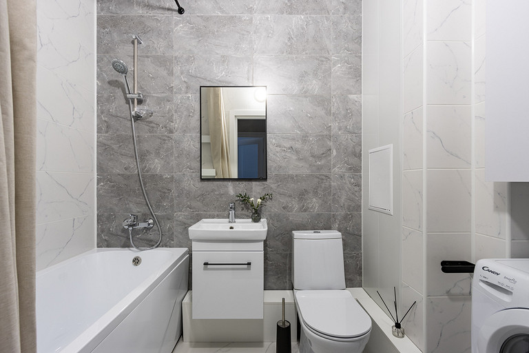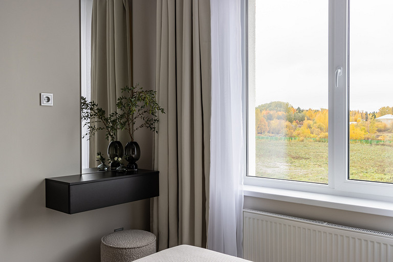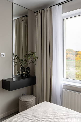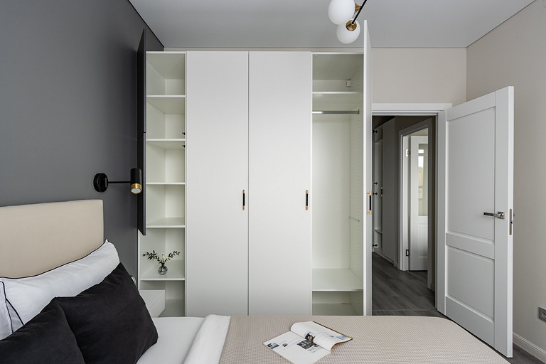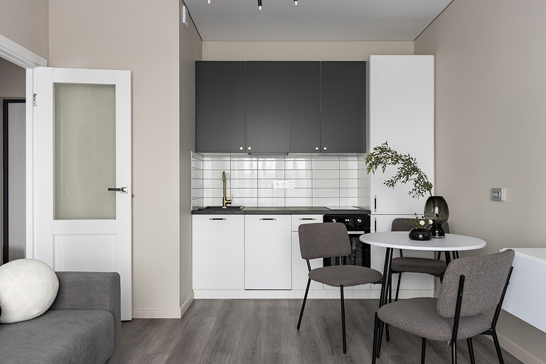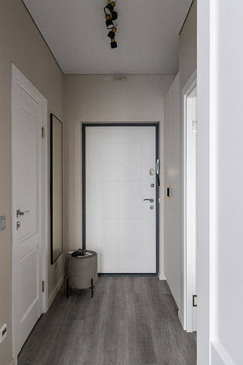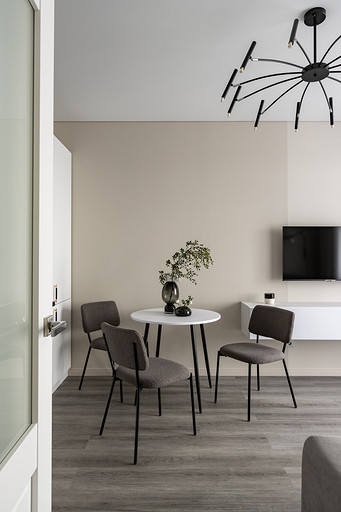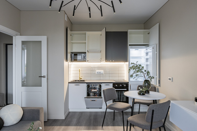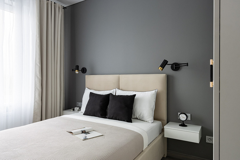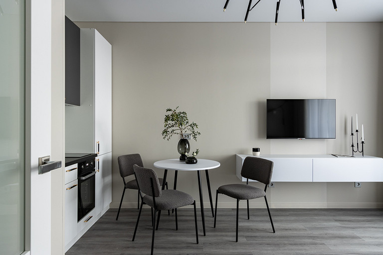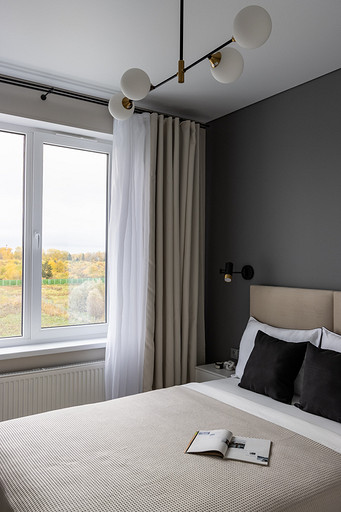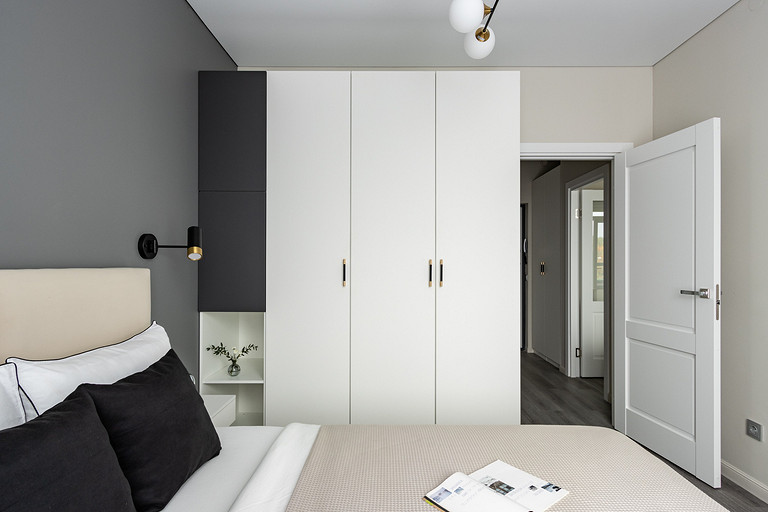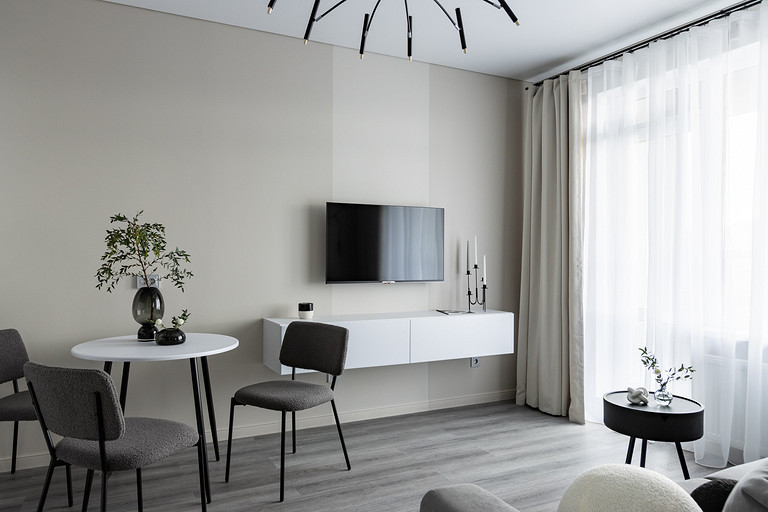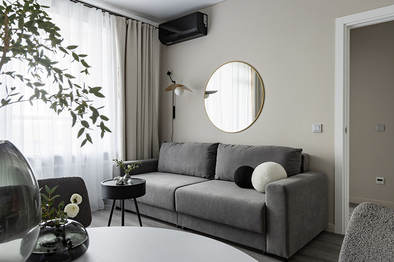 Передо мной стояла задача подготовить квартиру к долгосрочной аренде. Выбор пал на серо-бежевую гамму, а за счет графичных темных элементов, разного по текстуре текстиля (букле, велюр) интерьер не выглядит пресно и скучно. В квартире отделка от застройщика, которую доработали в части переноса электрики, замены плинтуса, покраски стен. В проекте использована модульная мебель (кухня Виват, шкафы Хофф), остальные предметы преимущественно с маркетплейсов, эффектная люстра и бра в кухне-гостиной — Алиэкспресс. В кухне-гостиной, площадью 15 кв.м, удалось разместить гостиную зону с большим диваном и кухню со всей необходимой техникой. А в спальне 11 кв.м. большой шкаф, кровать с матрасом 140 см и туалетный столик.