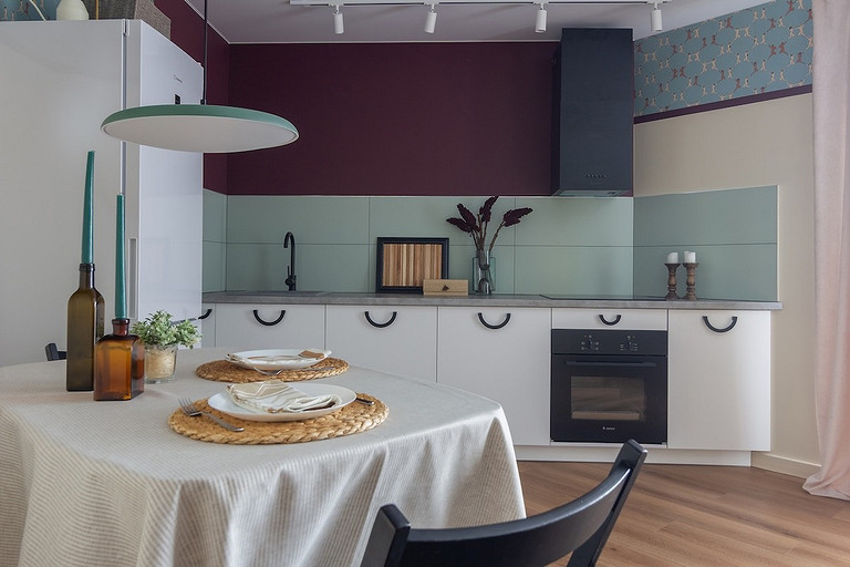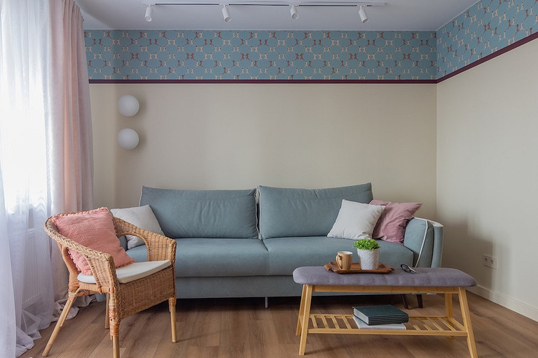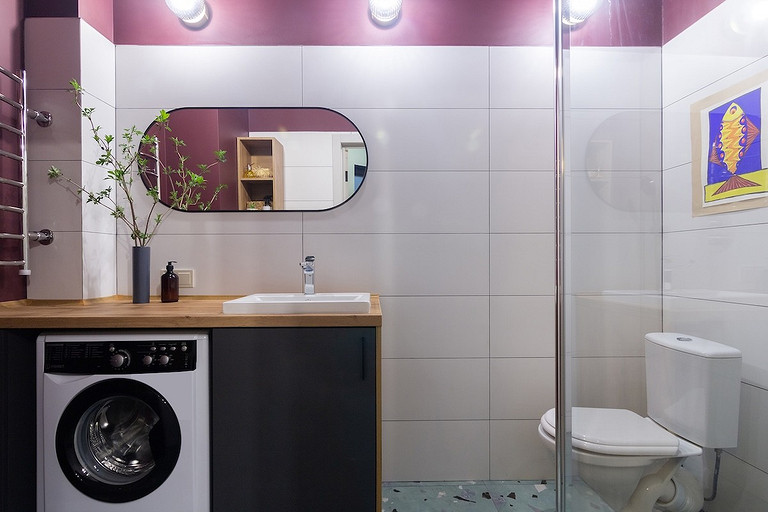- Освещение: подвесной светильник над обеденным столом Loft It, потолочные треки ST Luce, бра за диваном Maytoni, бра в ванной ИКЕА