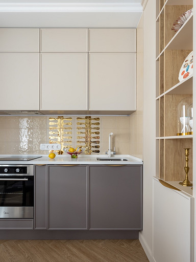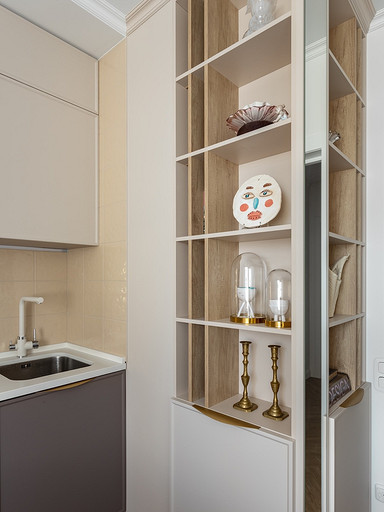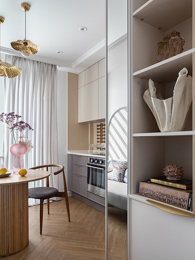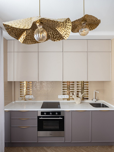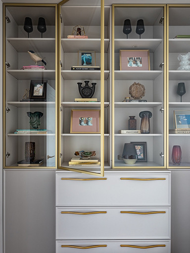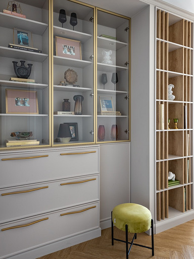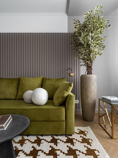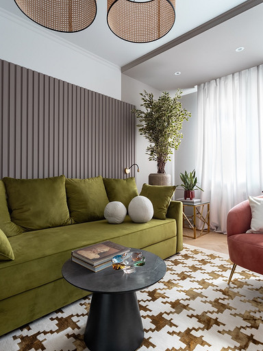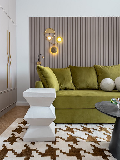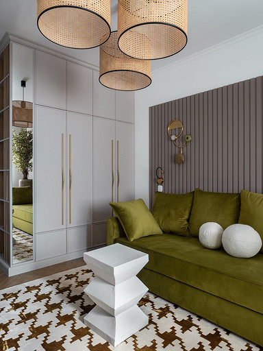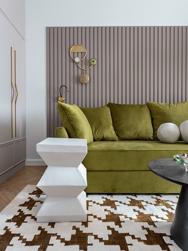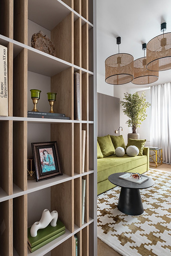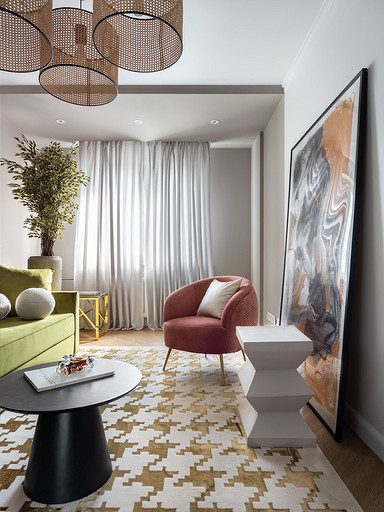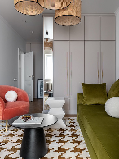 - Мебель: диван, кресло и золотой столик Garda Decor, черный журнальный столик Bergenson Bjorn, белый столик сделан на заказ, шкаф и стеллаж «Абажур» (на заказ)