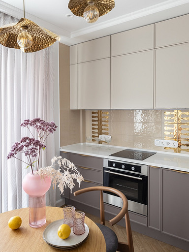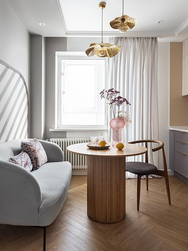 - Мебель: диван La Redoute, стол «Хрусталь», стул Hansen Chair, кухня и стеллаж «Абажур»