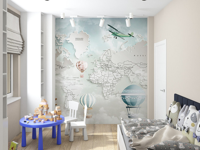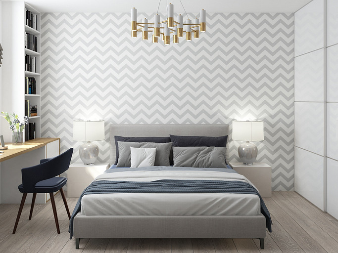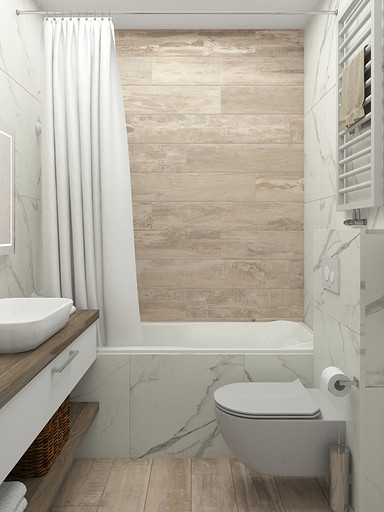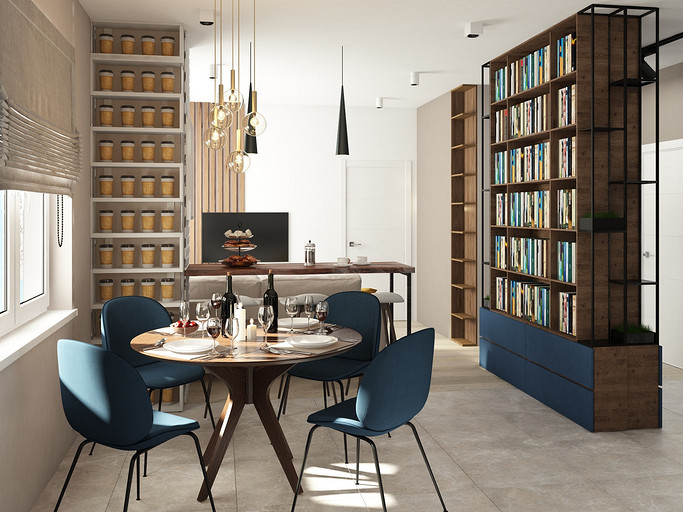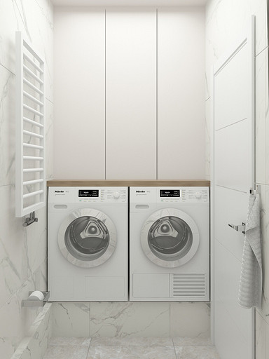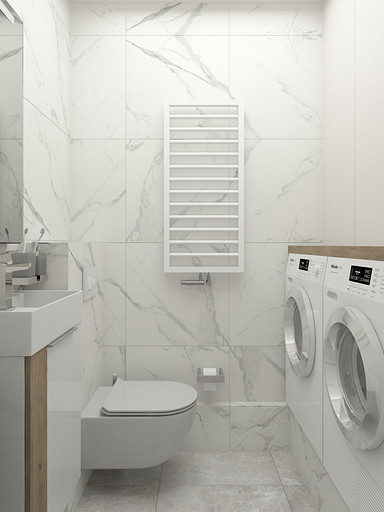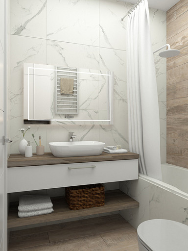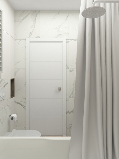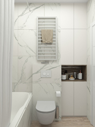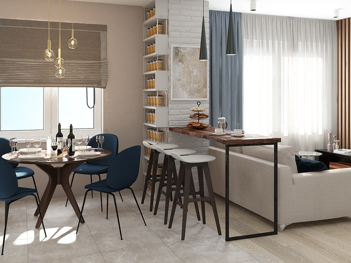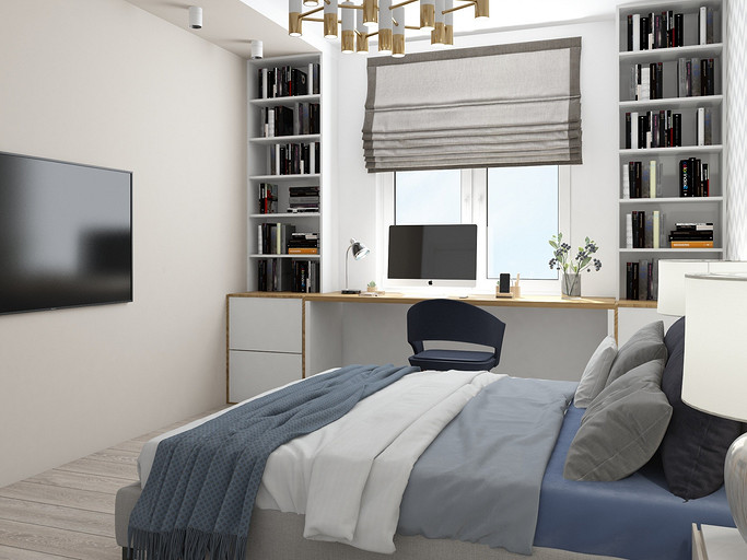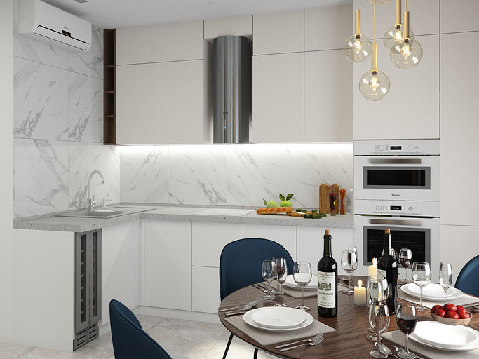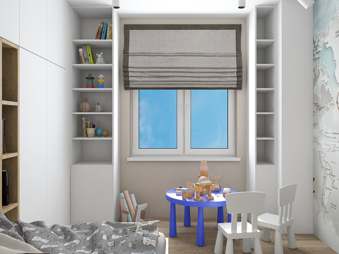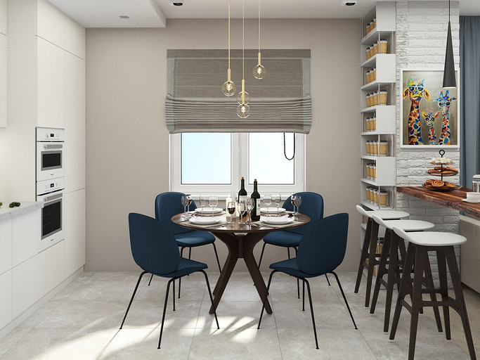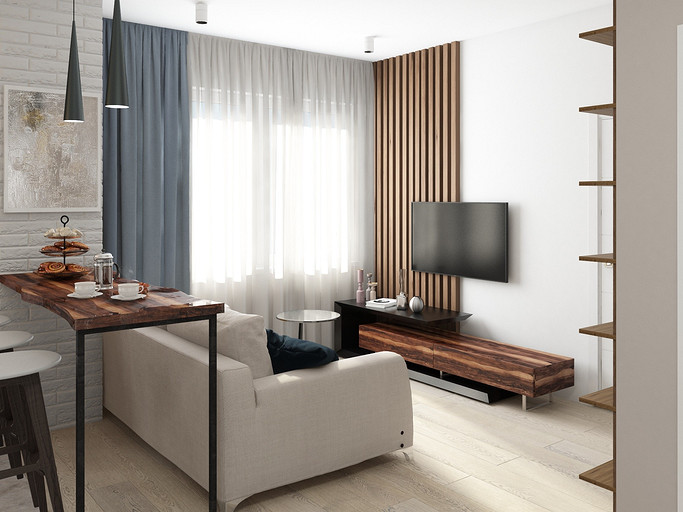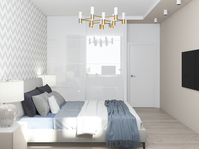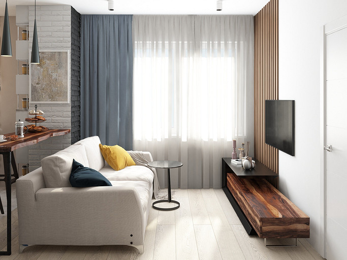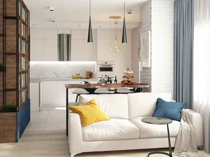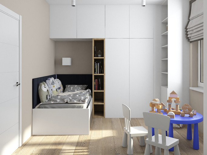Интерьер выполнен преимущественно в светлых тонах, с добавлением небольших цветовых акцентов и деревянных элементов. Кухня в современном стиле с белыми фасадами и мраморным фартуком создает ощущение простора и чистоты. Компактная гостиная с белым диваном зонируется барной стойкой. Зона коридора отделена от кухни-гостиной стеллажом, это создает более комфортную атмосферу и добавляет уюта. В спальне по запросу заказчиков сделано большое рабочее место вдоль окна. Детская комната компактная и функциональная, планировочное решение выполнено с расчетом на вырост, чтобы была возможность поменять кровать на больший размер и поставить рабочий стол. В маленьком санузле удалось уместить зону постирочной, и оставить главный санузел легким и не загруженным.