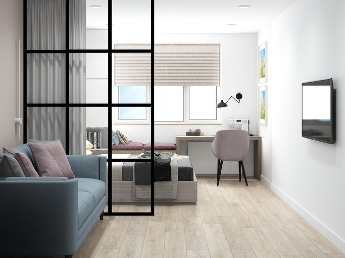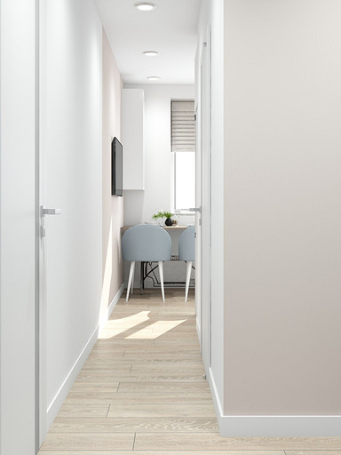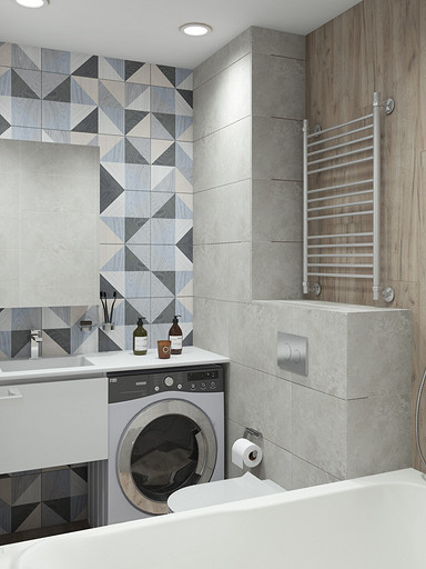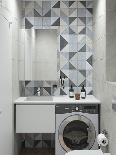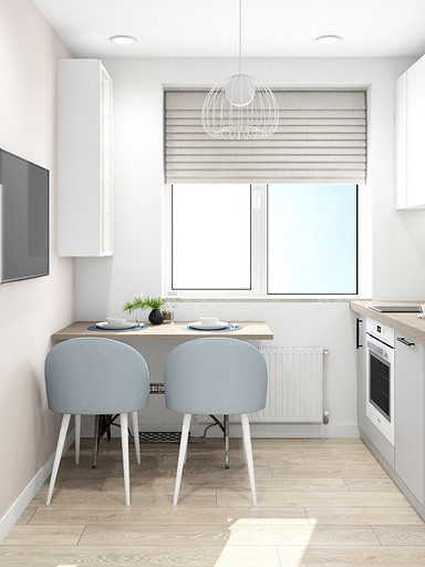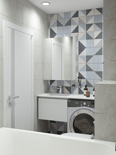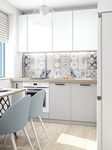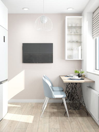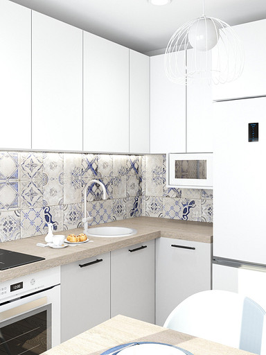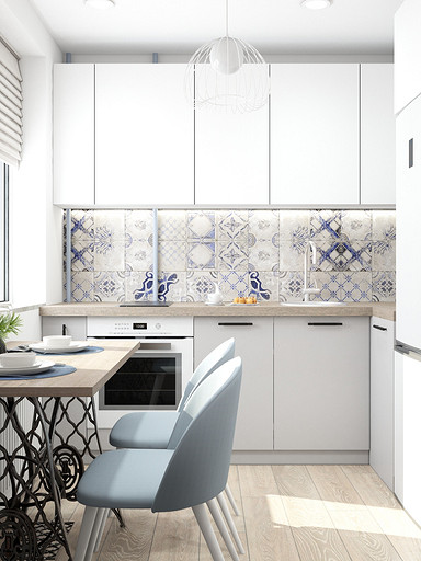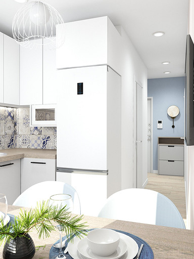 Дизайн квартиры выполнен в светлых тонах, с небольшими цветовыми акцентами. На кухню по желанию заказчицы была выбрана голубая плитка с узорами, задающая тон всей квартире. Интересным элементом на кухне служит стол, изготовленный из ножек швейной машинки. В квартире сохранена типовая планировка, в большой комнате выполнено зонирование стеклянной перегородкой.