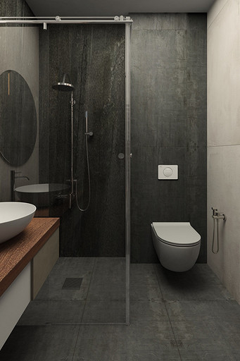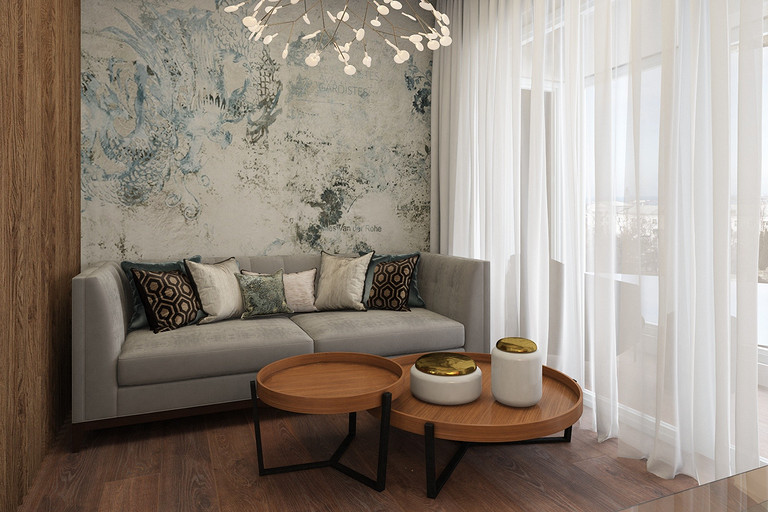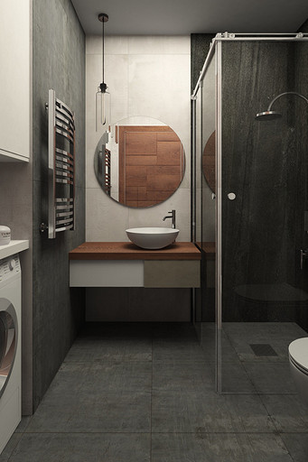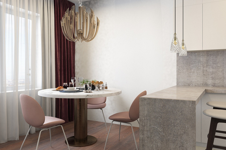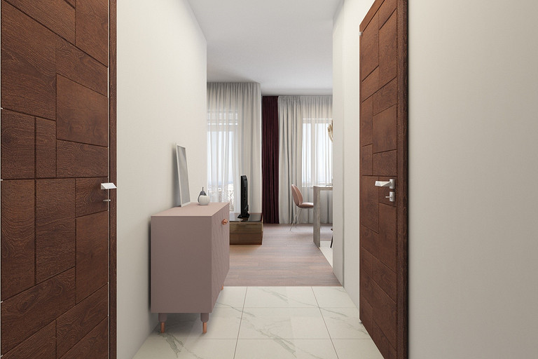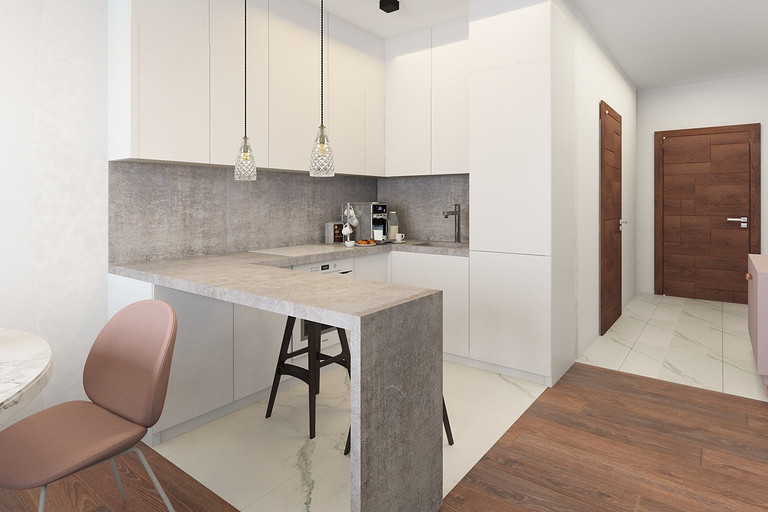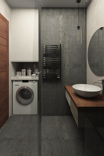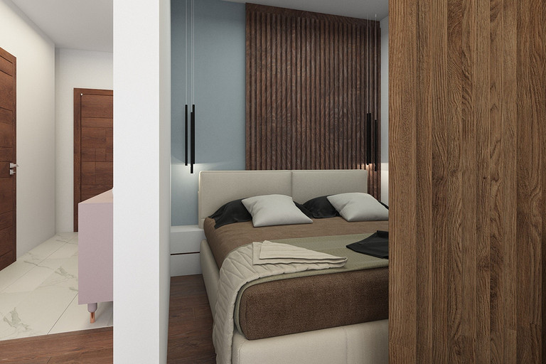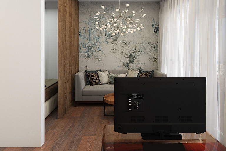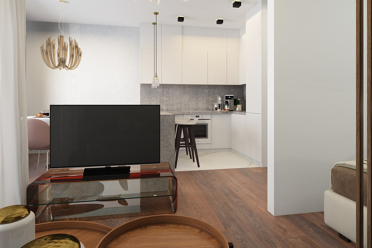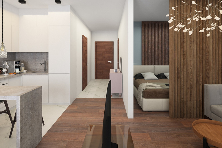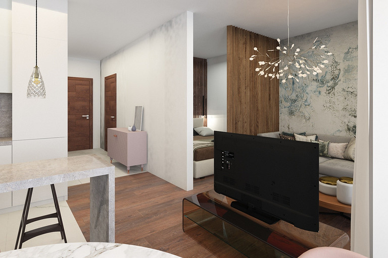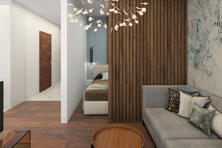 По желанию заказчицы однокомнатную квартиру трансформировали в просторную студию. Зона кровати сделана в нише и отделена от общего пространства с помощью реек. Вся квартира выполнена в светлых тонах с яркими акцентами. Ванная комната сделана преимущественно в темных тона, и перекликается с остальными помещениями за счет ярких акцентов.
