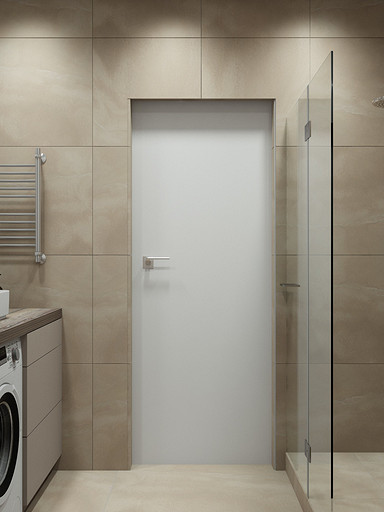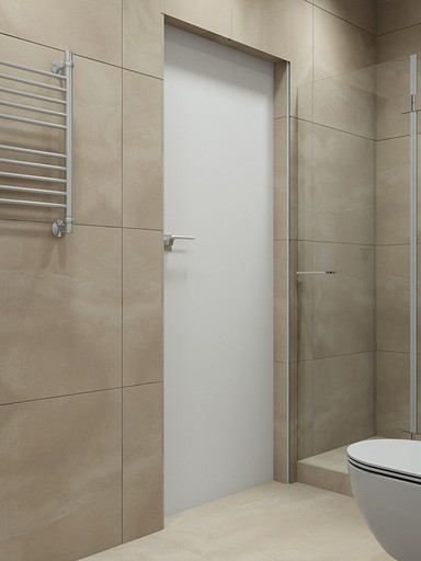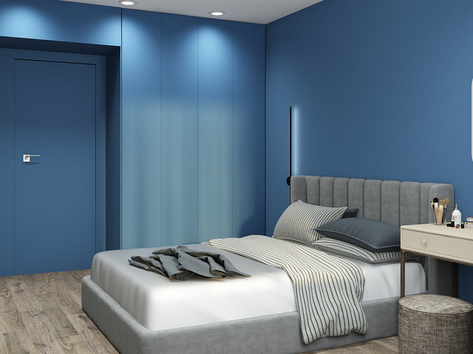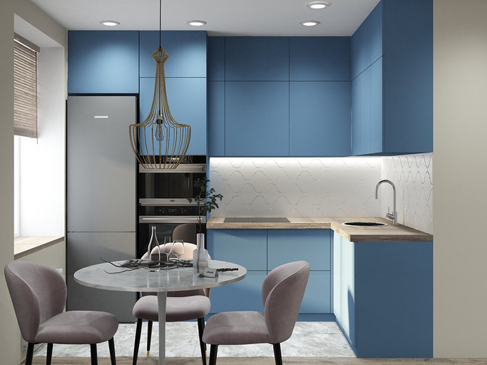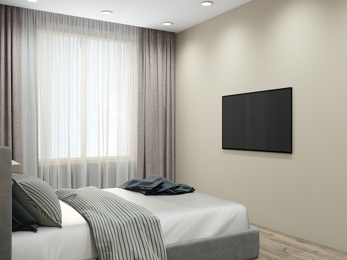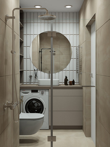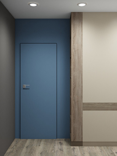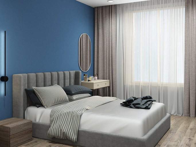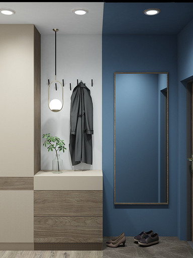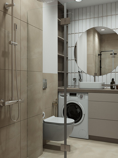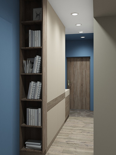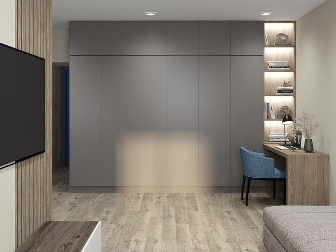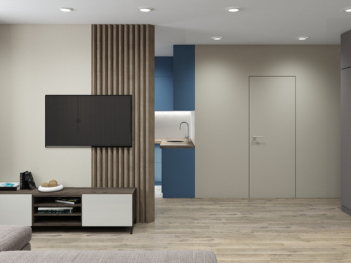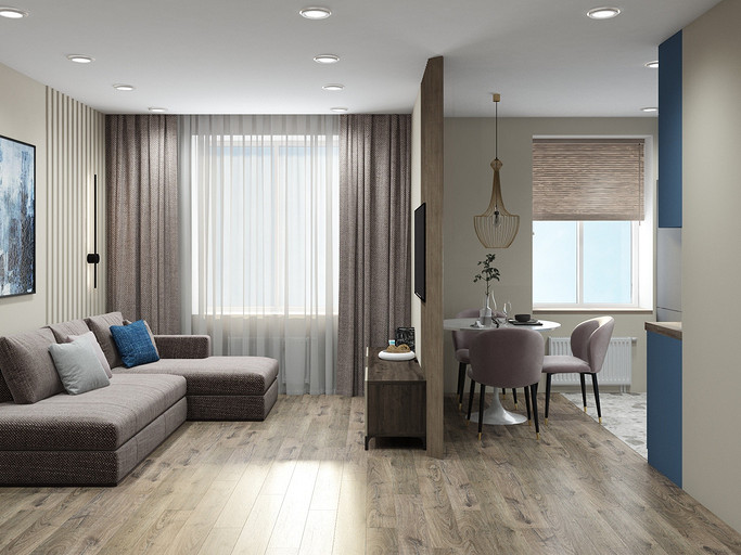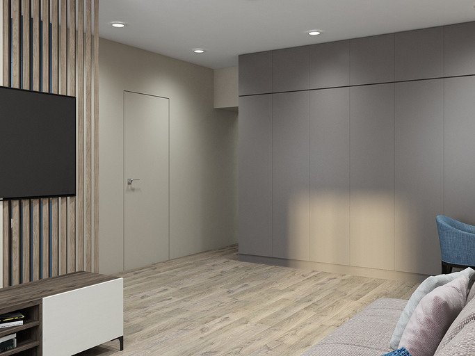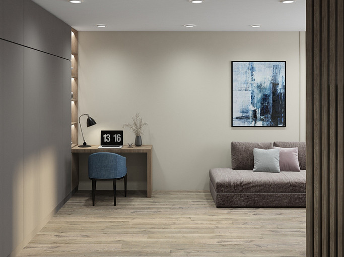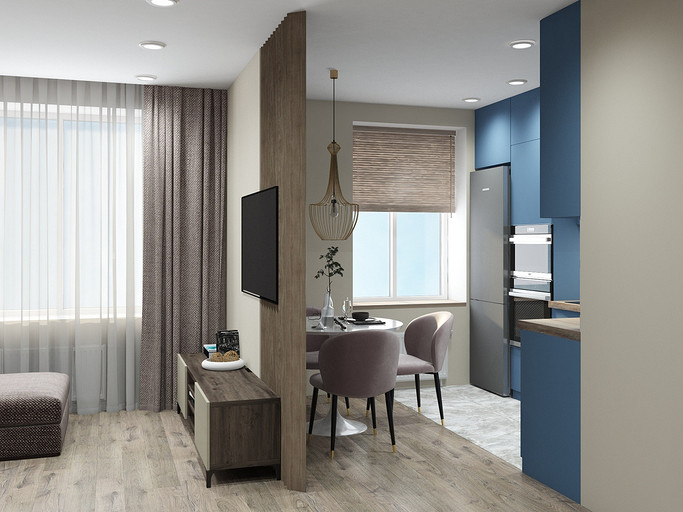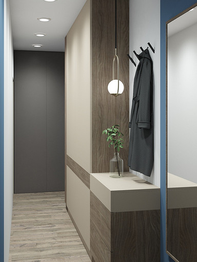 Квартира во вторичном фонде. В кухне с большой комнатой сделано зонирование стеной и деревянными реечными панелями. В зоне гостиной предусмотрено рабочее место и системы хранения. Спальня расположена в другом конце квартиры, что делает ее более приватной. Отказались от раздельного санузла в пользу совмещенного, это увеличило пространство и позволило сделать большую столешницу с раковиной под которой разместилась стиральная машина. Минус квартиры — узкий и длинный коридор, который нет возможности увеличить из за несущей стены. В прихожей разместились неглубокие шкафы, и дополнительно предусмотрели гардеробный шкаф в конце коридора.