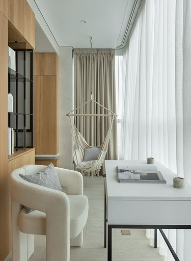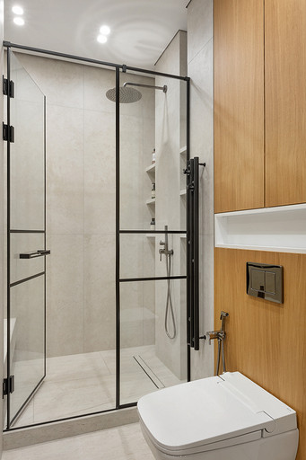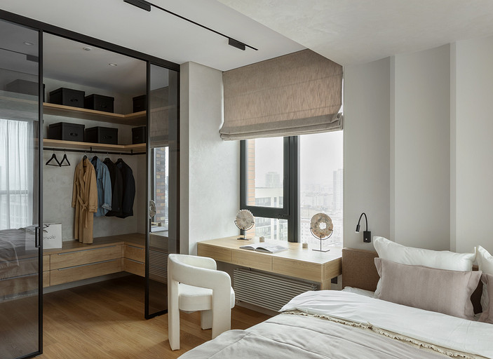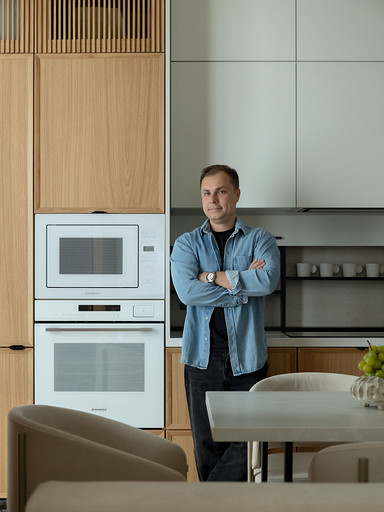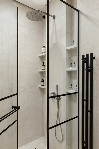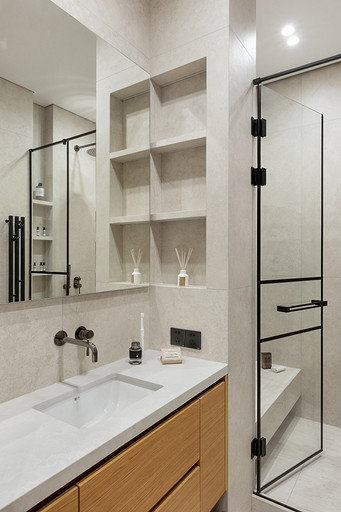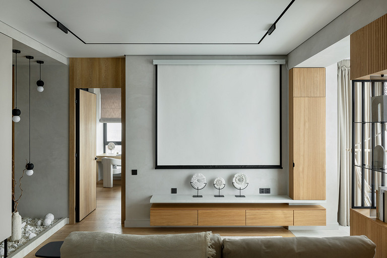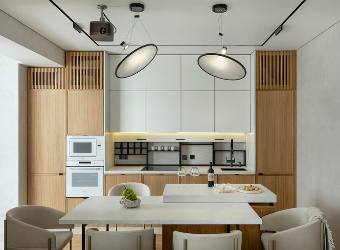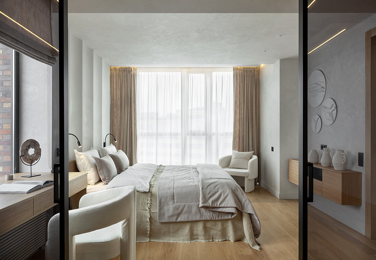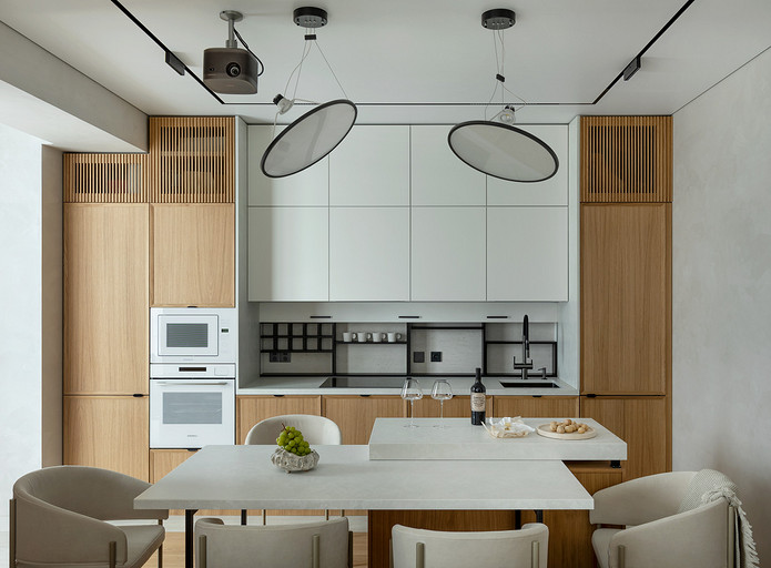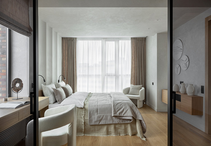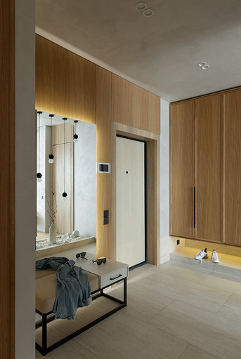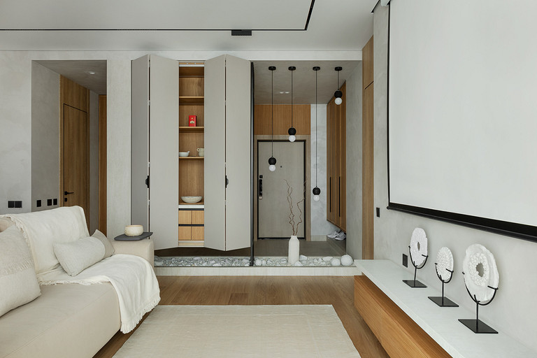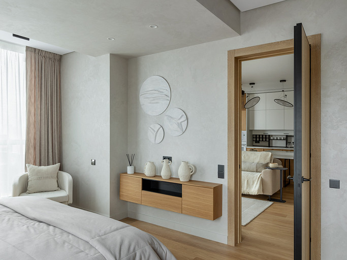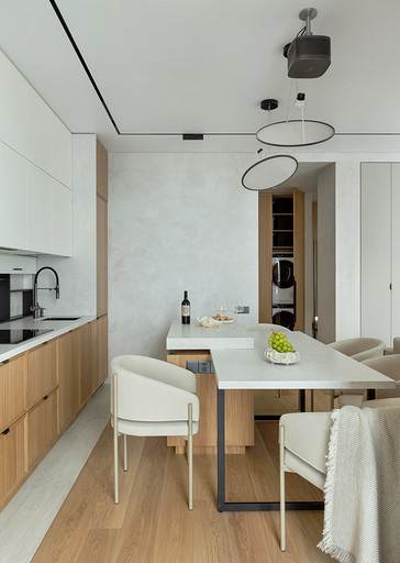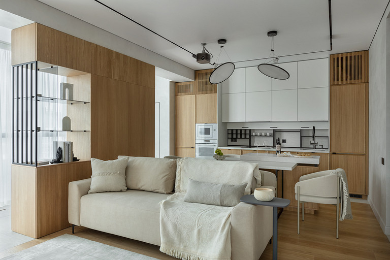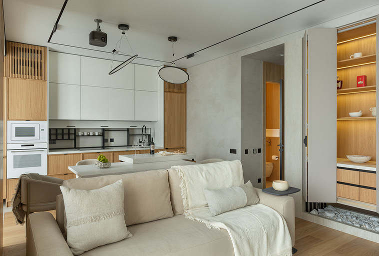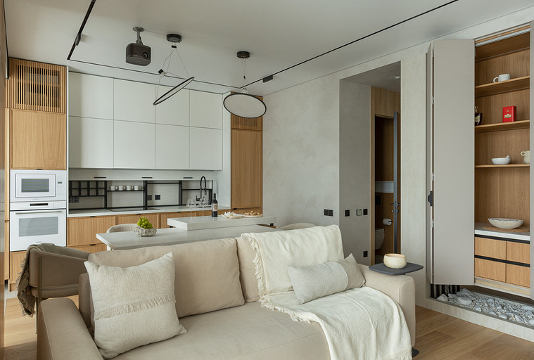 К нам обратились заказчики с запросом на создание светлой и просторной квартиры в формате open space, в которой есть четко организованное “общее” пространство и “хозяйское”. Основным пожеланием было использование природных текстур, материалов и цветовой палитры в спокойных тонах, без ярких акцентов. Само пространство, при небольшой площади, должно быть максимально функциональным, иметь места под хранение, при этом не перегружать глаз. Тем самым на этапе планировочного решение было создано четкое деление на зоны, где в общем пространстве получилось уместить прихожую, гостиную, кухню, постирочную и рабочую зону, которые зонировались при помощи мебельных конструкций, декоративных элементов или перехода материалов на напольных и стеновых покрытиях. В хозяйской же части разместились просторная спальня с собственным гардеробом.