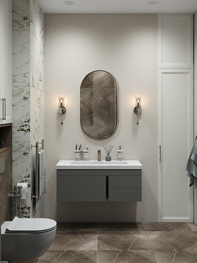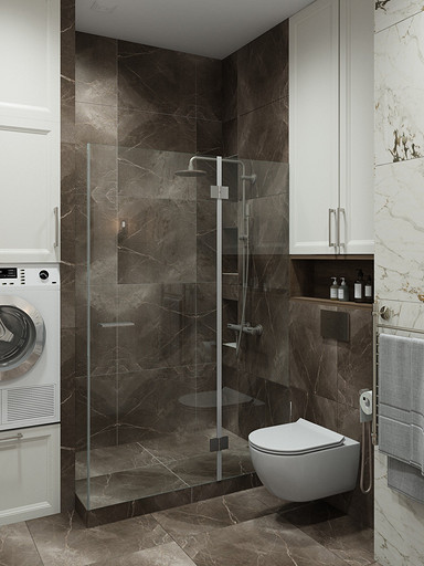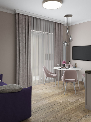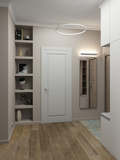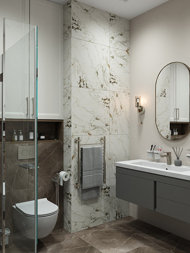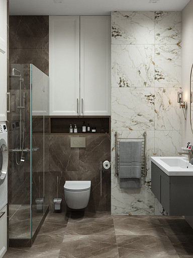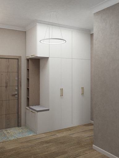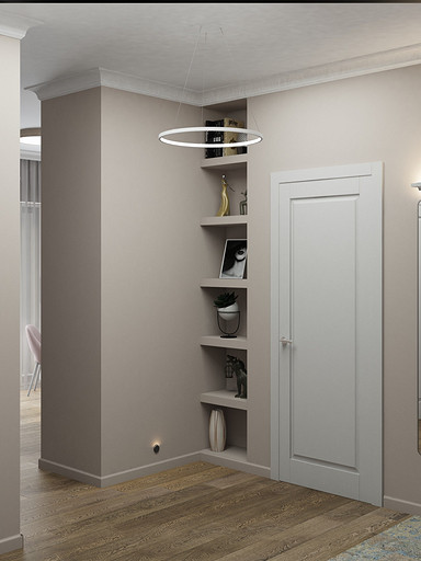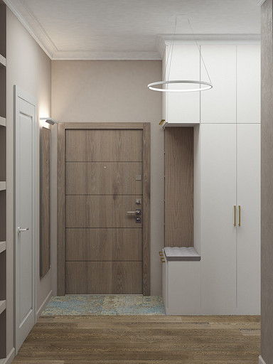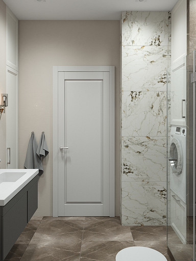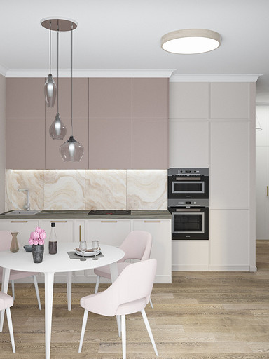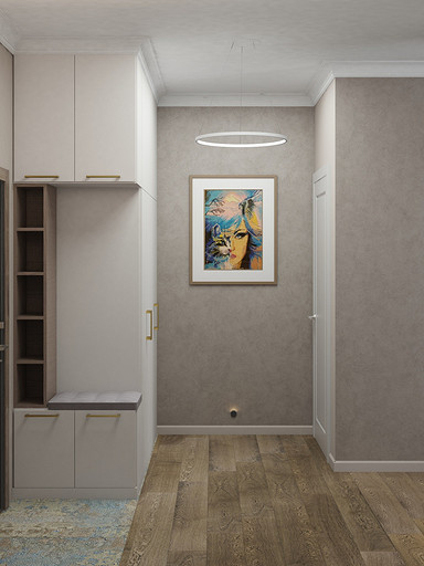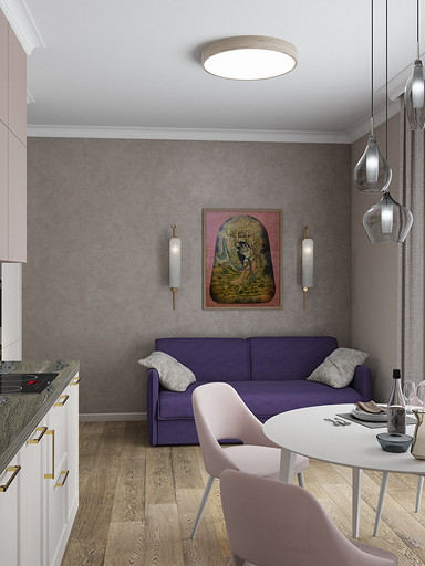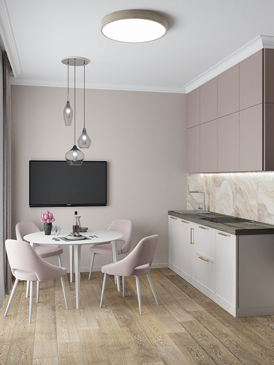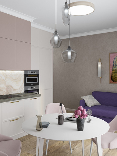 Квартира в стиле современная классика, до начала разработки проекта мы с заказчицей изучили несколько вариантов квартир и выбрали наиболее подходящий под ее пожелания, поэтому кардинальной перепланировки не потребовалось. За счет совмещения туалета и ванной получился просторный санузел в котором уместилось все необходимое, стиральная машинка в колонне и хозяйственный шкафчик с местом для лотка кошечки. Кухня получилась небольшая и функциональная, в ней уместилось все необходимое. Цветовая гамма выполнена в светлых пудровых и бежево-коричневых тонах.