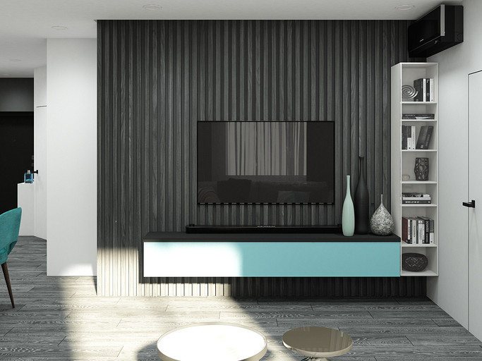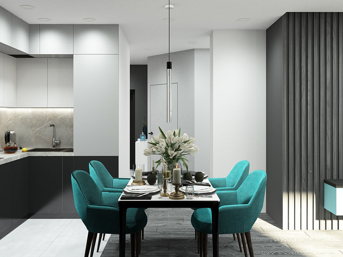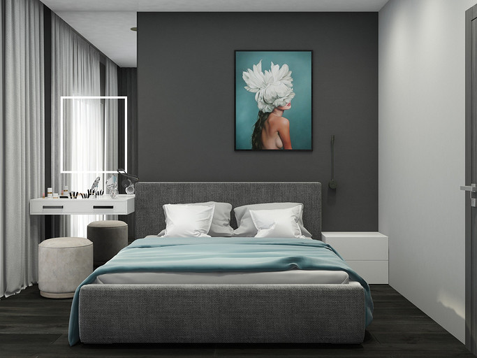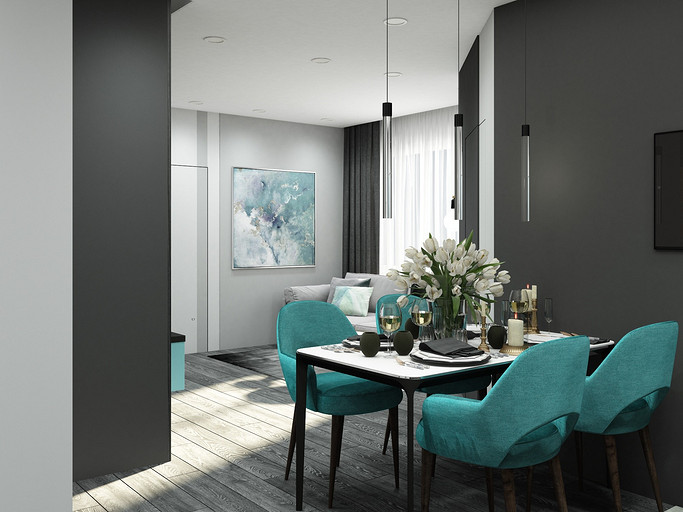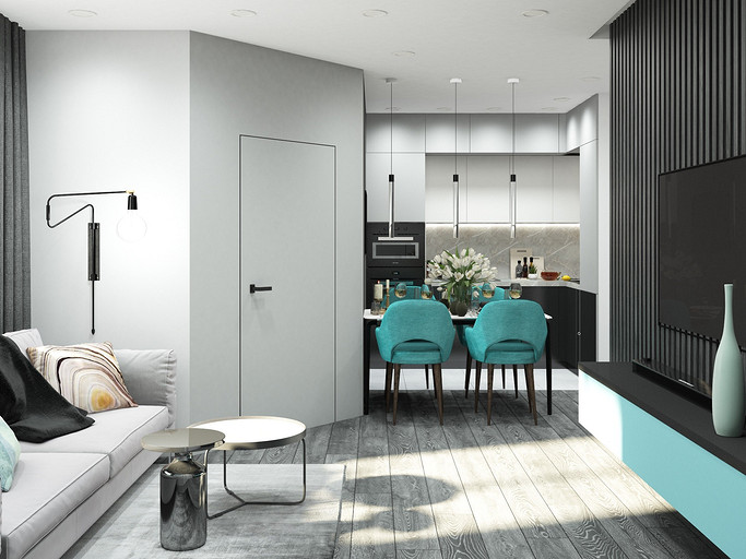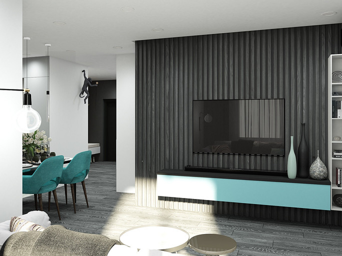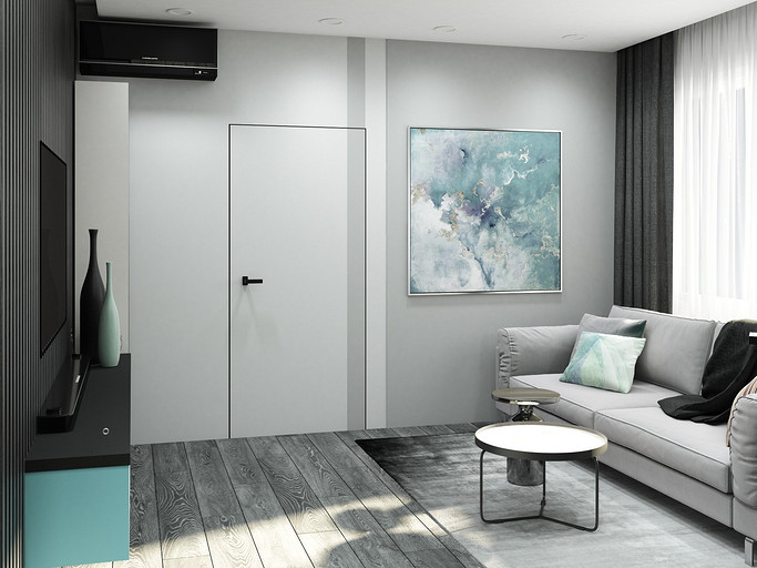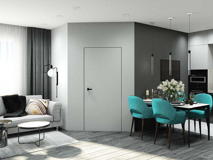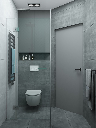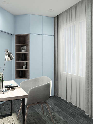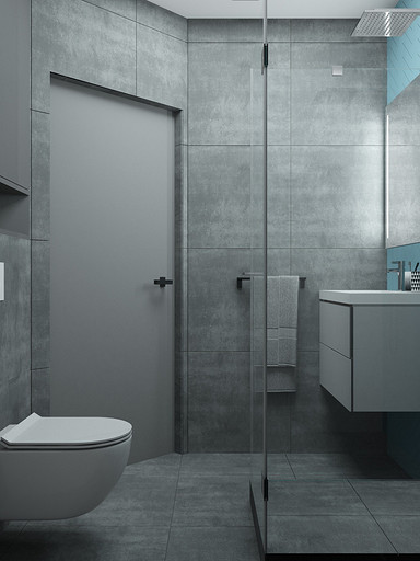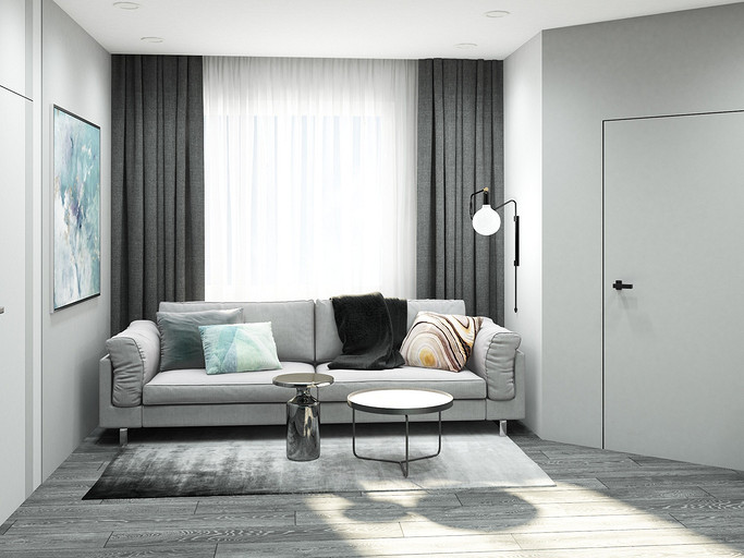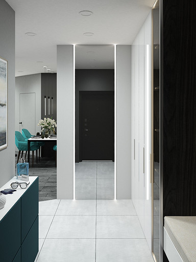 Квартира в современном минималистичном стиле в серых тонах, для семьи с двумя детьми. Кухня сделана в нише, большее пространство отведено под зону отдыха в гостиной. Необходимо было разместить большие гардеробные для хранения вещей и велосипедов, чтобы не отнимать места у санузлов было принято решение сделать коридор и сделать гардеробные по центру квартиры рядом с зоной прихожей. Уже в процессе ремонта кабинет был переоборудован в детскую комнату для малыша.