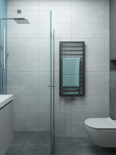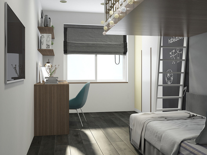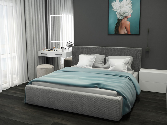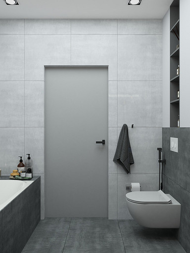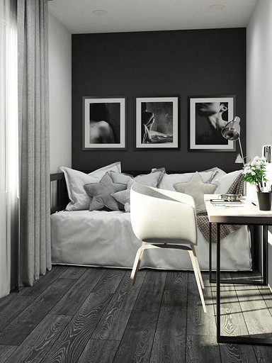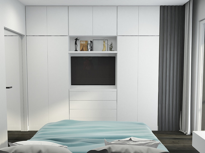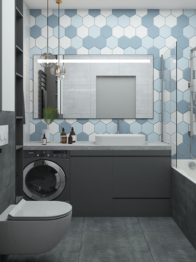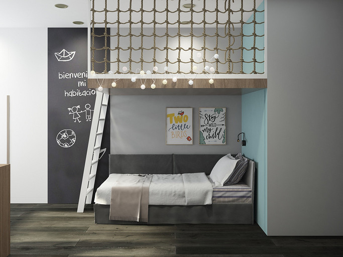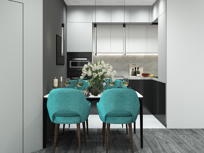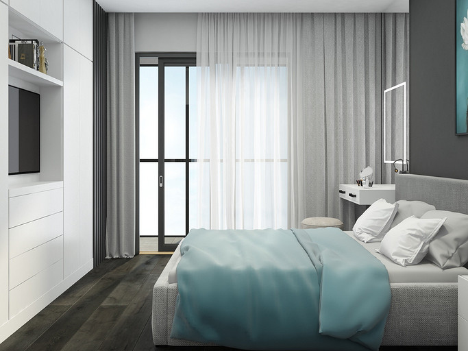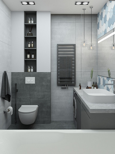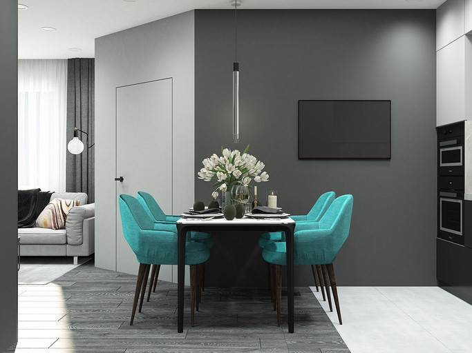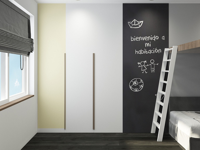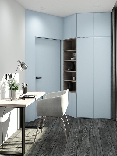 Квартира в современном минималистичном стиле в серых тонах, для семьи с двумя детьми. Кухня сделана в нише, большее пространство отведено под зону отдыха в гостиной. Необходимо было разместить большие гардеробные для хранения вещей и велосипедов, чтобы не отнимать места у санузлов было принято решение сделать коридор и сделать гардеробные по центру квартиры рядом с зоной прихожей. Уже в процессе ремонта кабинет был переоборудован в детскую комнату для малыша.