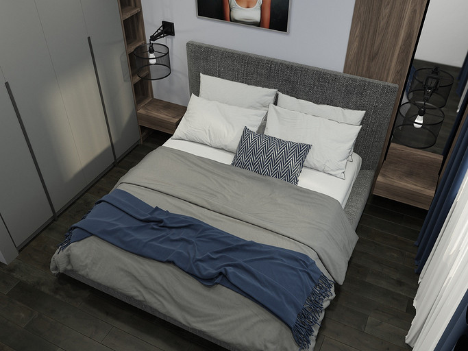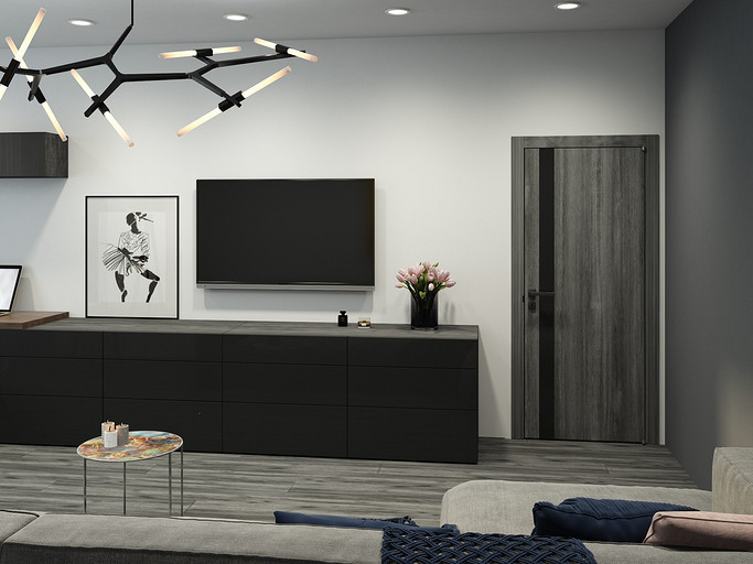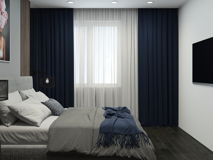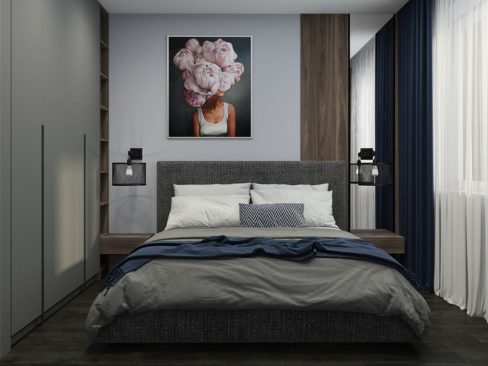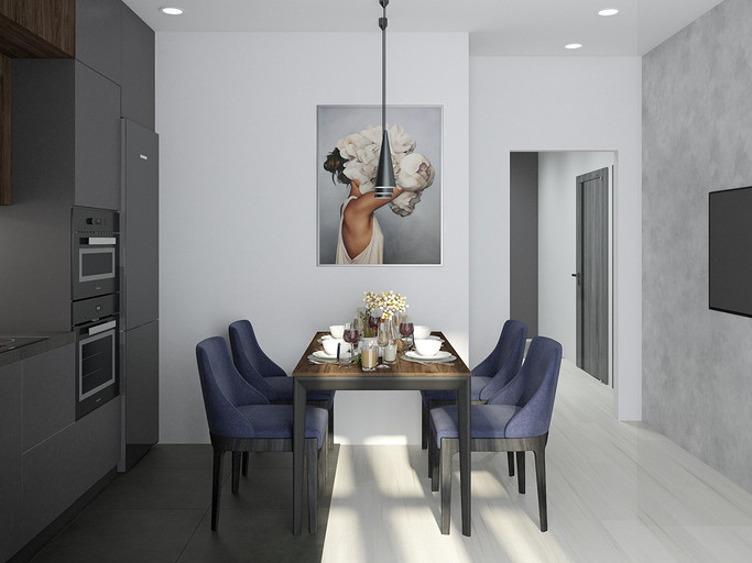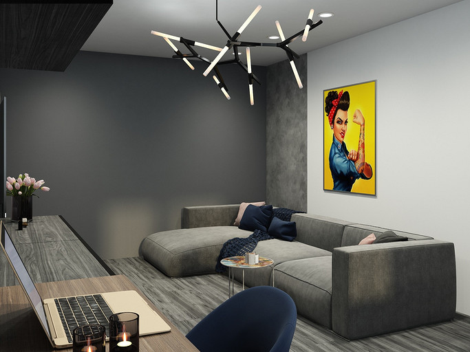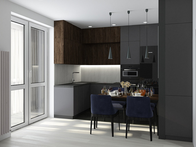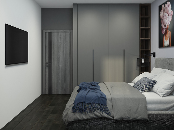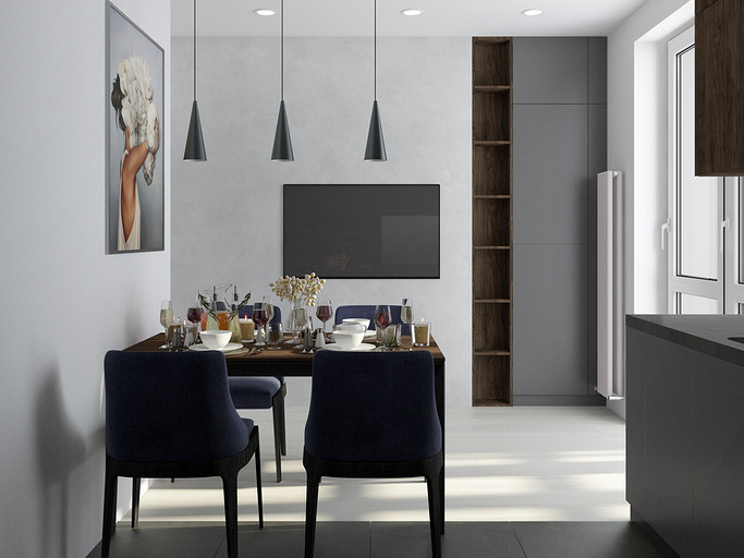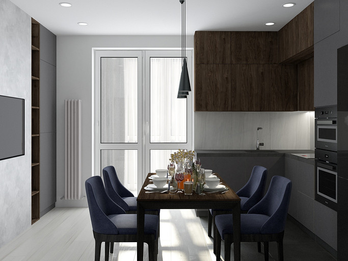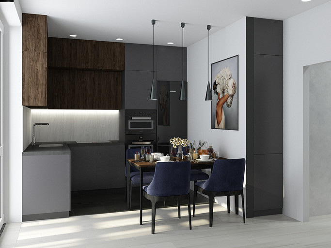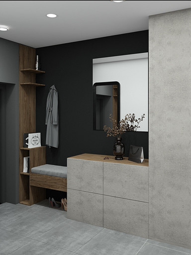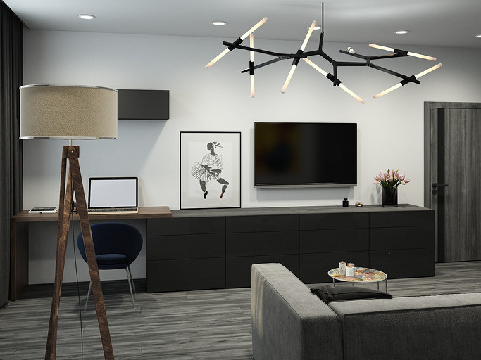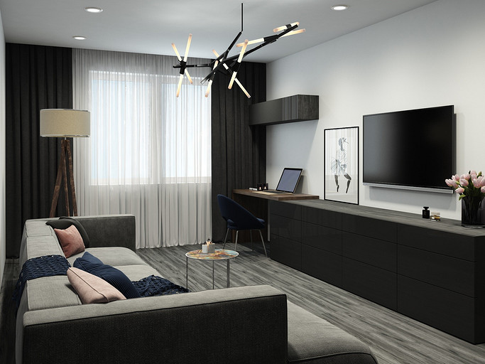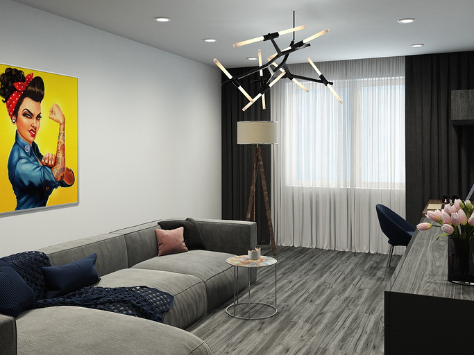 Дизайн квартиры в темных тонах, выполнен в современном стиле с элементами лофта. Темные акценты сделаны в основном на мебели, стены преимущественно светлые, это создает контраст и яркость. Квартира просторная с удачной планировкой, единственным изменением было совмещение санузла.