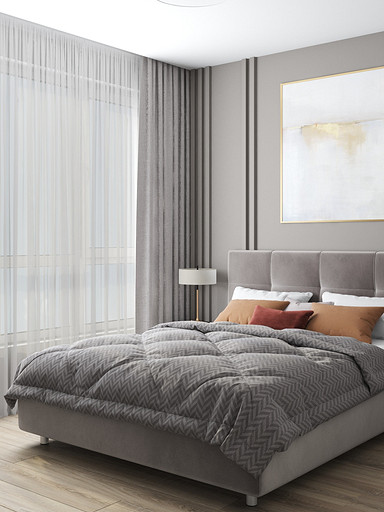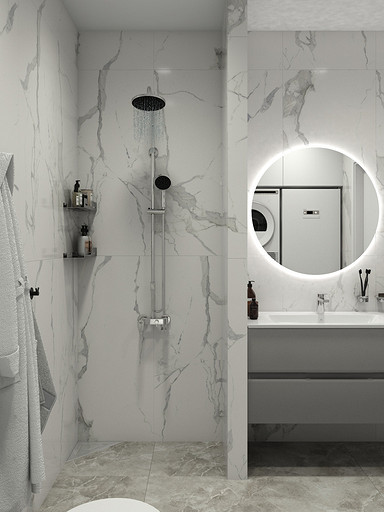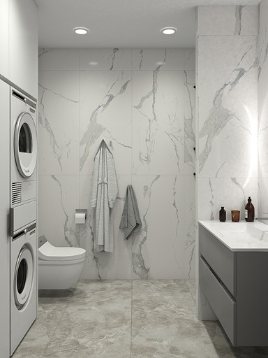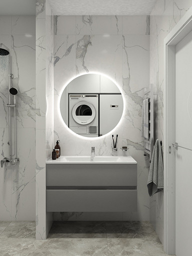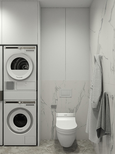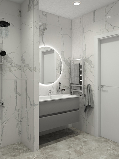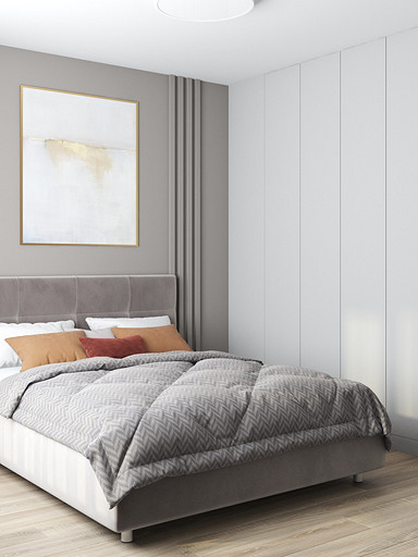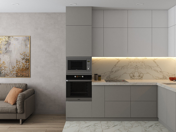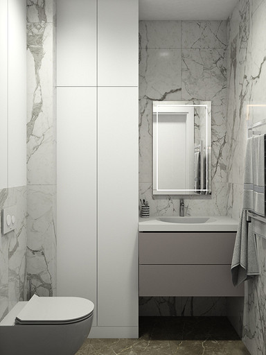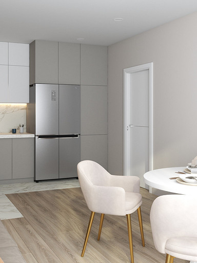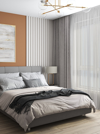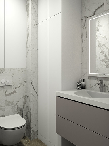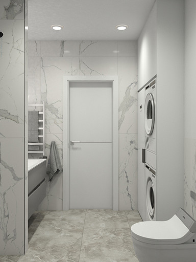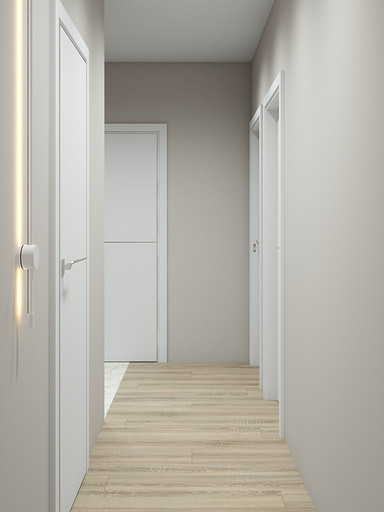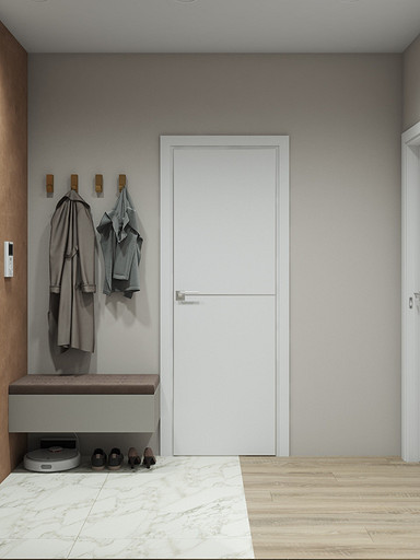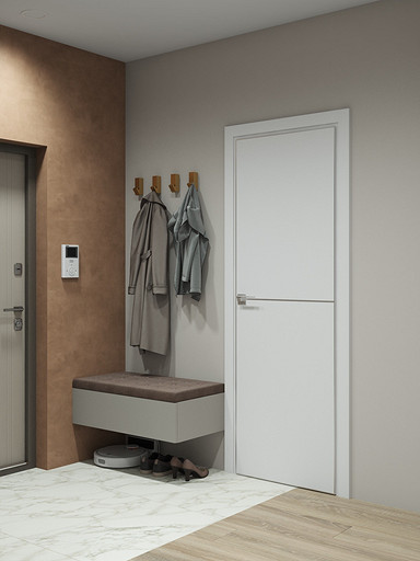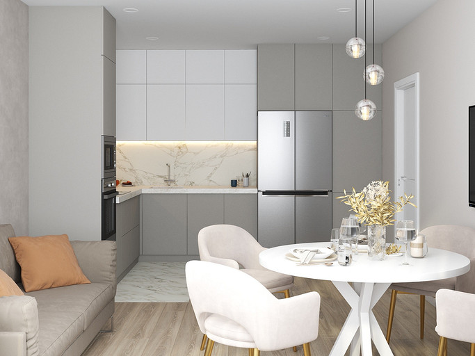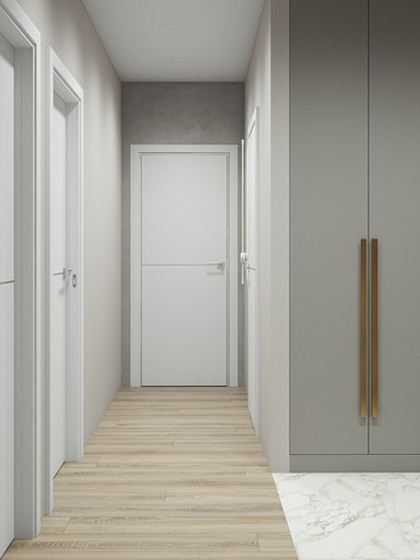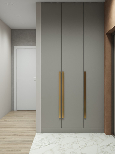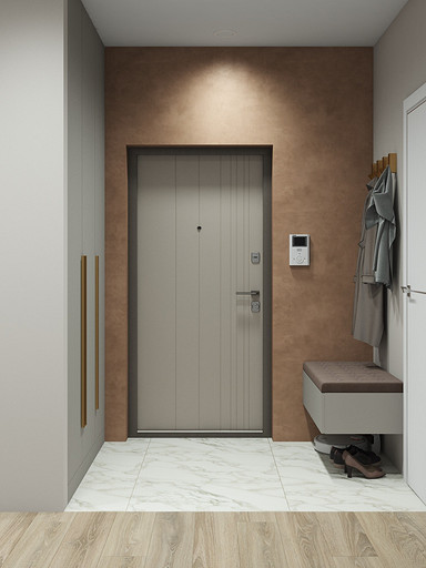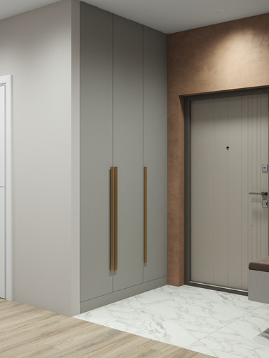 Двухкомнатная квартира в современном стиле для семейной пары, дизайн выполнен в теплых спокойных тонах с небольшими рыжими оттенками. Кухня-гостиная довольно большая и просторная. В спальнях сделаны шкафы в нишах, что визуально уменьшает лишний шум. Основной санузел был немного увеличен за счет прихожей, в санузле была задача разместить помимо стиралки, сушильный шкаф и машинку.