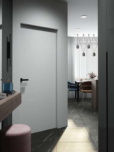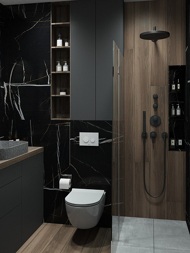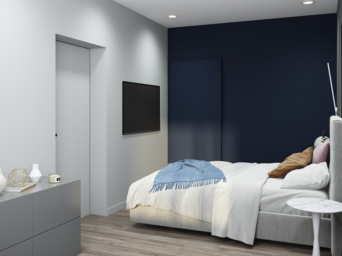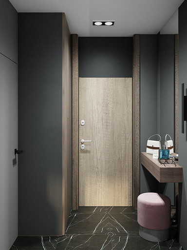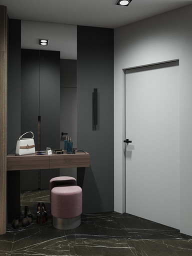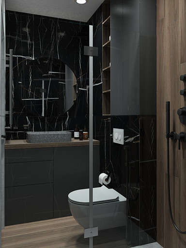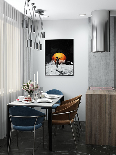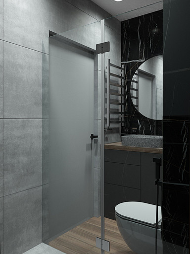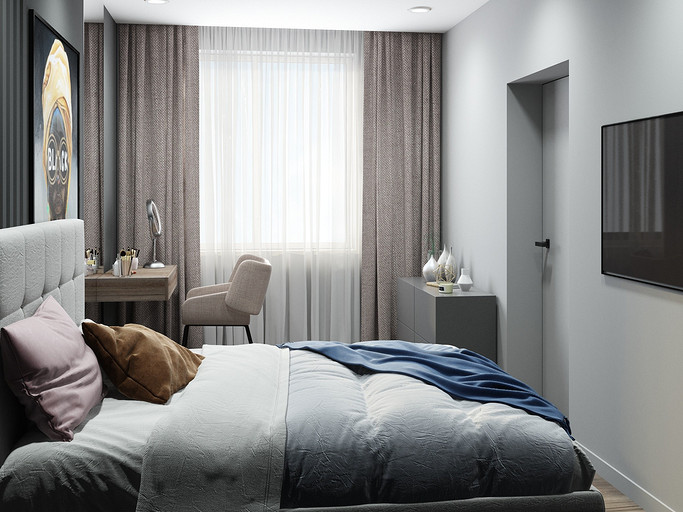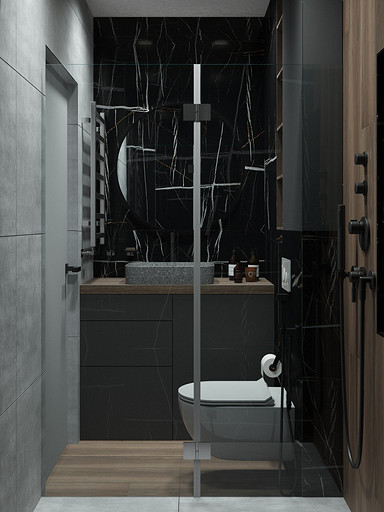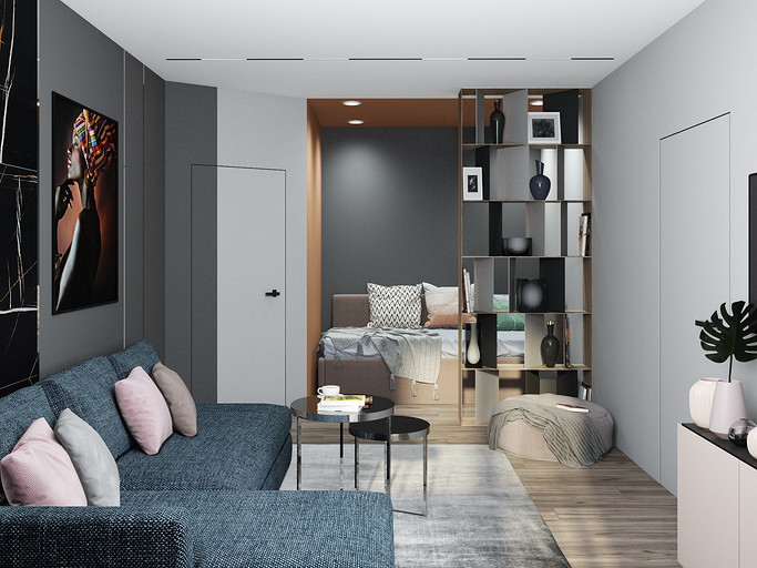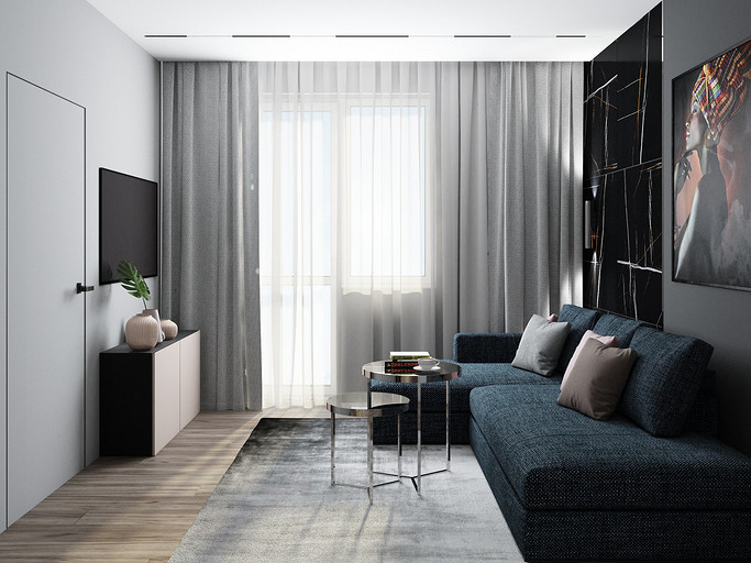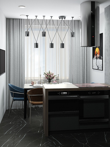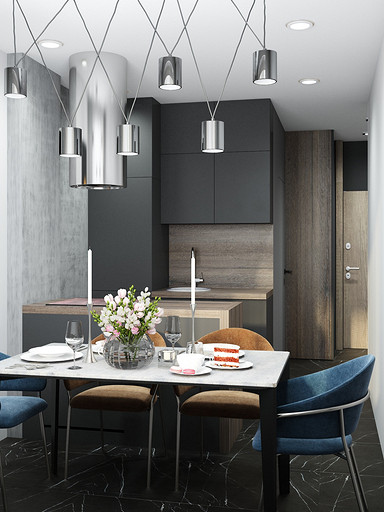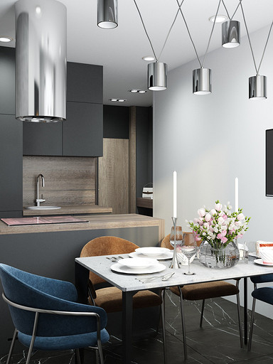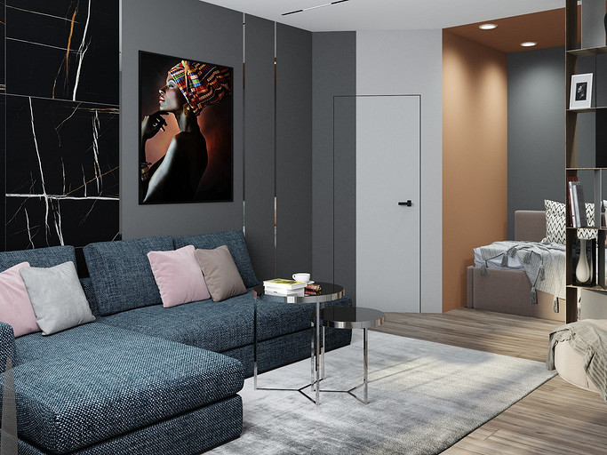 Квартира для семьи с одним ребенком. Заказчиками была выбрана темная цветовая гамма, дизайн получился стильный и яркий. Спальня довольно длинная, и для того чтобы визуально уменьшить длину комнаты сделали гардеробную. В гостиной сделали зонирование, в нише расположилась подростковая кровать. Санузел очень компактный, при проектировании был еще меньше, но после демонтажа стен обнаружились дополнительные сантиметры. В кухне была задача сделать барную стойку, зона кухни получилась довольно компактная, но влезло все необходимое.