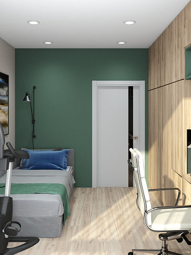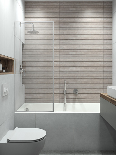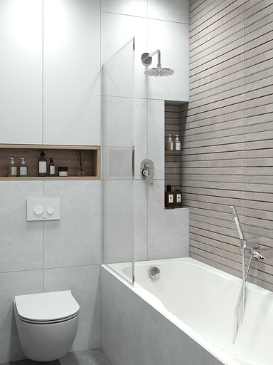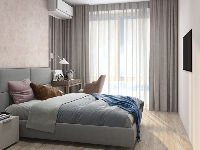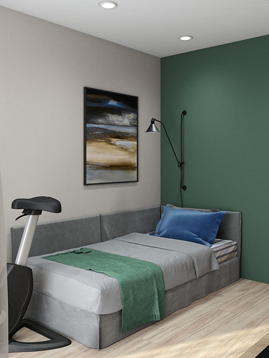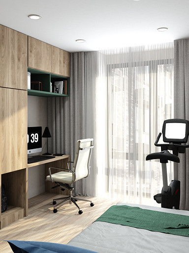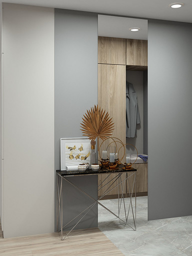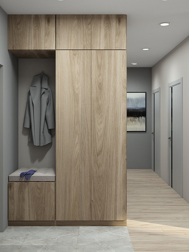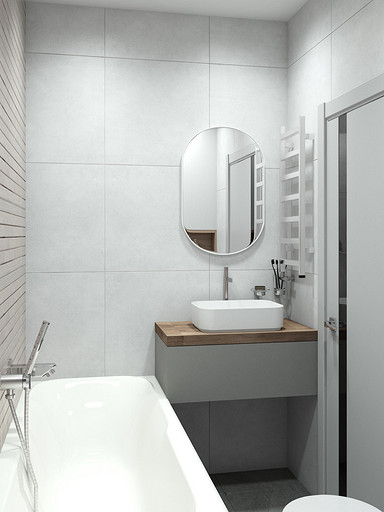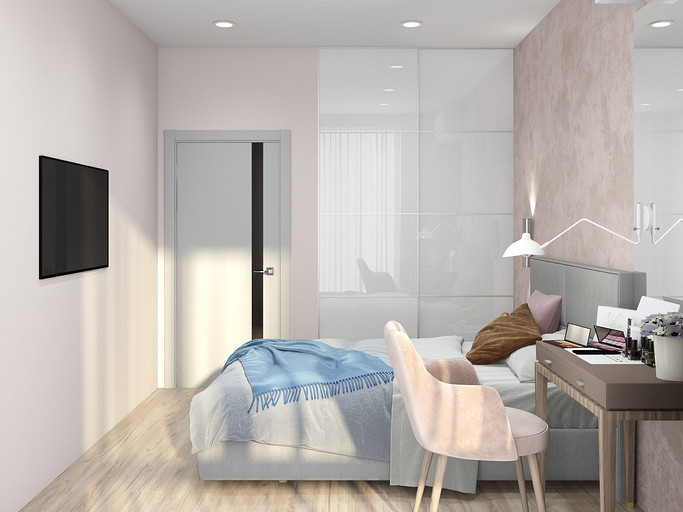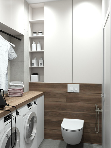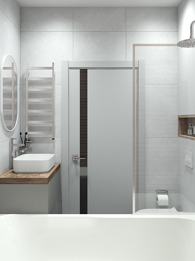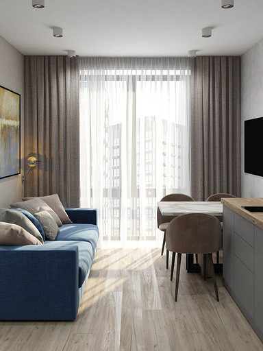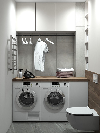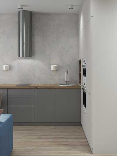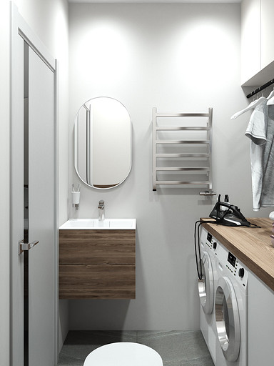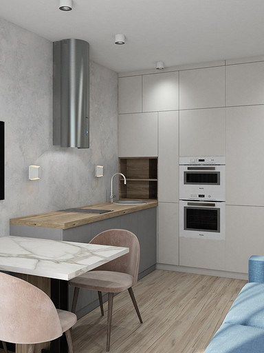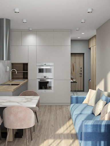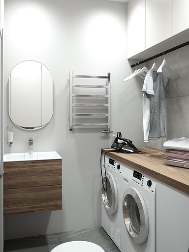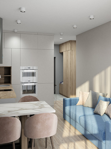 Современный дизайн для семьи с подростком. Дизайн выполнен преимущественно в светлых тонах, с небольшими яркими акцентами. Кухня в квартире не очень большого размера и чтобы визуально кухня-гостиная казалась больше было принято решение делать кухню без верха. В квартире небольшие санузлы, но благодаря грамотной планировке во втором санузле разместилась зона постирочной.