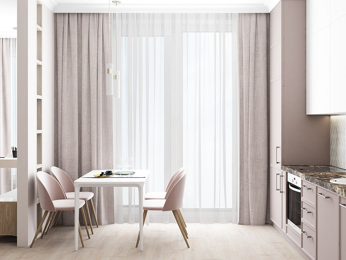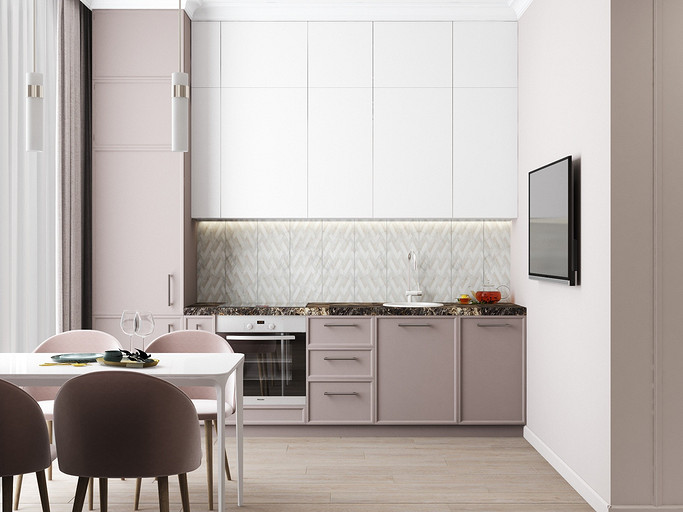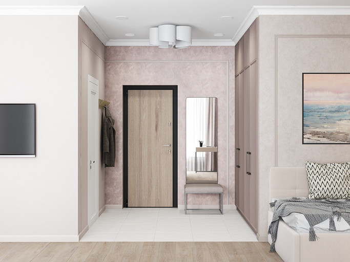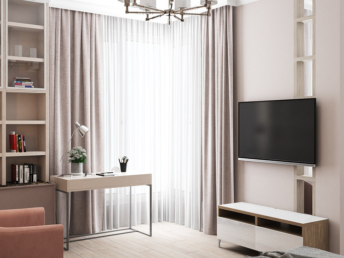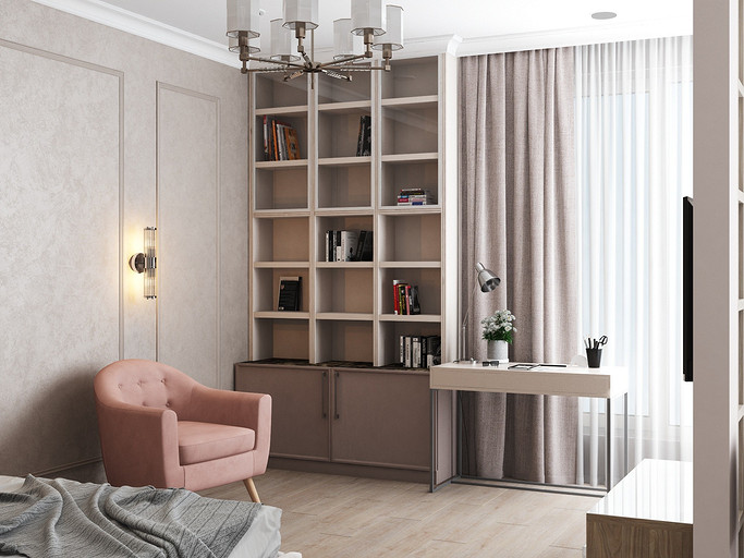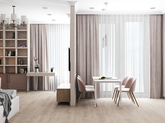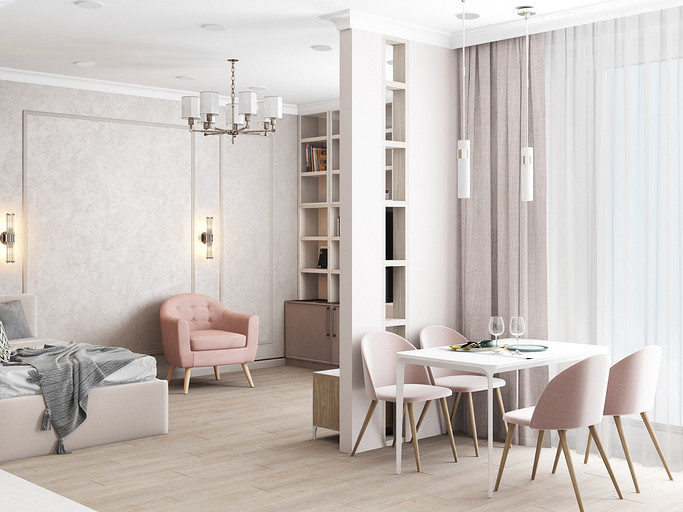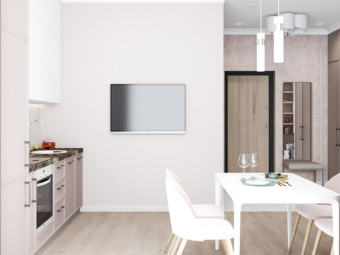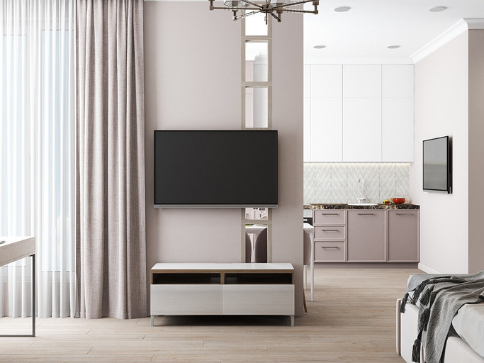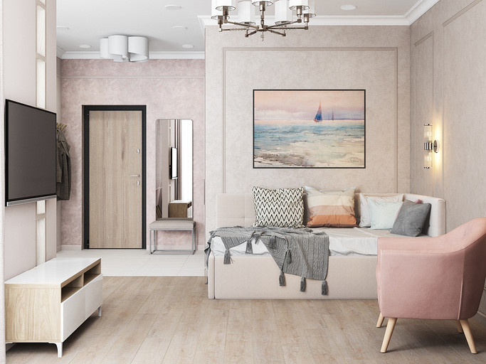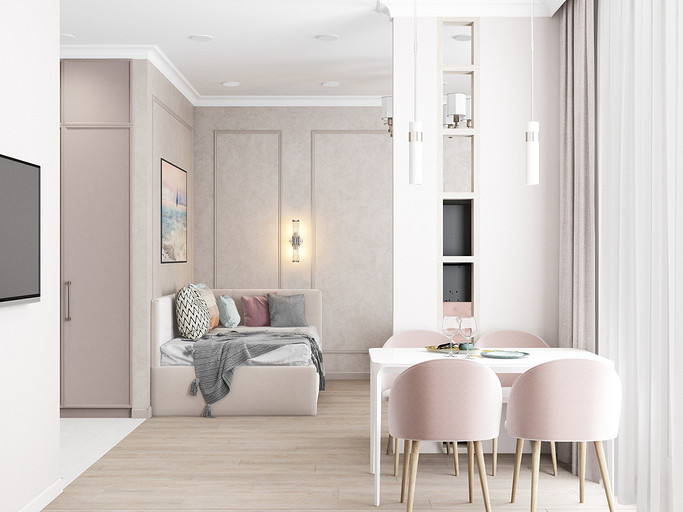 Дизайн в светлых тонах, однокомнатная квартира переоборудованная в студию. Заказчиками были приобретены две квартиры рядом, одна для себя, вторая небольшая квартира для мамы. Дизайн выполнен в стиле современная классика, квартира получилась уютная и просторная, нет нагромождения шкафов и лишней мебели.
