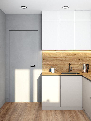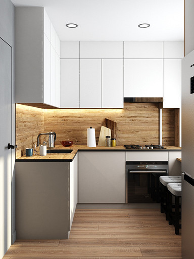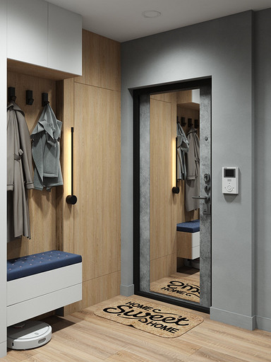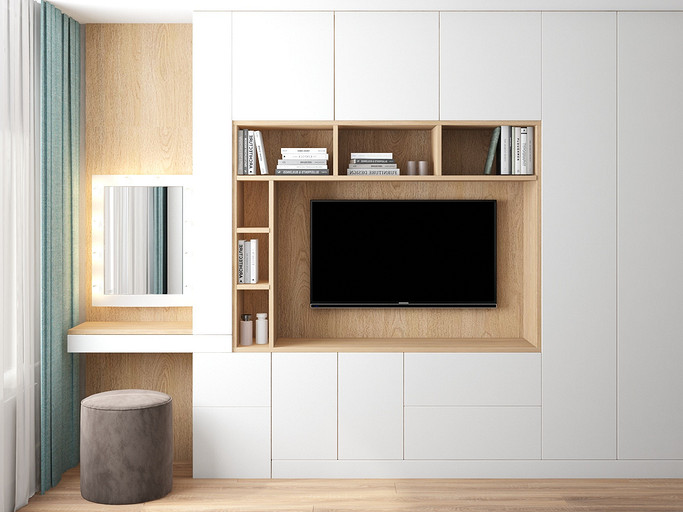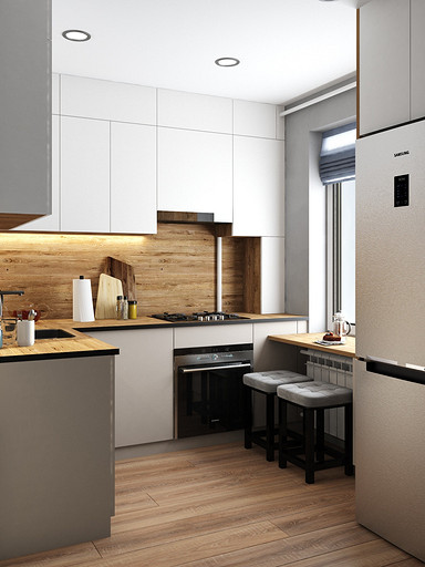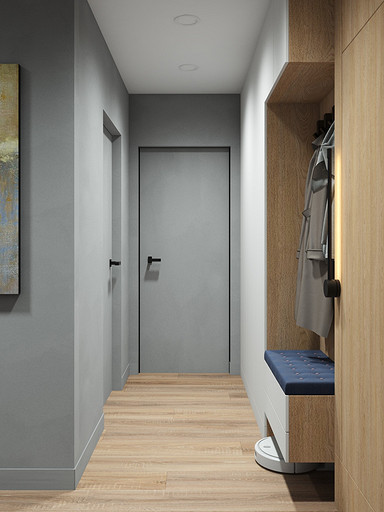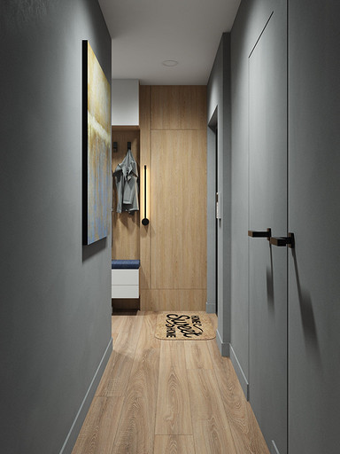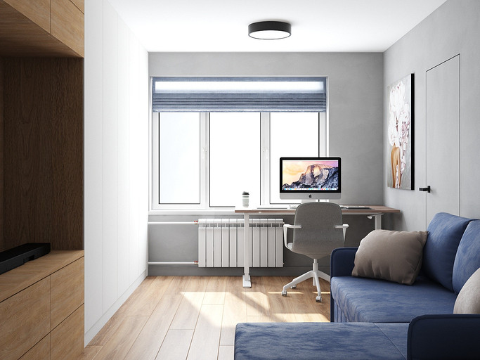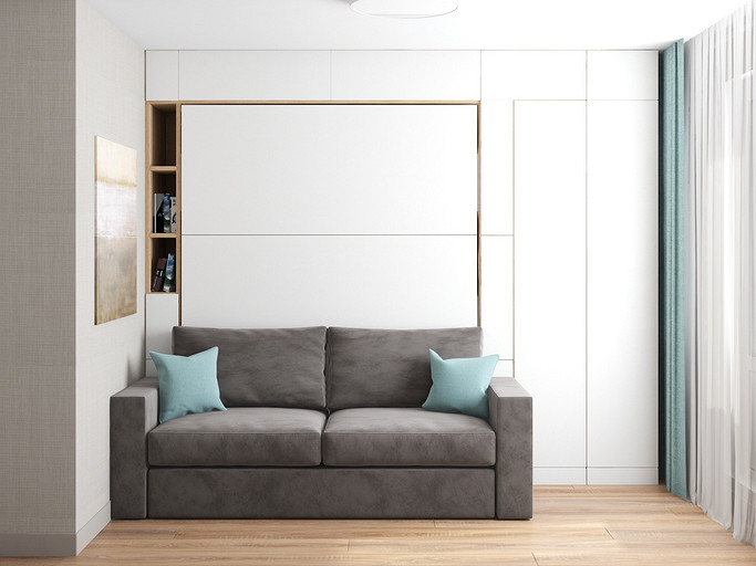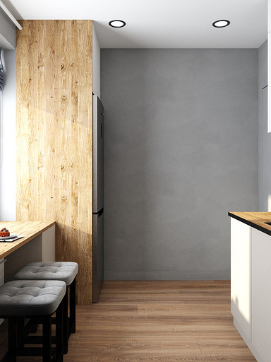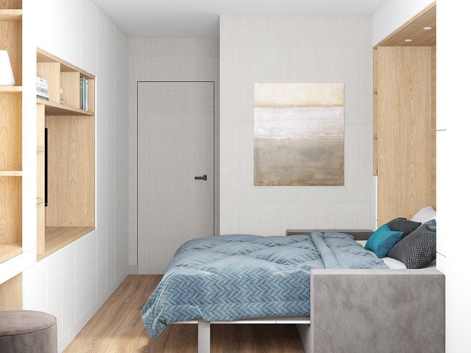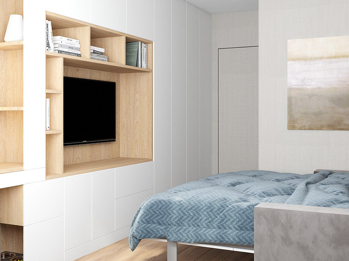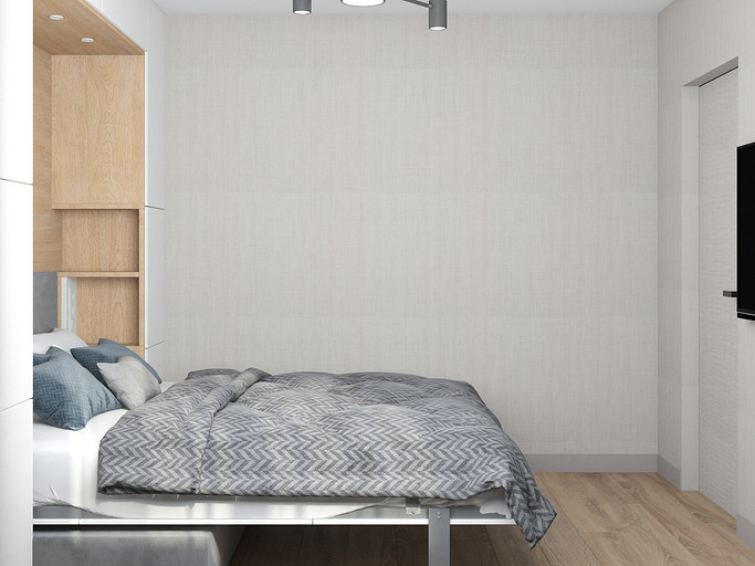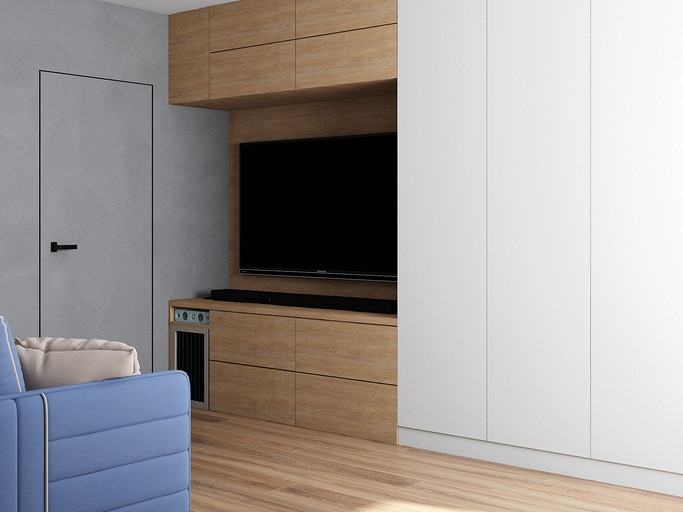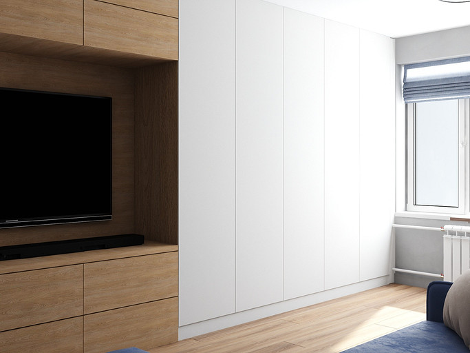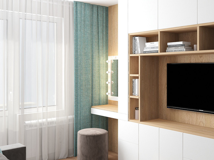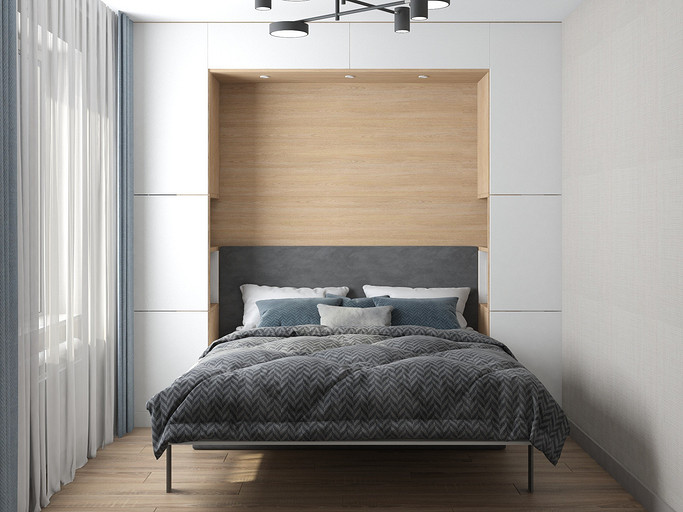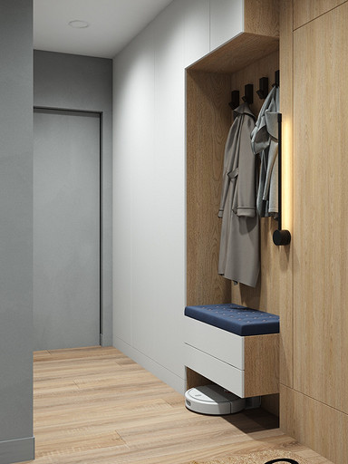 Квартира для семейной пары, мамы и двух собачек. Дизайн выполнен в минималистичном стиле в светлых тонах с использованием дерева. Квартира получилась очень функциональный, в небольшой кухне разместилась вся необходимая техника. В обоих спальнях решено было использовать диван-кровать трансформер для экономии пространства, так как необходимо довольного много мест хранения.