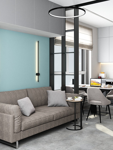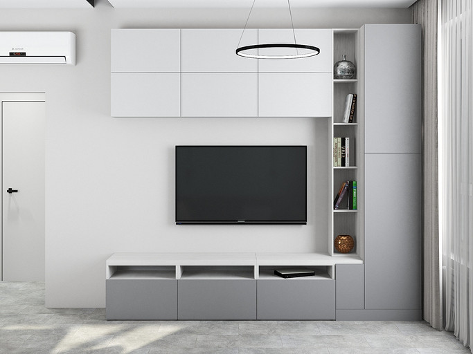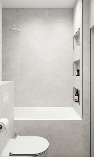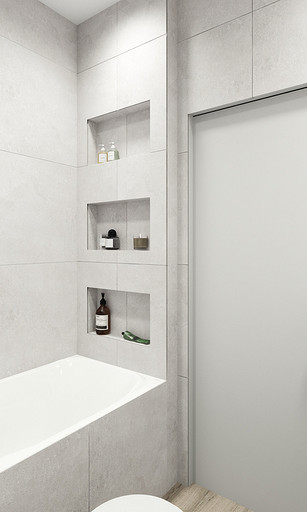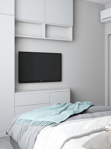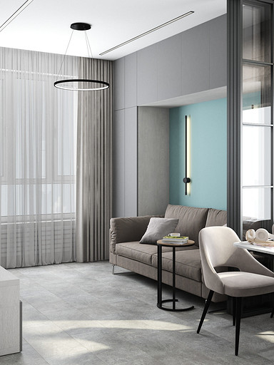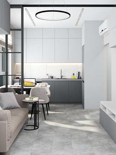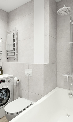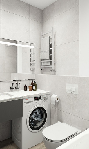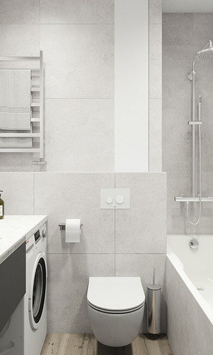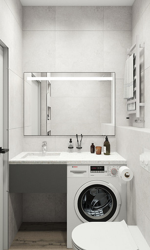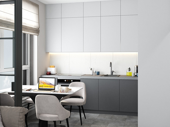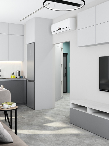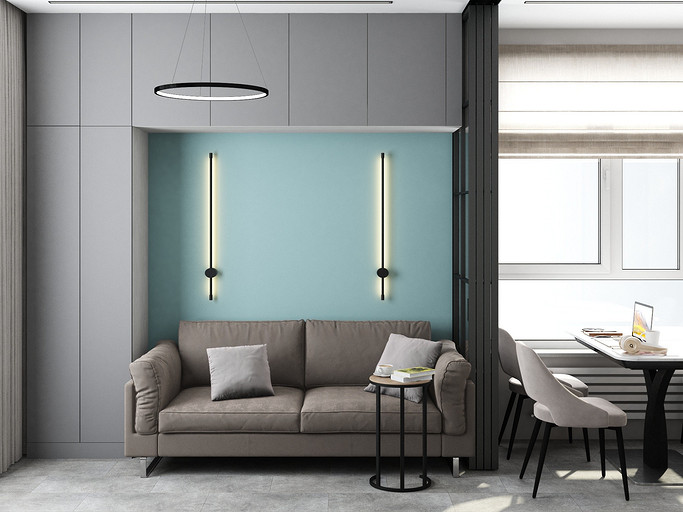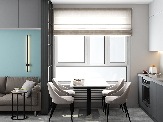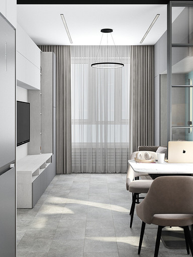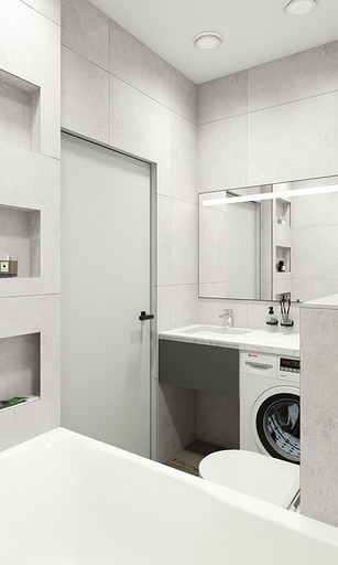 Небольшая квартира в стиле минимализм. Дизайн выполнен в светлой цветовой гамме, с небольшим добавлением акцентных оттенков. В квартире довольно небольшой санузел , благодаря грамотной расстановке мебели удалось вместить все необходимое. В кухне-гостиной сделано зонирование стеклянной перегородкой. В квартире несмотря на небольшие габариты, удалось уместить довольно много мест хранения.